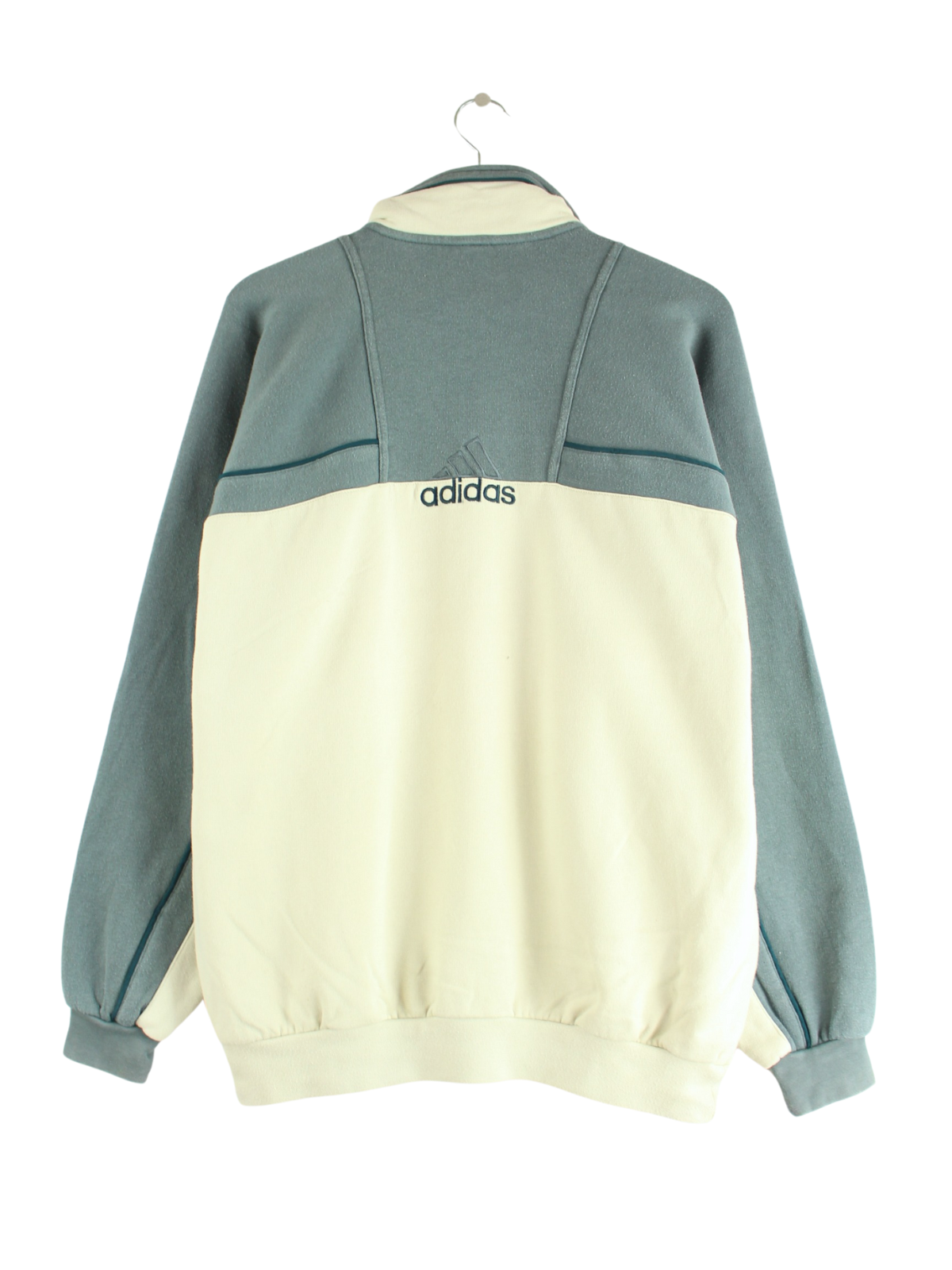 Beige sweater with embroidery and half zip from the Adidas label from the 90's in size L. It is made of a cotton blend and is available from us in good condition.