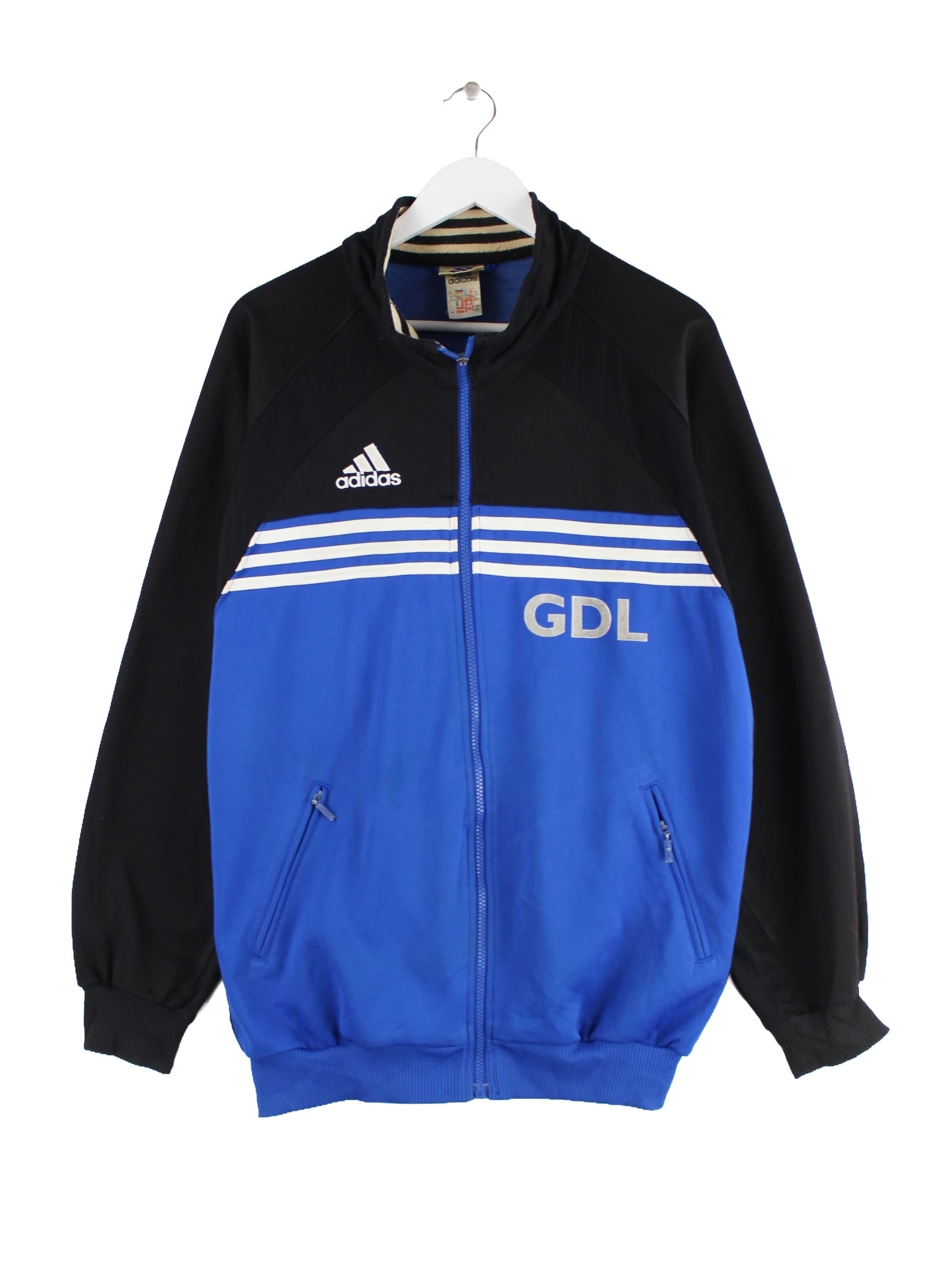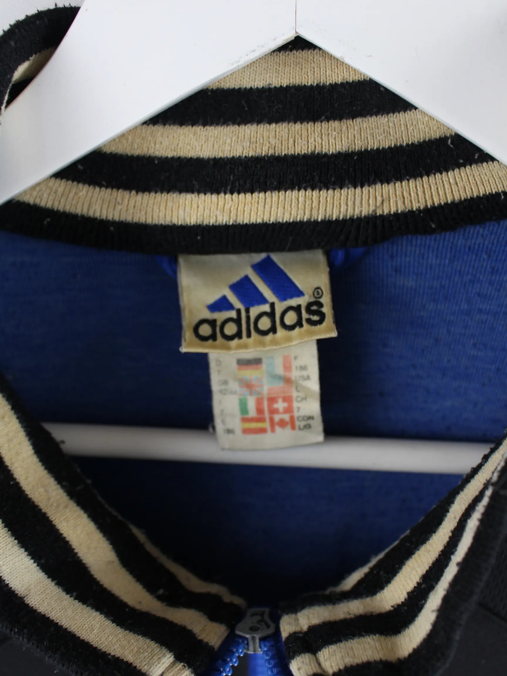 Trainingsjacke der Marke Adidas in Größe L aus den 90'ern. Sie ist aus Synthetik gemacht und in Blau im Angebot. Mit chiquem Vintage Print.