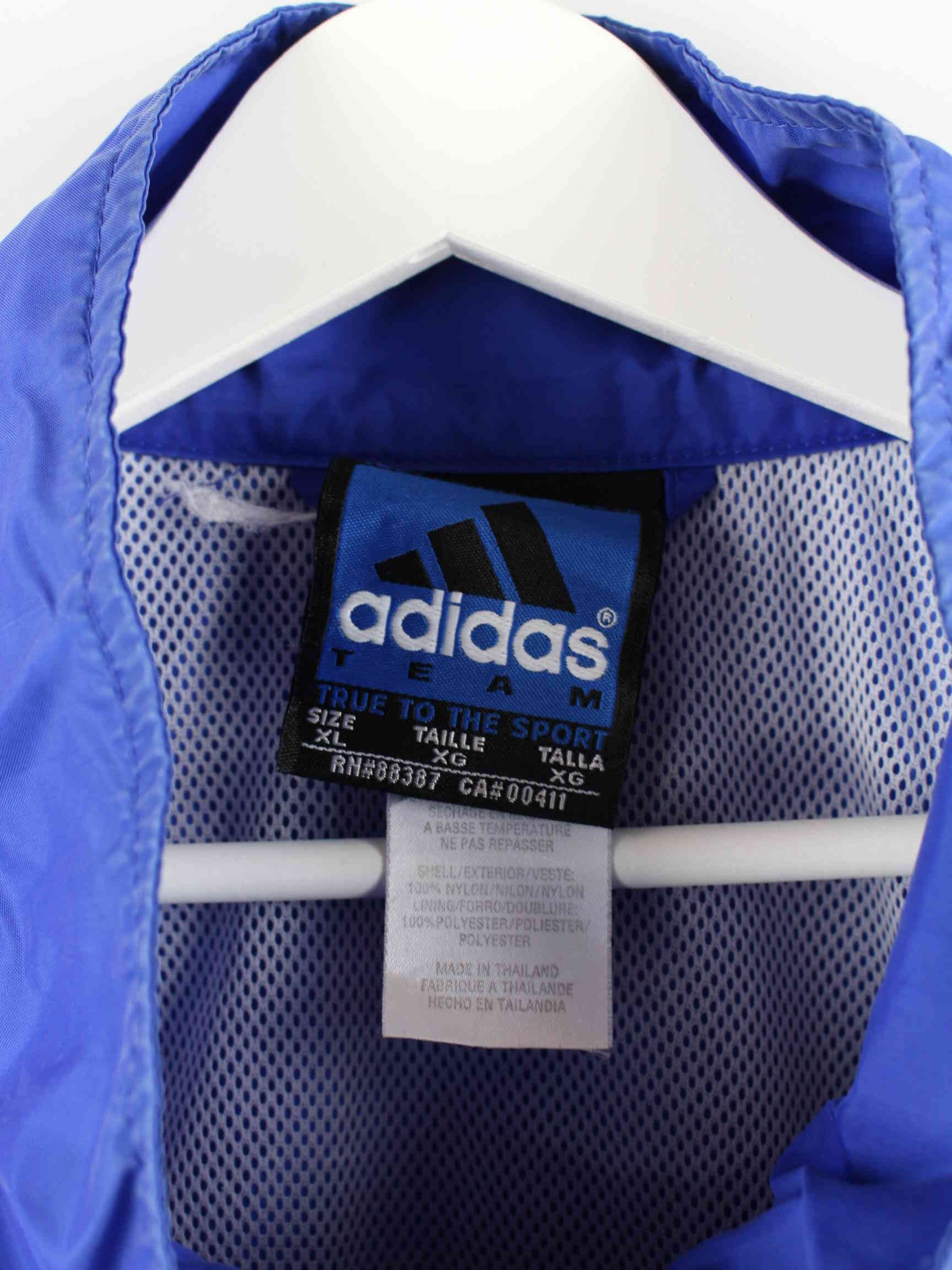 Blue training jacket from Adidas from the 90's in size XXL. It is made of synthetic material and is in good condition in stock.