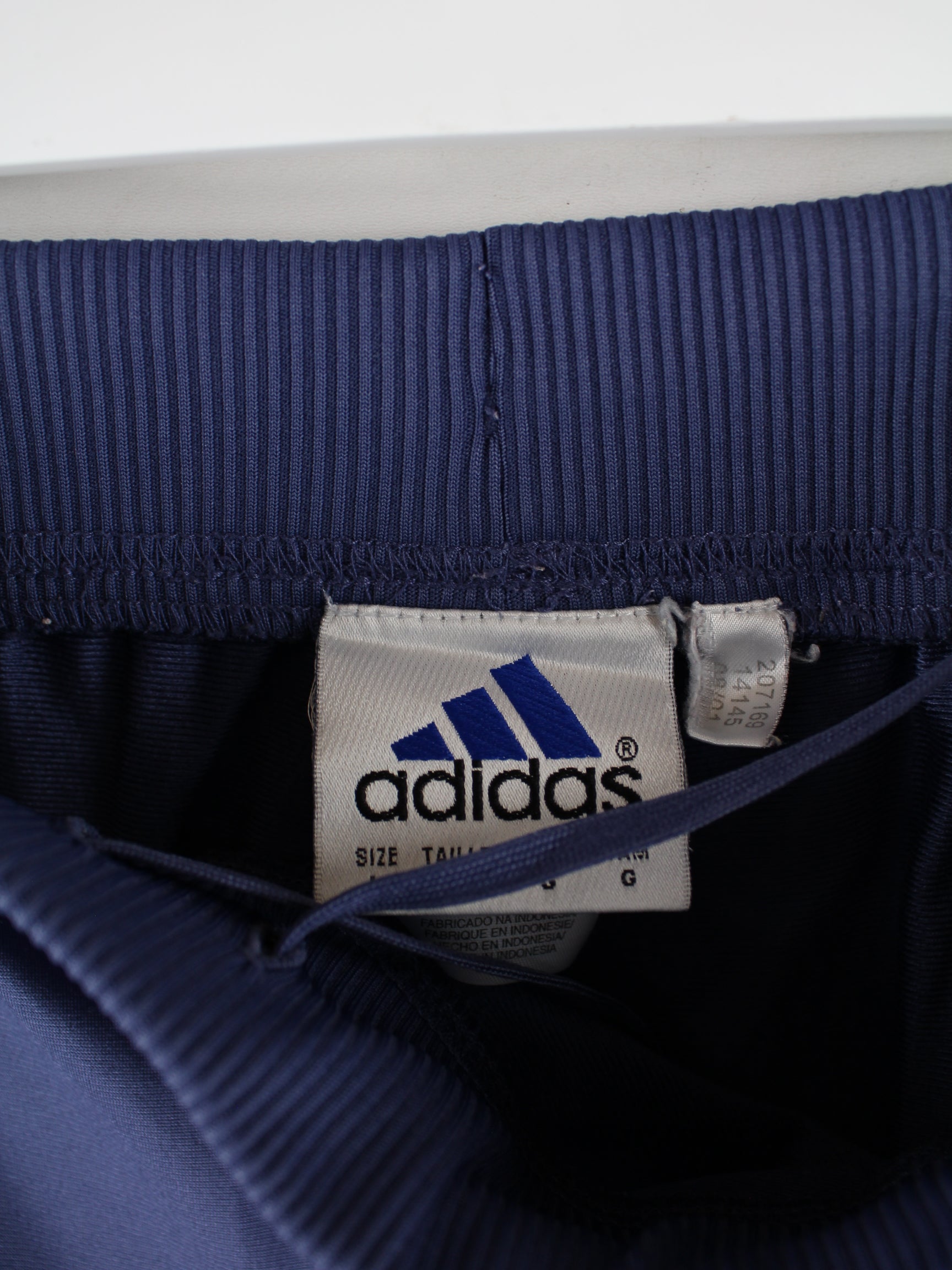 Track pants from the Adidas label in size L from the 90's. They are made of synthetic material and are in stock in blue.