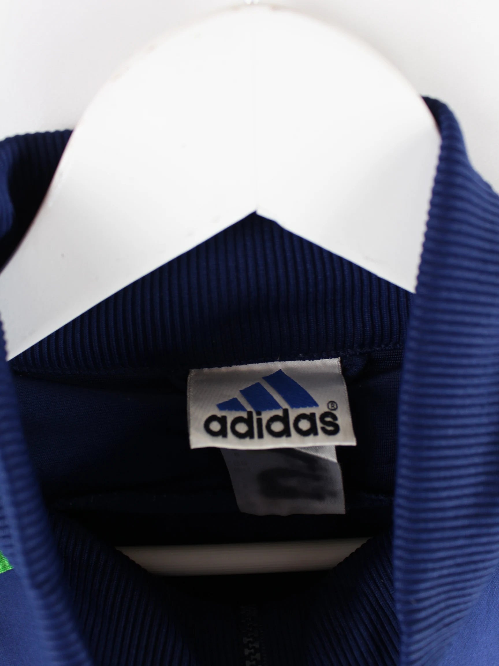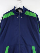 Trainingsjacke der Brand Adidas in Größe L aus den 90'ern. Sie ist aus Synthetik gefertigt und in Blau bei uns vorrätig.