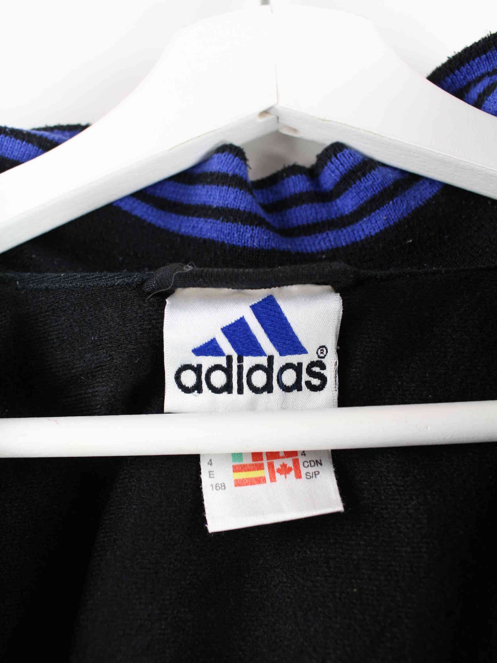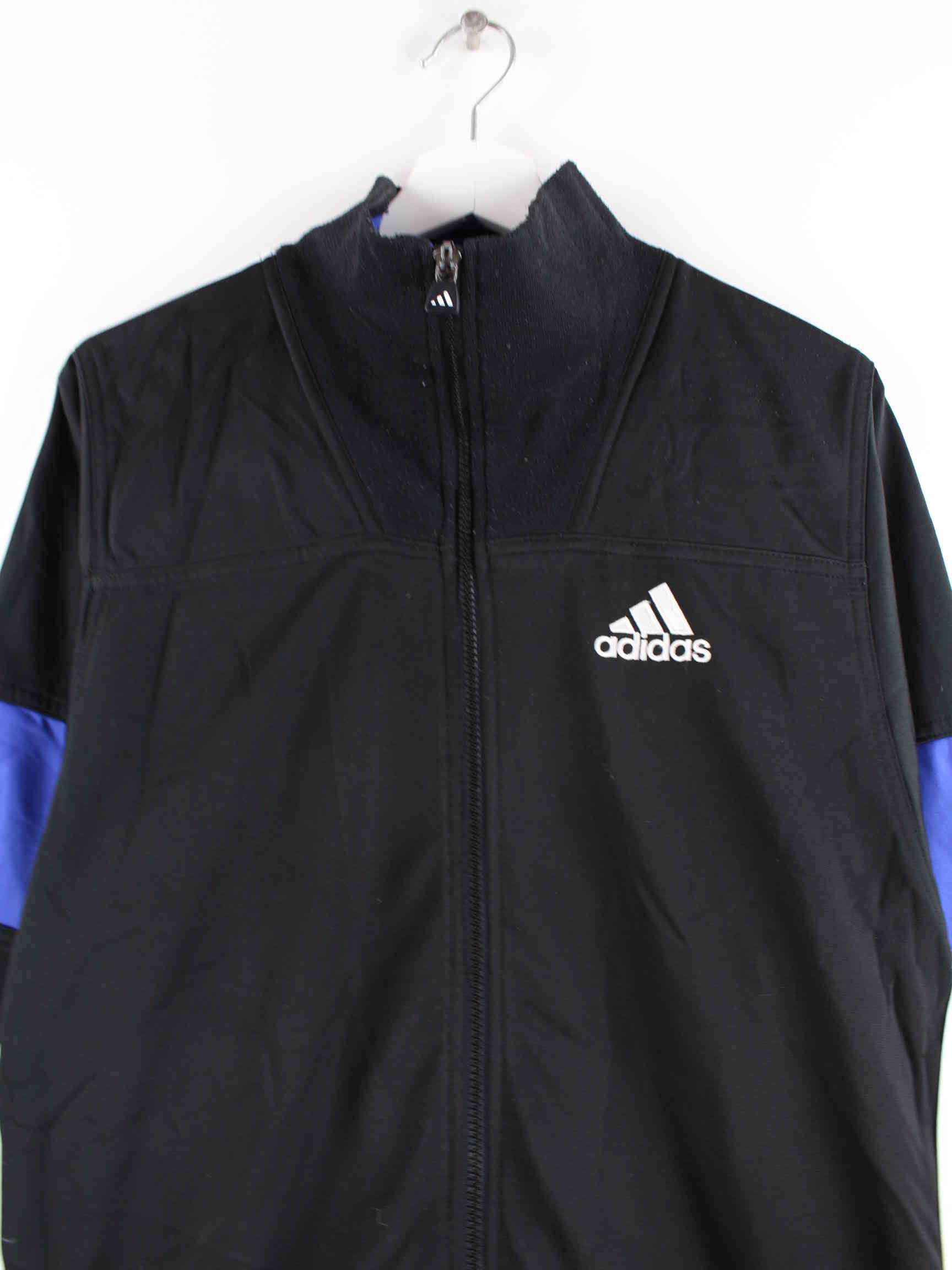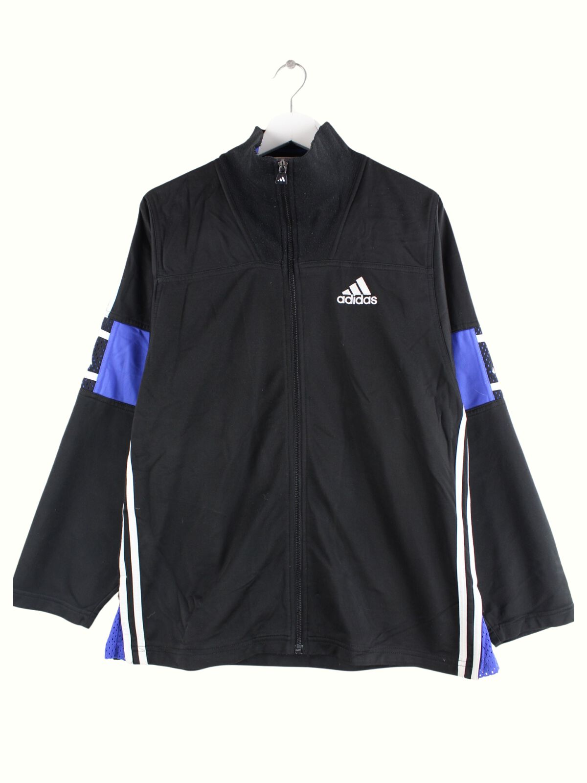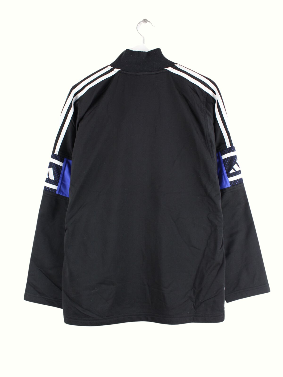 Black training jacket from the Adidas brand from the 90s in size L. It is made of synthetic material and is in stock in very good condition.