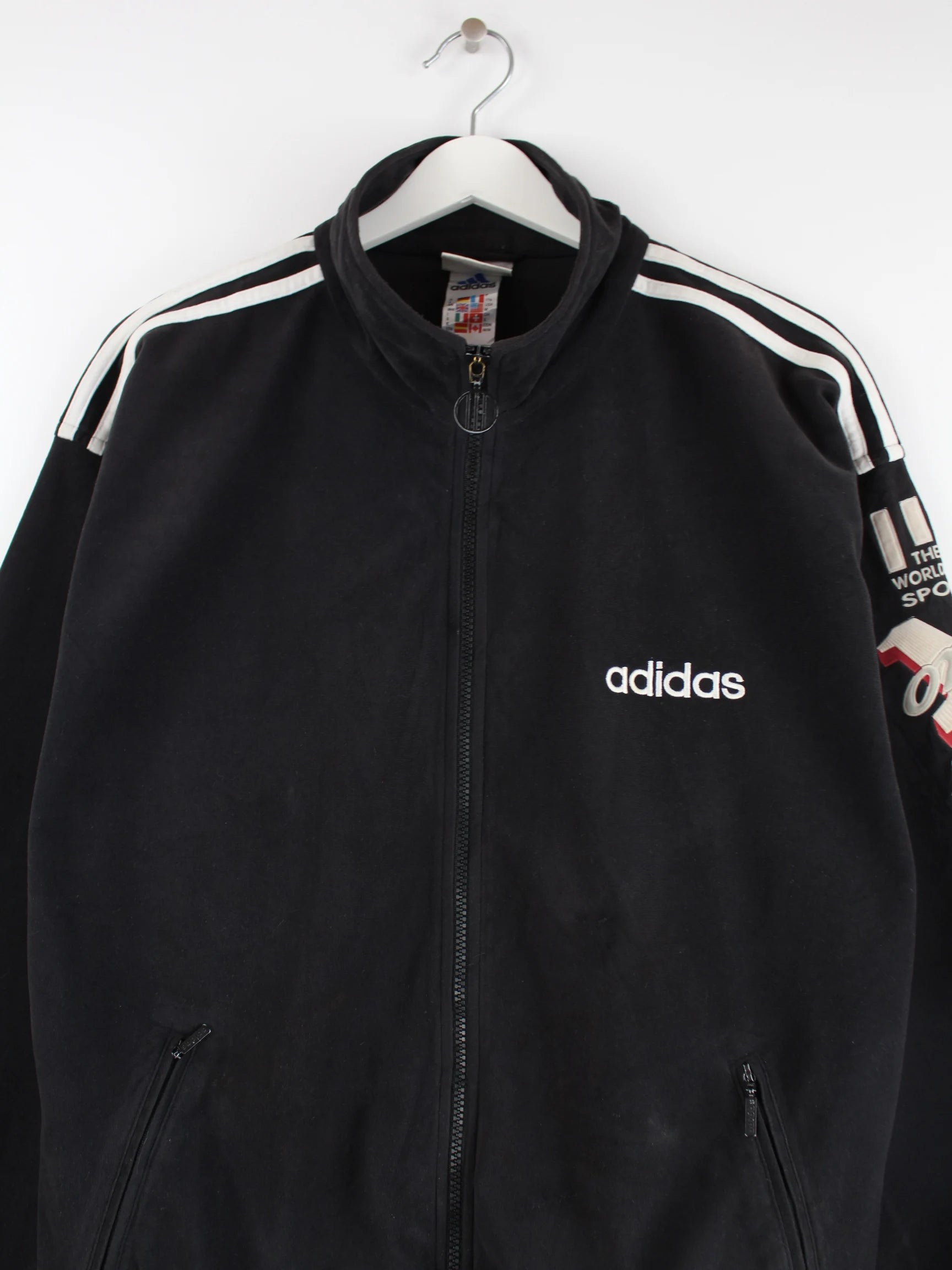Red training jacket from the Adidas label from the 90s in size L. It is made of synthetic material and is on offer in good condition.