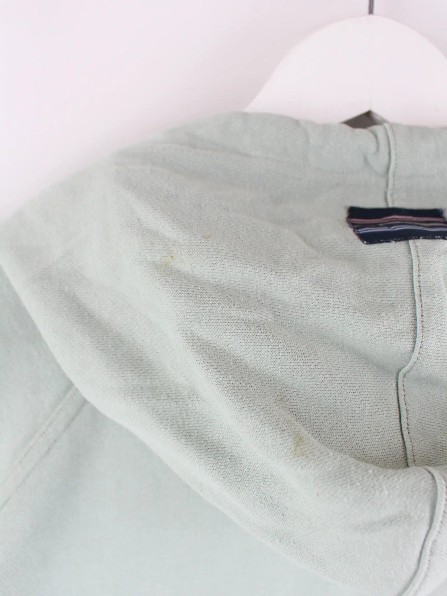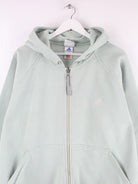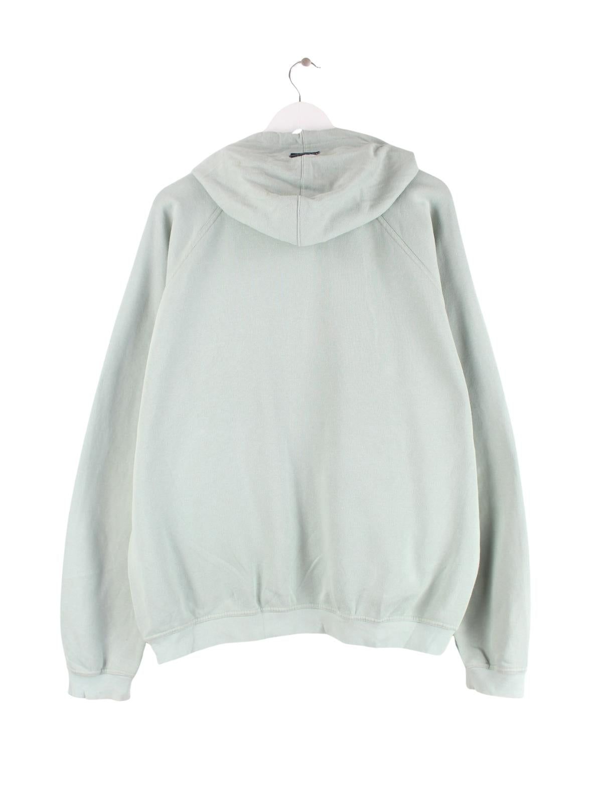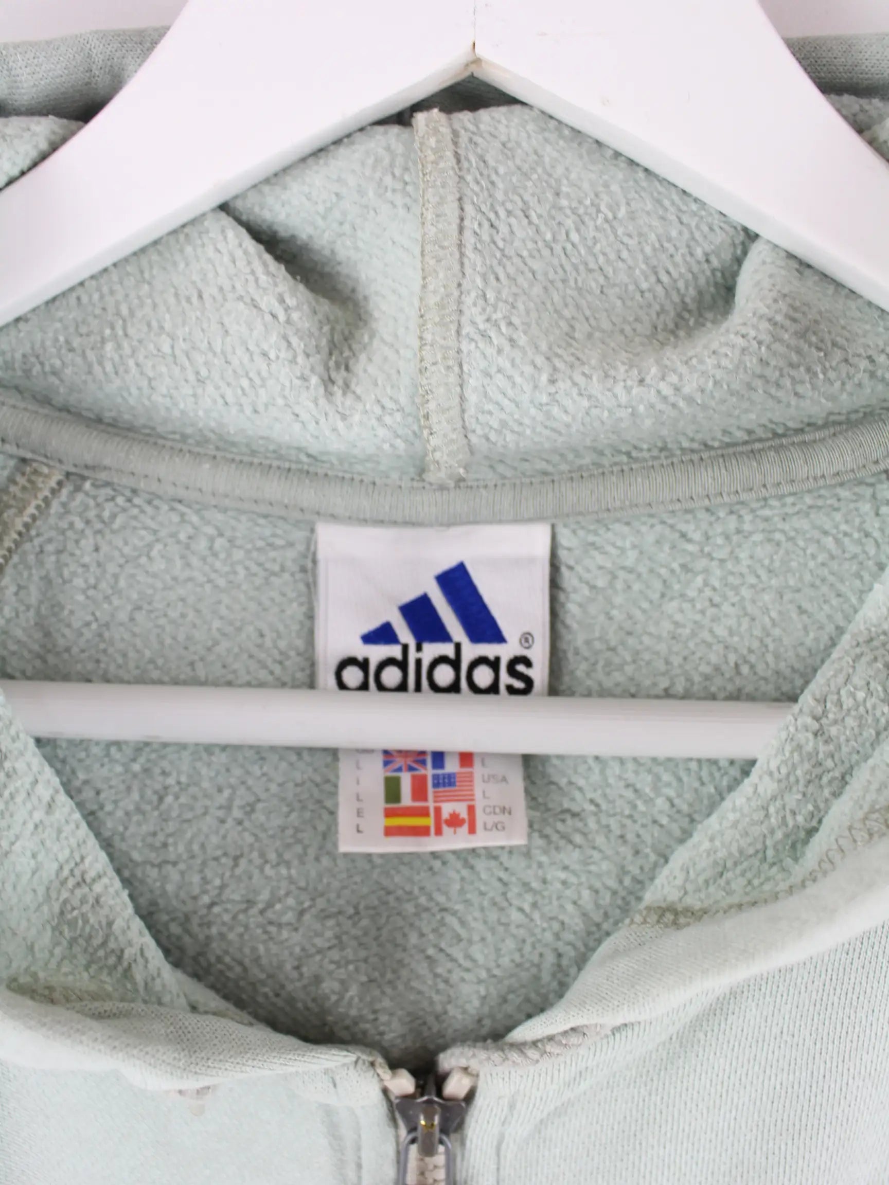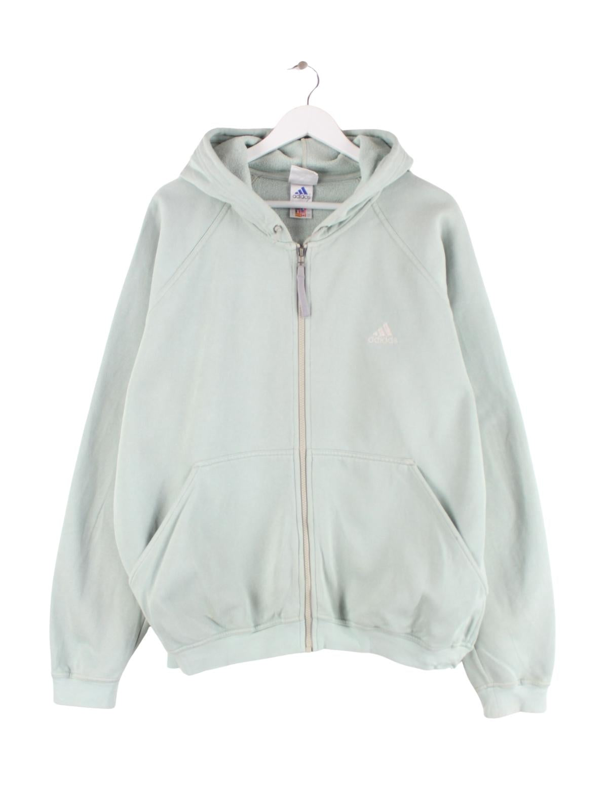 Blauer Hoodie mit durchgehendem Reißverschluß von Adidas aus den 90'ern in Größe L. Er ist aus einer Baumwollmischung angefertigt und in gutem Zustand bei uns zu bekommen.