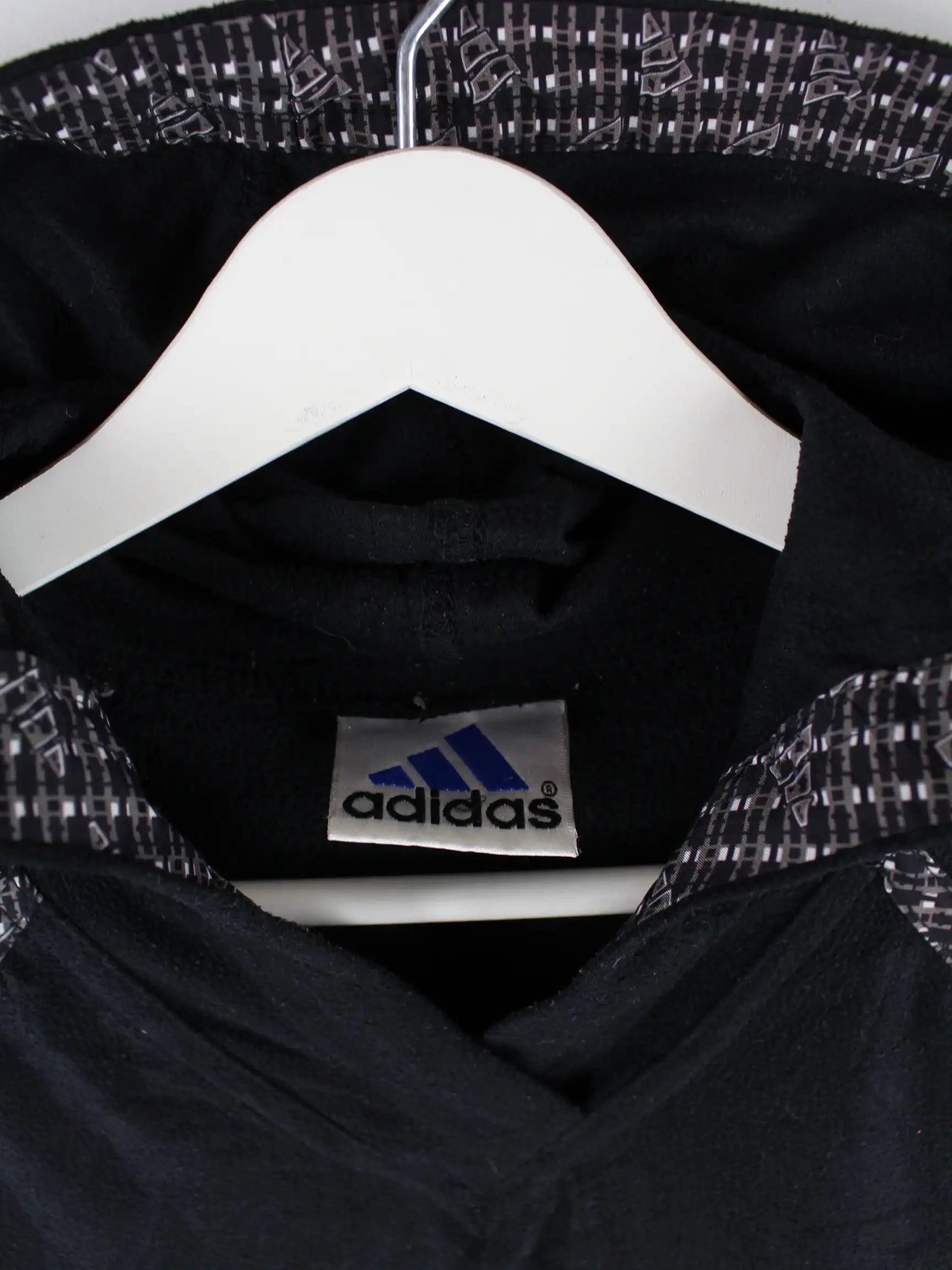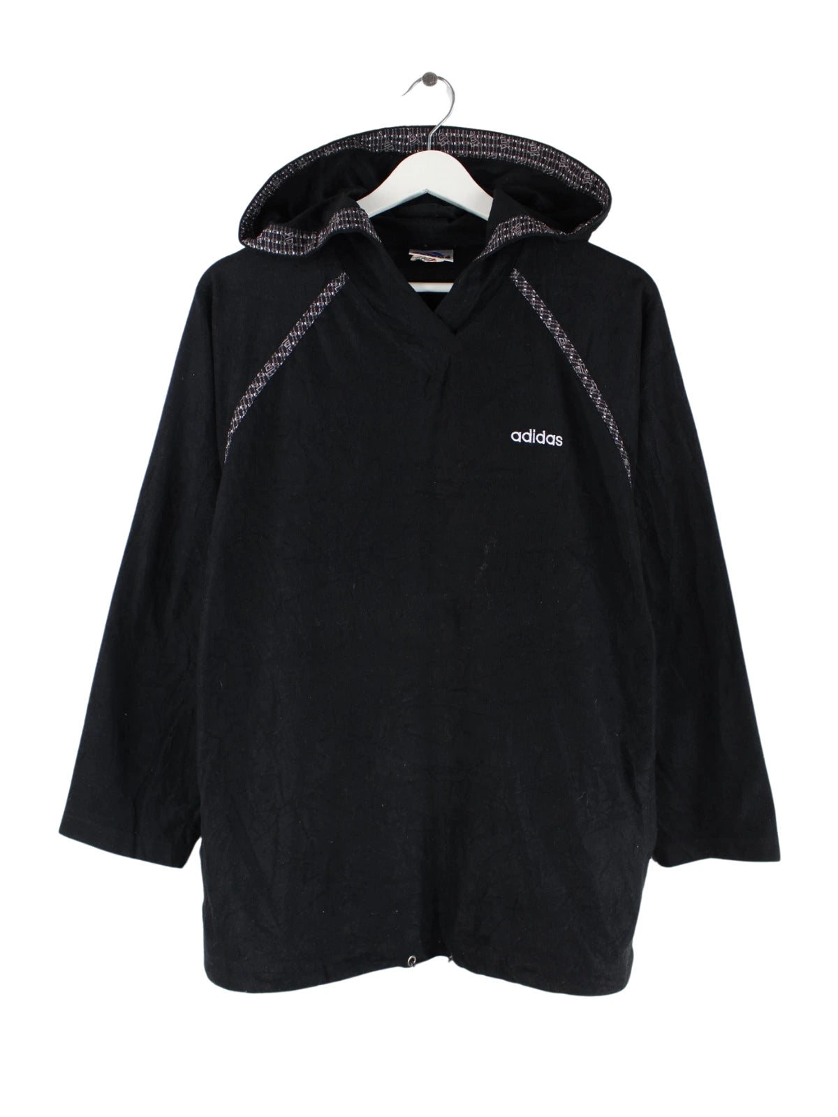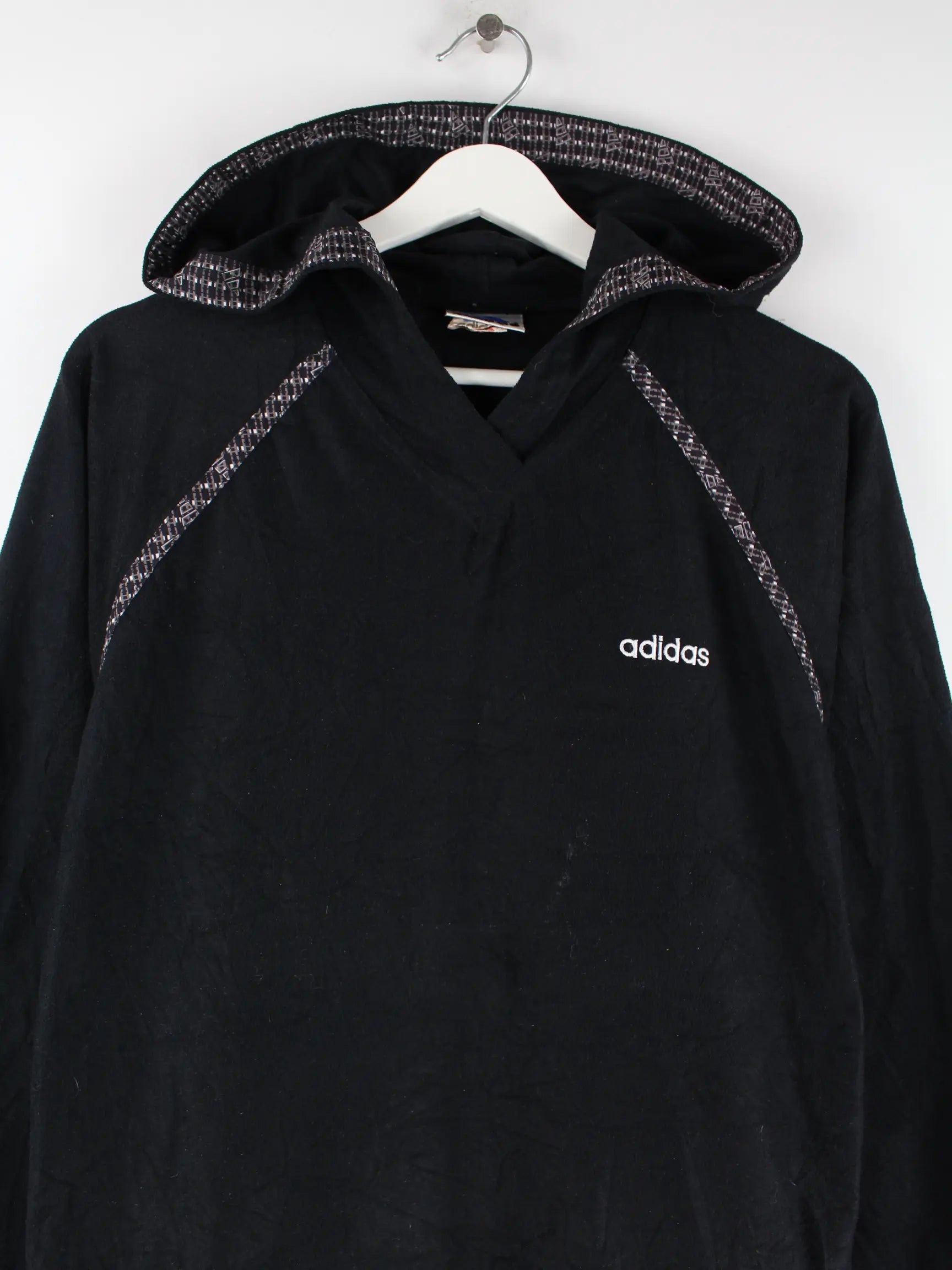 Schwarzer Hoodie des Labels Adidas aus den 90'ern in Größe M. Er ist aus kuscheligem Fleece gefertigt. Den Zustand würden wir als 'In Ordnung' bezeichnen (vergl. Bilder).