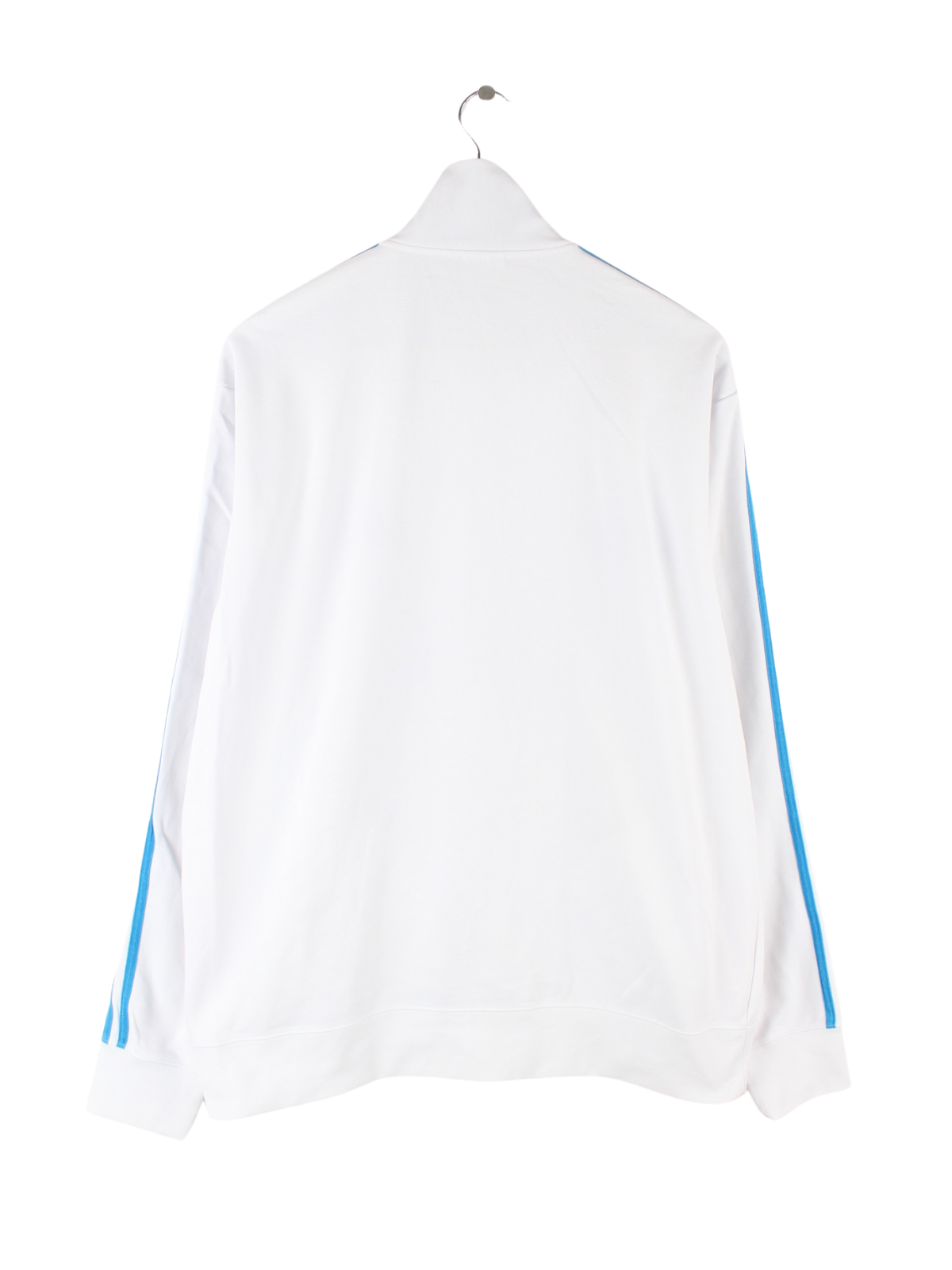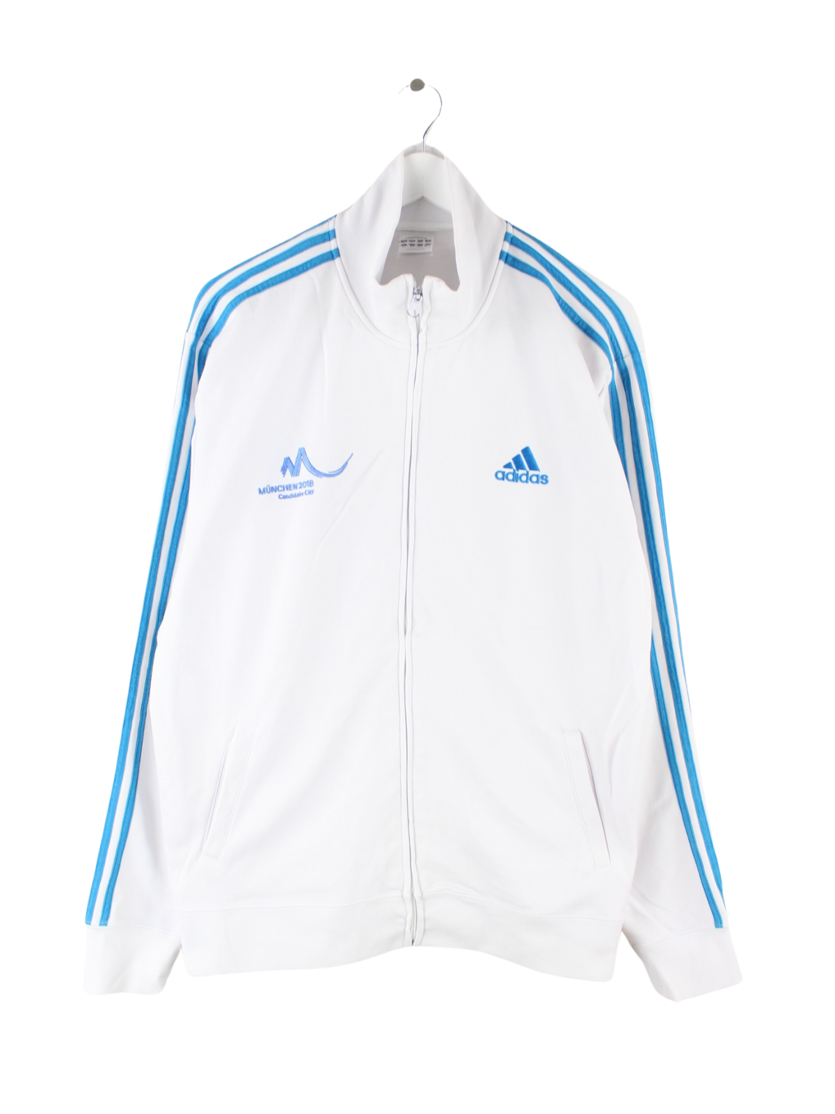 Weiße Trainingsjacke mit gesticktem Logo aus dem Hause Adidas in Größe XL. Sie ist aus Synthetik hergestellt und in sehr gutem Zustand bei uns vorrätig.