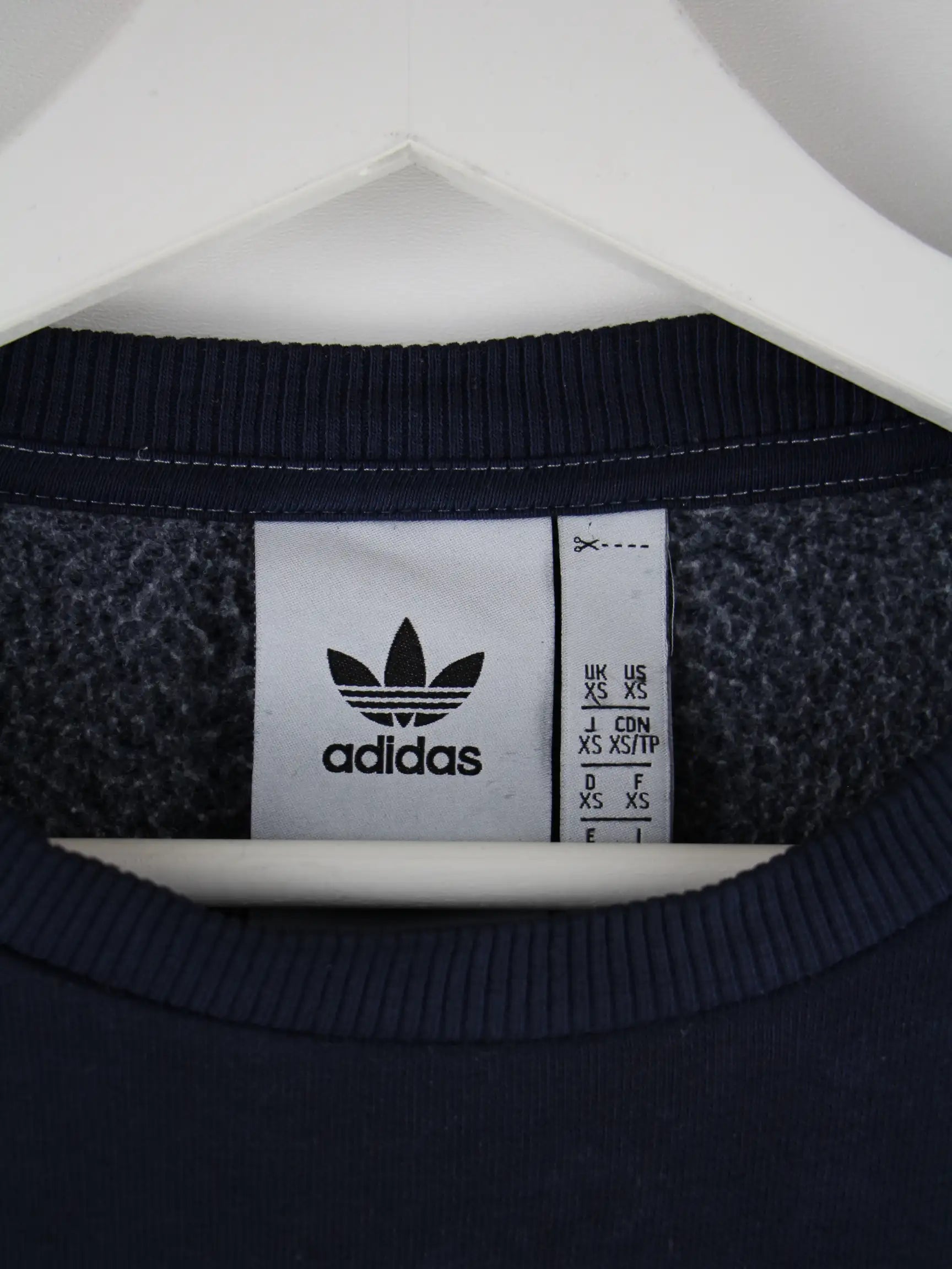 Blauer Sweater des Labels Adidas in Größe XS. Er ist aus einer Baumwollmischung angefertigt und in sehr gutem Zustand bei uns zu bekommen.