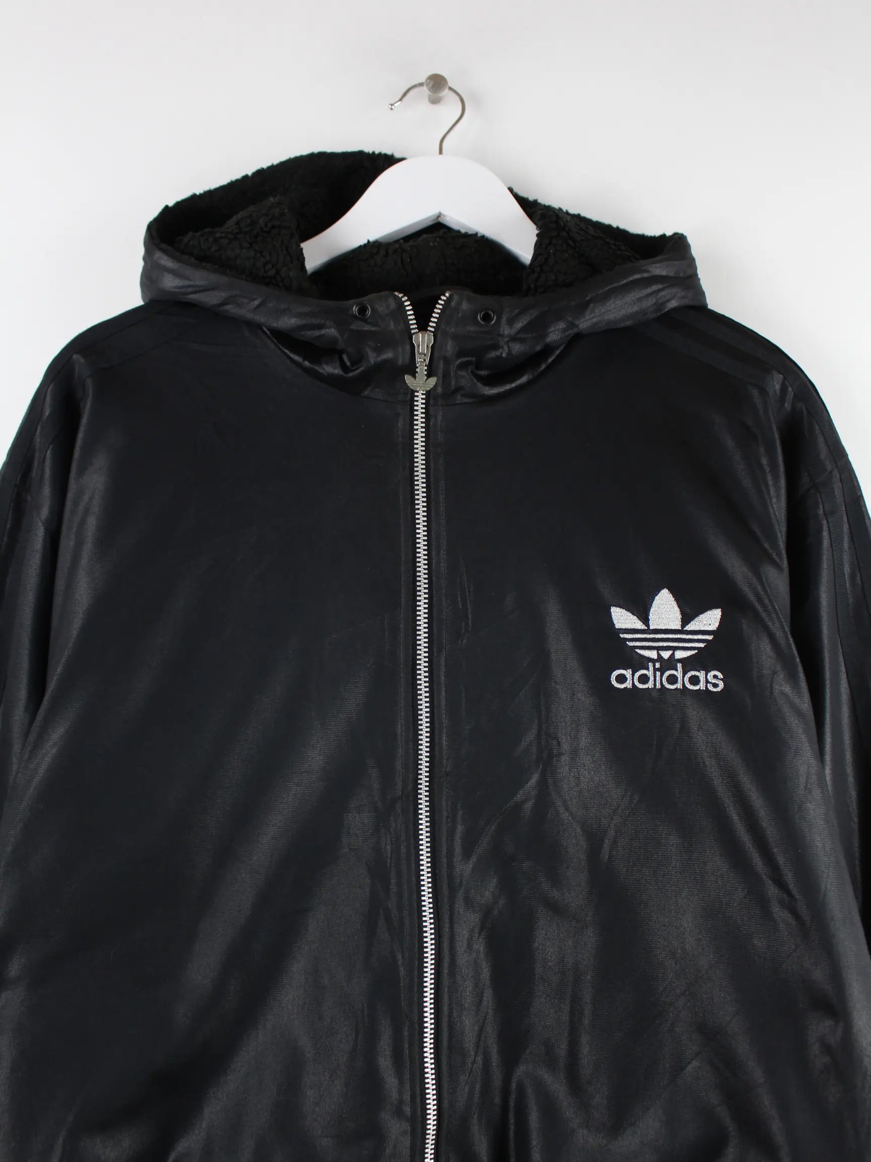 Schwarze Jacke vom Brand Adidas aus Anfang der 2000'er in Größe XL. Sie ist aus Synthetik angefertigt und in gutem Zustand im Bestand.