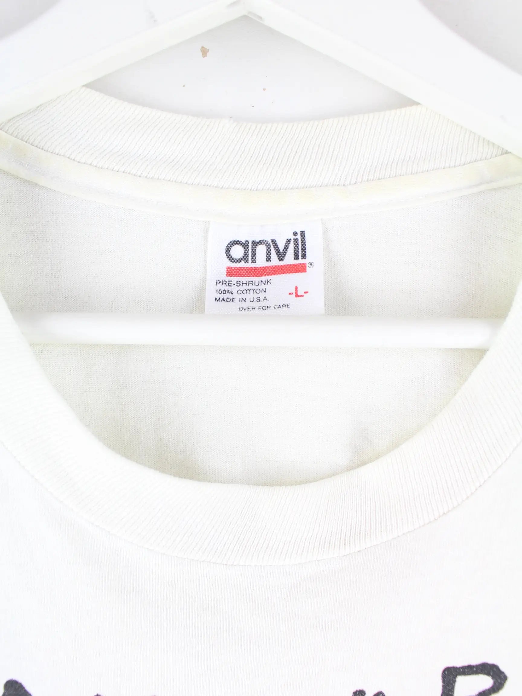 T-Shirt der Marke Anvil in Größe L aus den 90'ern. Es ist aus Baumwolle hergestellt und in Weiß zu haben.