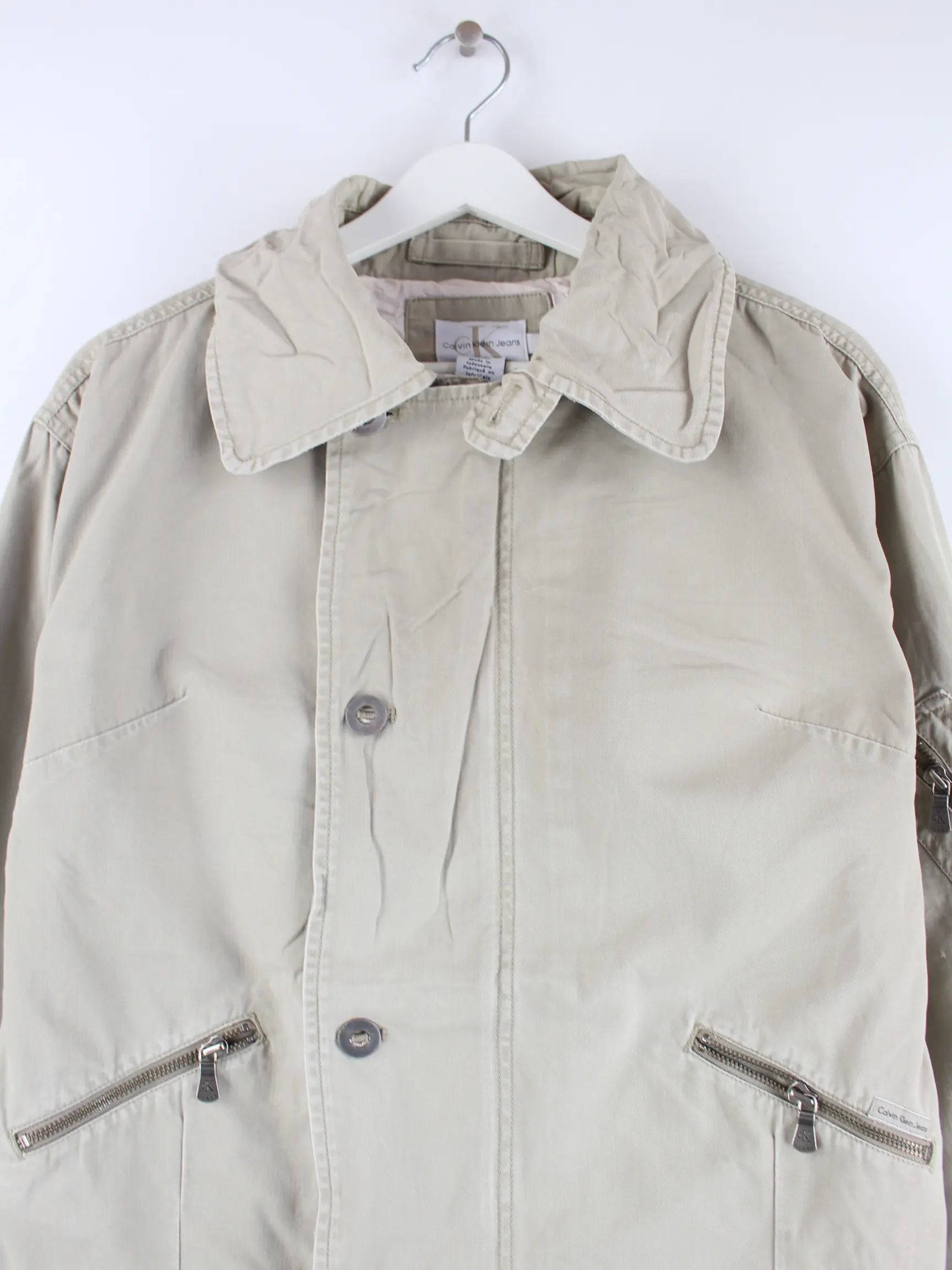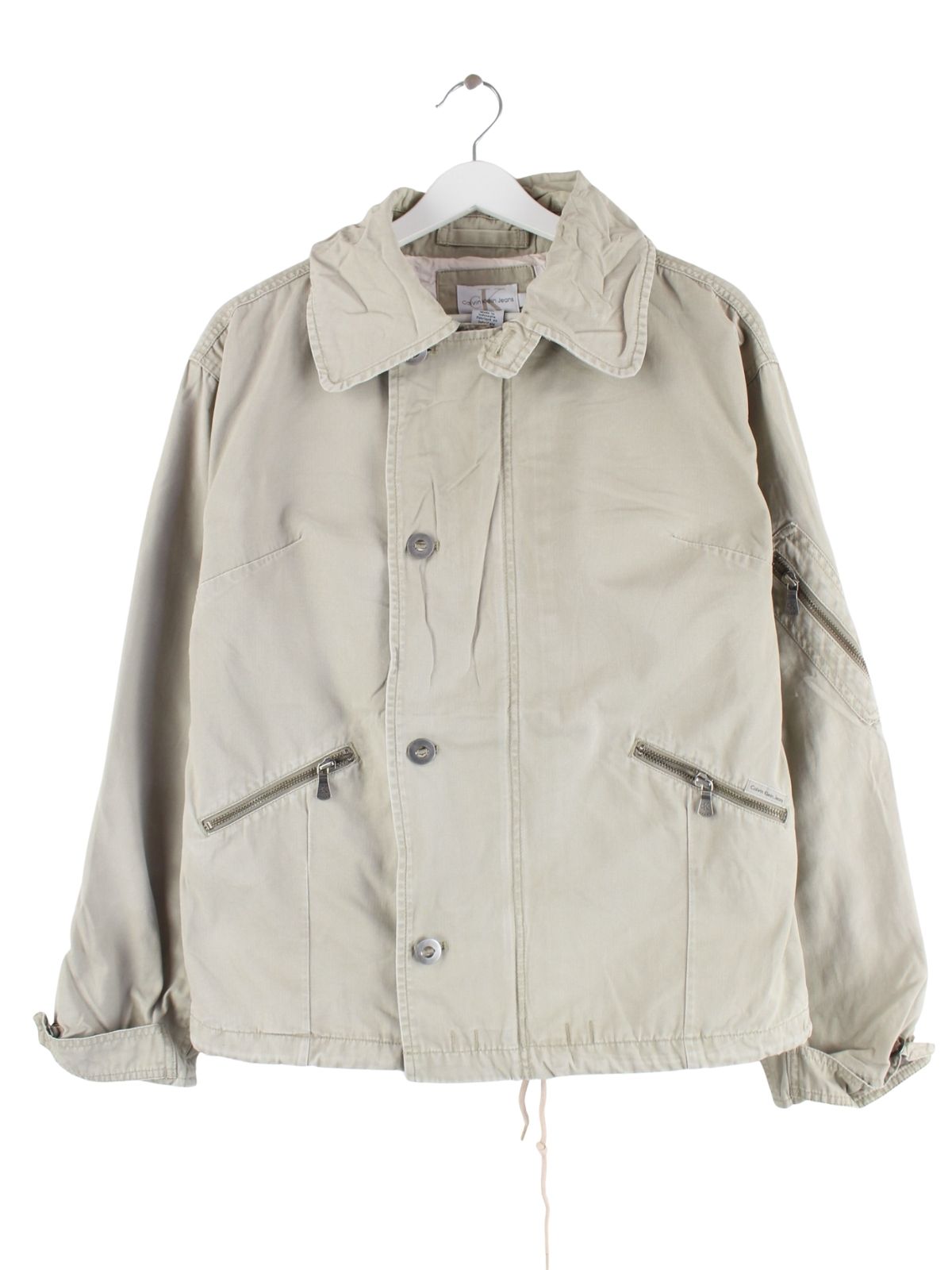 Leichte Jacke von Calvin Klein in Größe M aus den 90'ern. Sie ist aus Baumwolle gemacht und in Beige bei uns vorrätig.