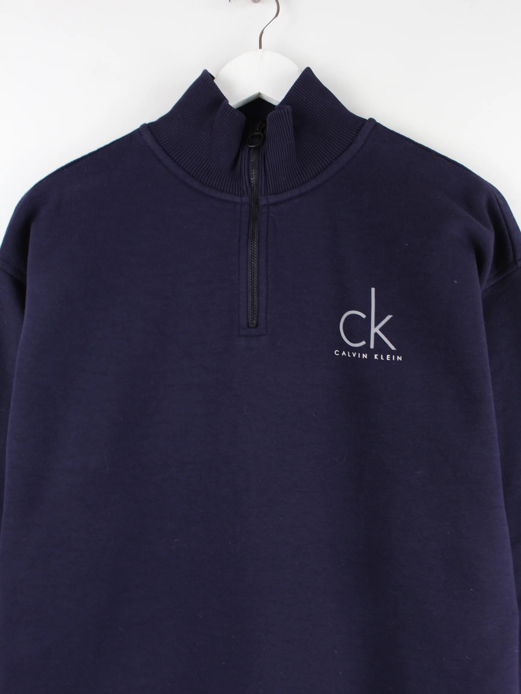 Sweater aus dem Hause Calvin Klein mit kurzem Reißverschluß in Größe S. Er ist aus einer Baumwollmischung produziert und in Blau vorrätig. Mit tollem undefined Print.