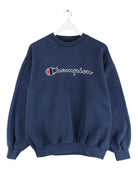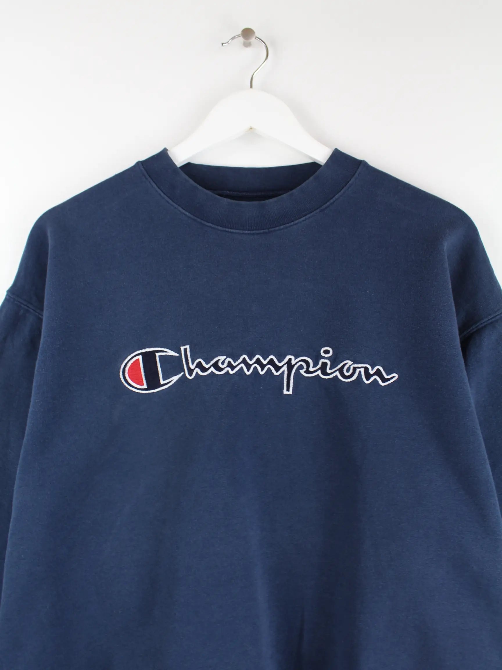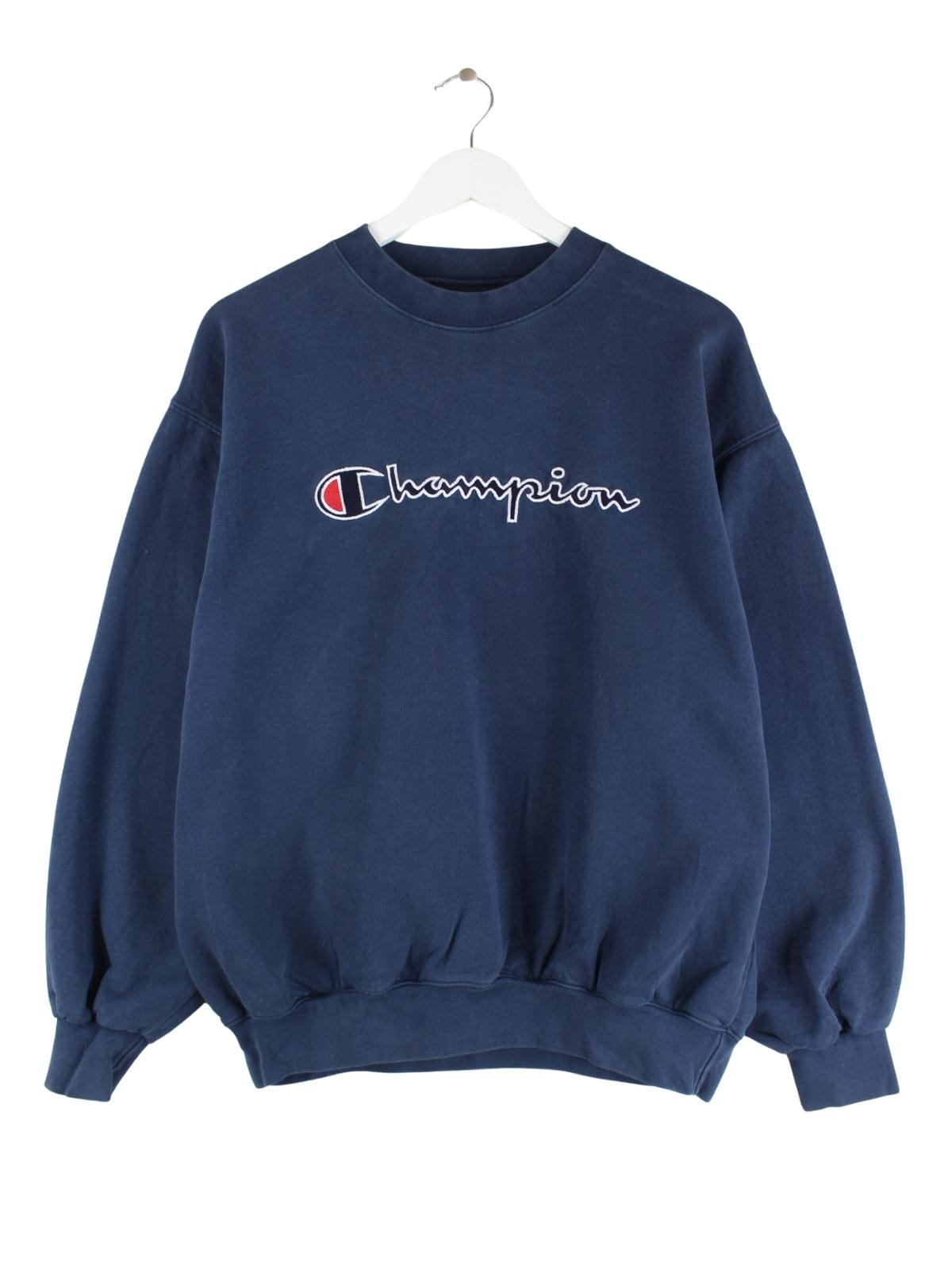 Blauer Sweater von Champion in Größe L. Er ist aus einer Baumwollmischung produziert und in sehr gutem Zustand in Stock.