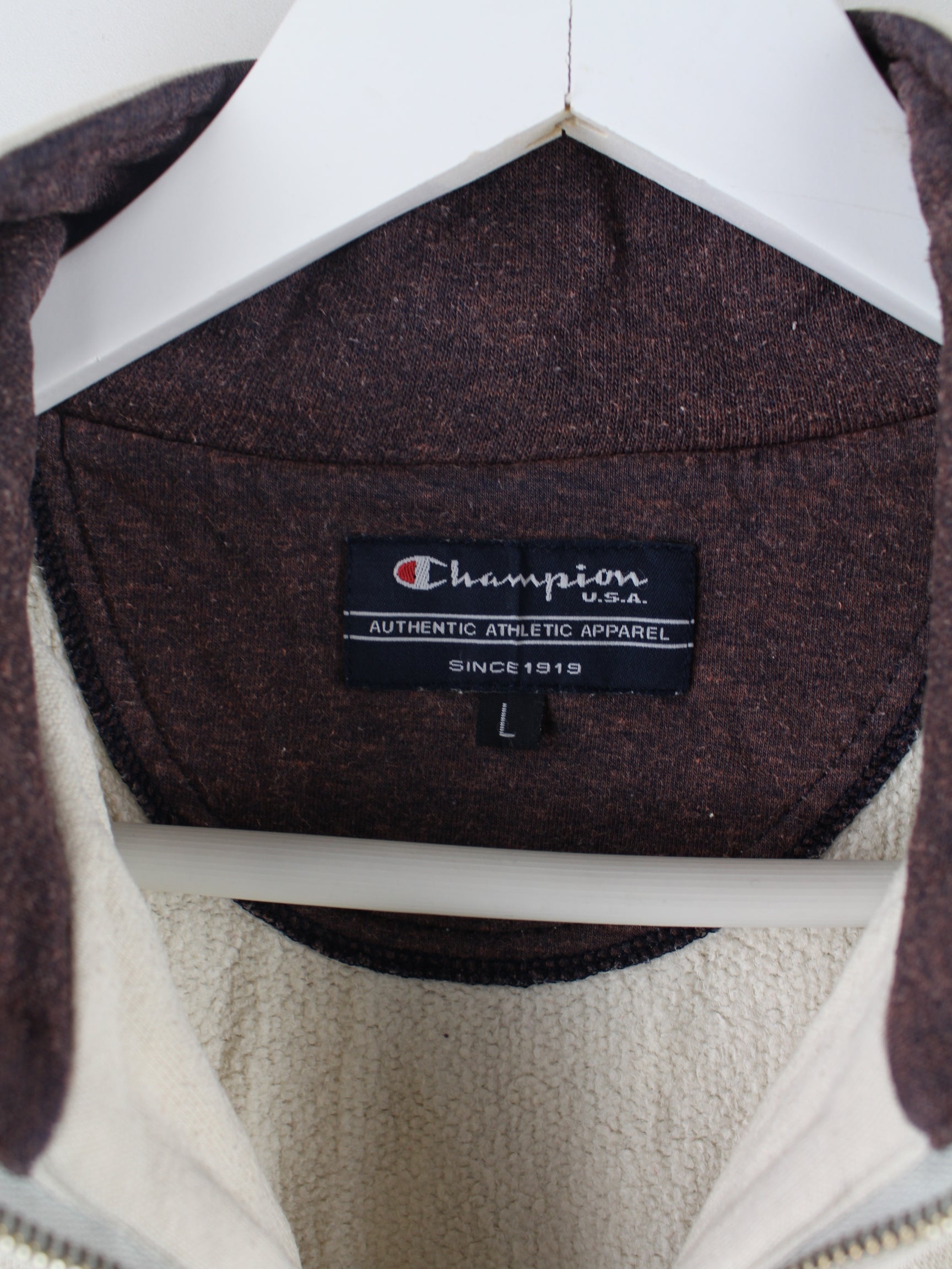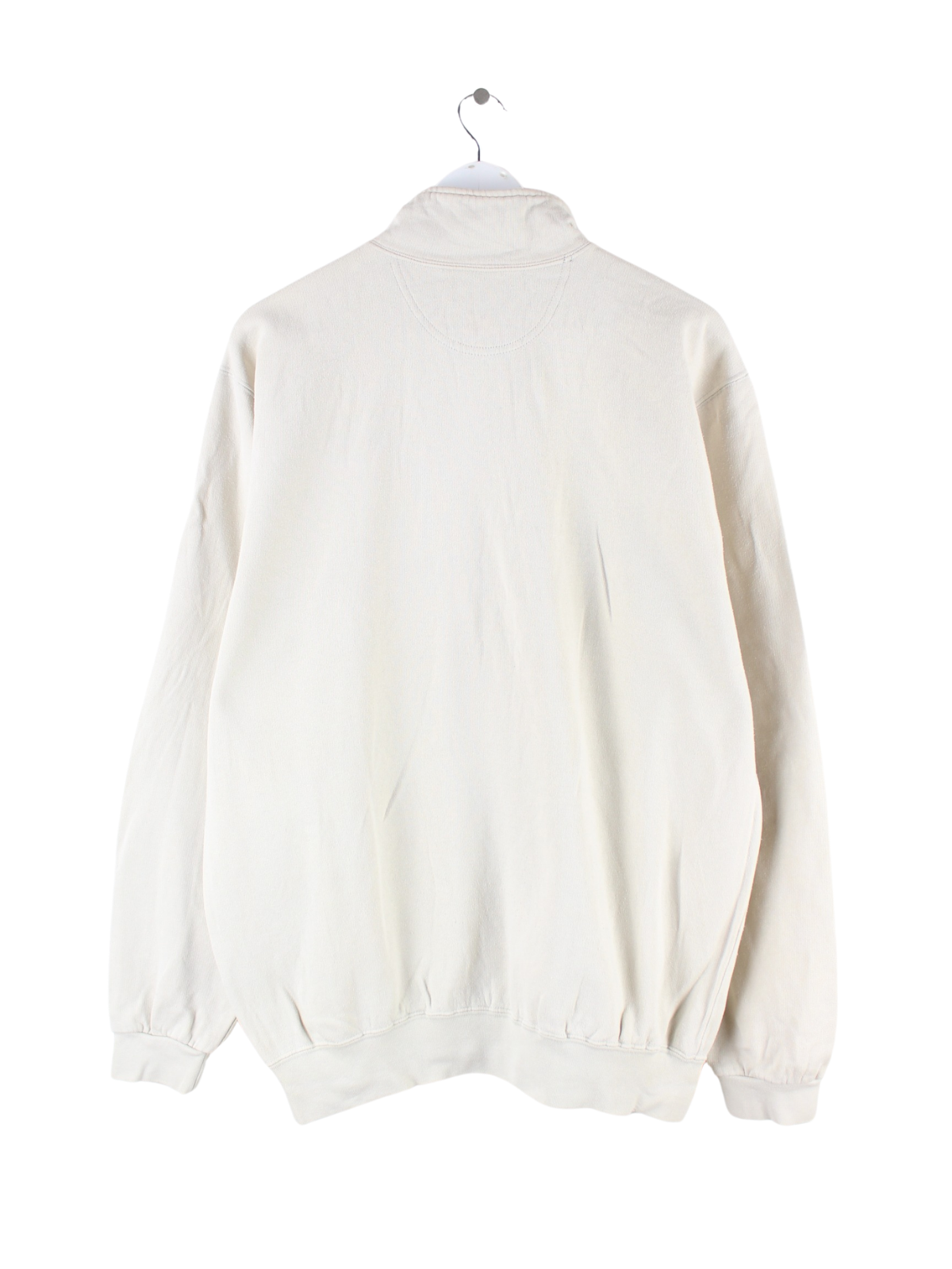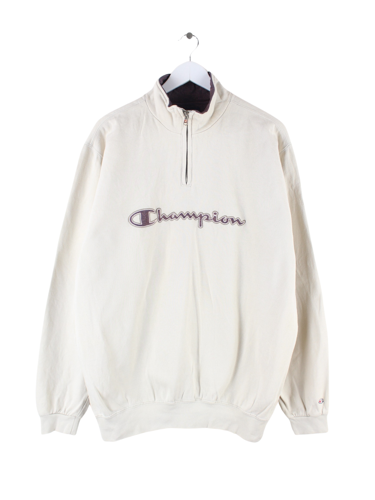 Beigefarbener Sweater mit Stick und half Zip vom Label Champion in Größe L. Er ist aus einer Baumwollmischung produziert und in sehr gutem Zustand lieferbar.