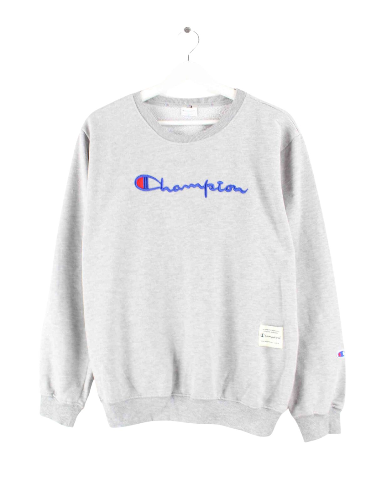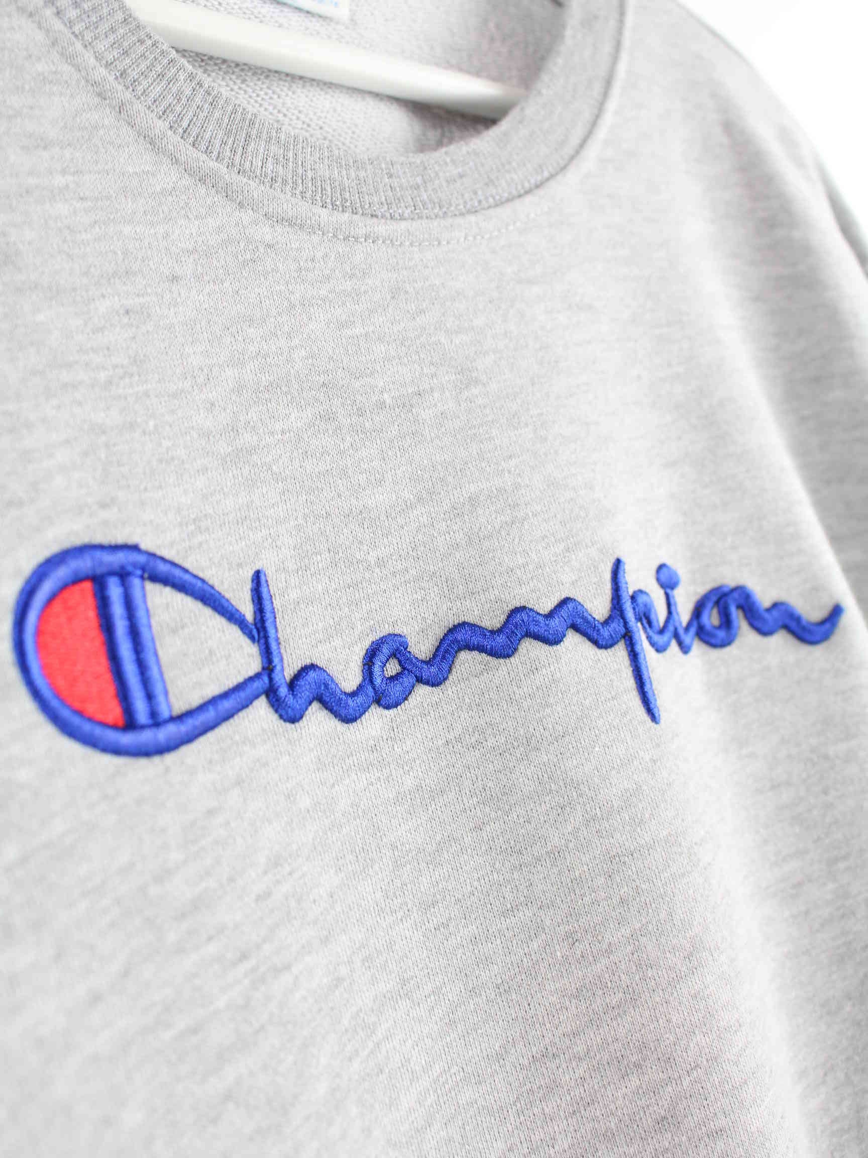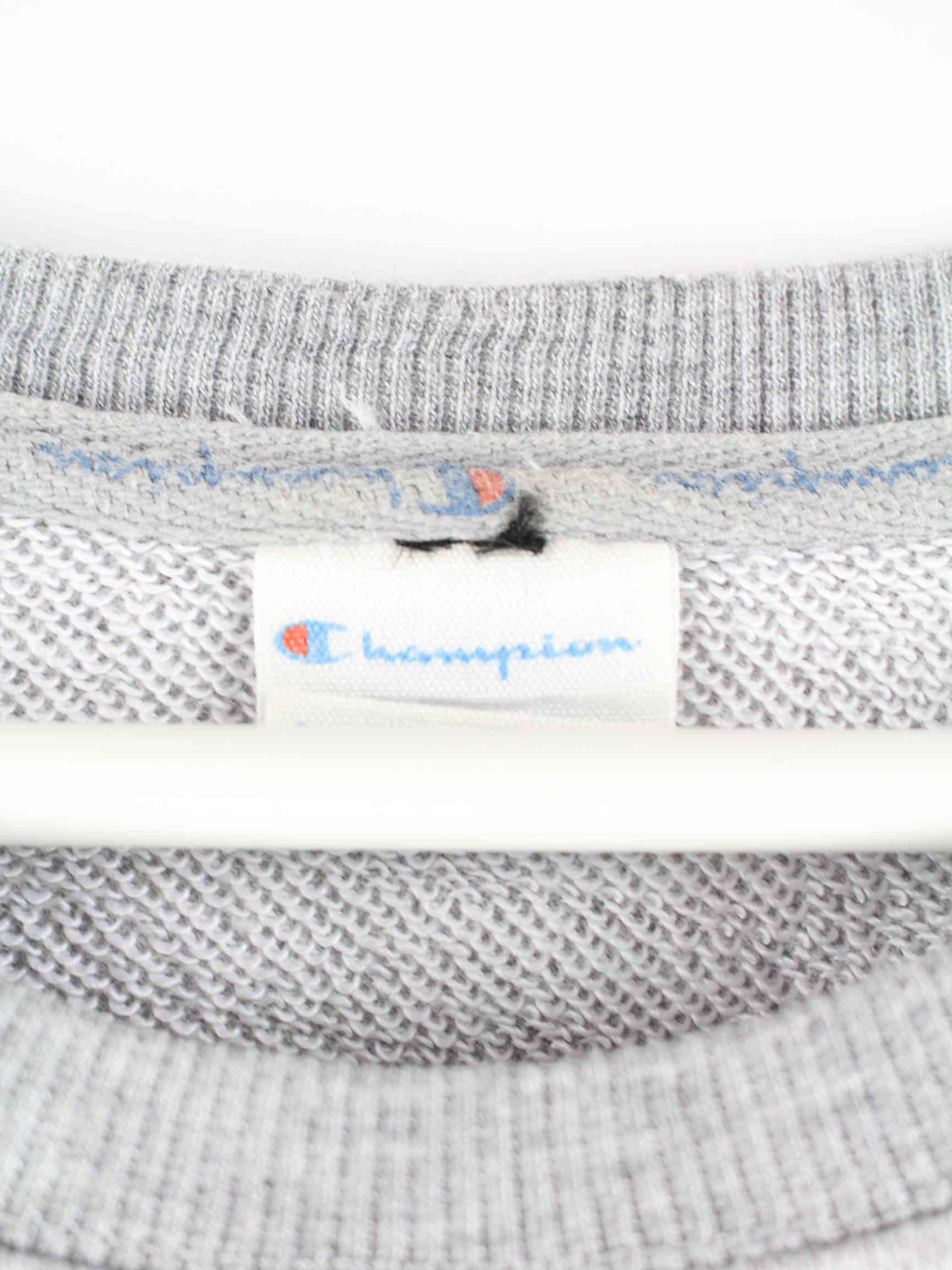 Gray sweater with embroidered motifs from the Champion label from the 90s in size S. It is made from a cotton blend and is in stock in good condition.