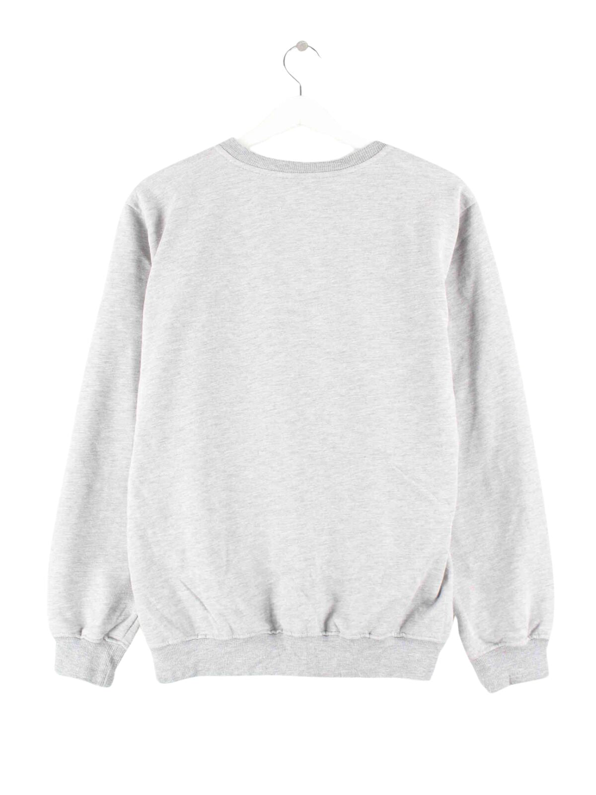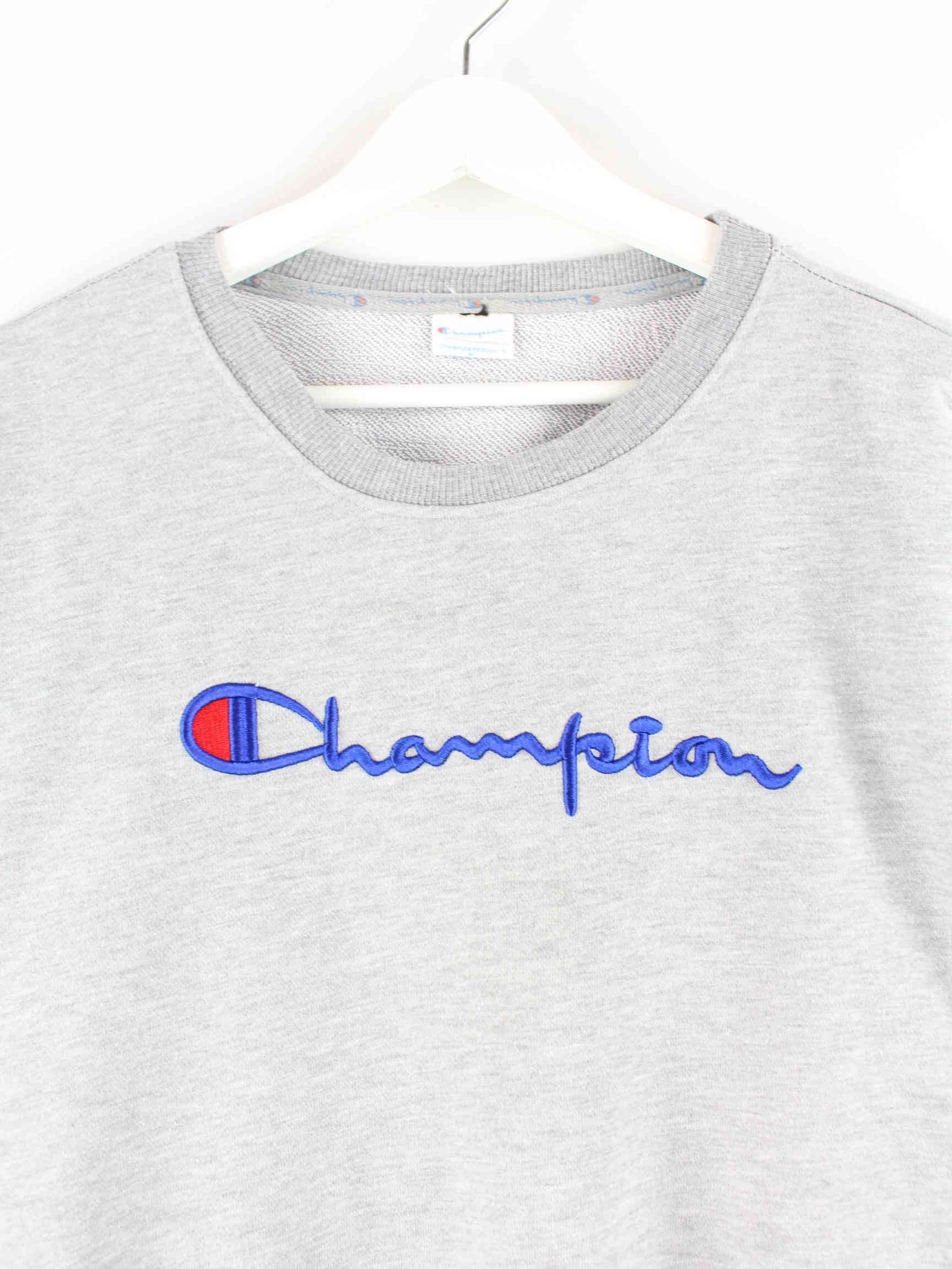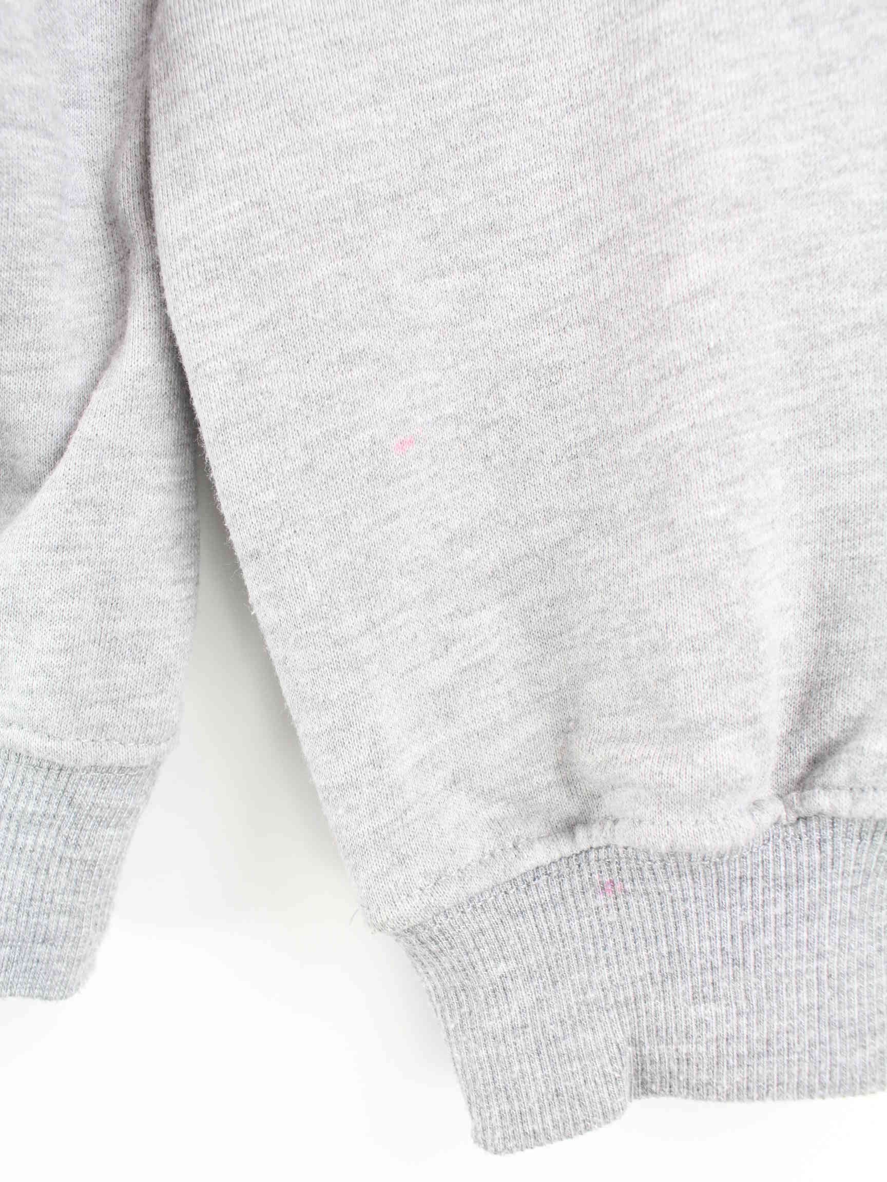 Gray sweater with embroidered motifs from the Champion label from the 90s in size S. It is made from a cotton blend and is in stock in good condition.