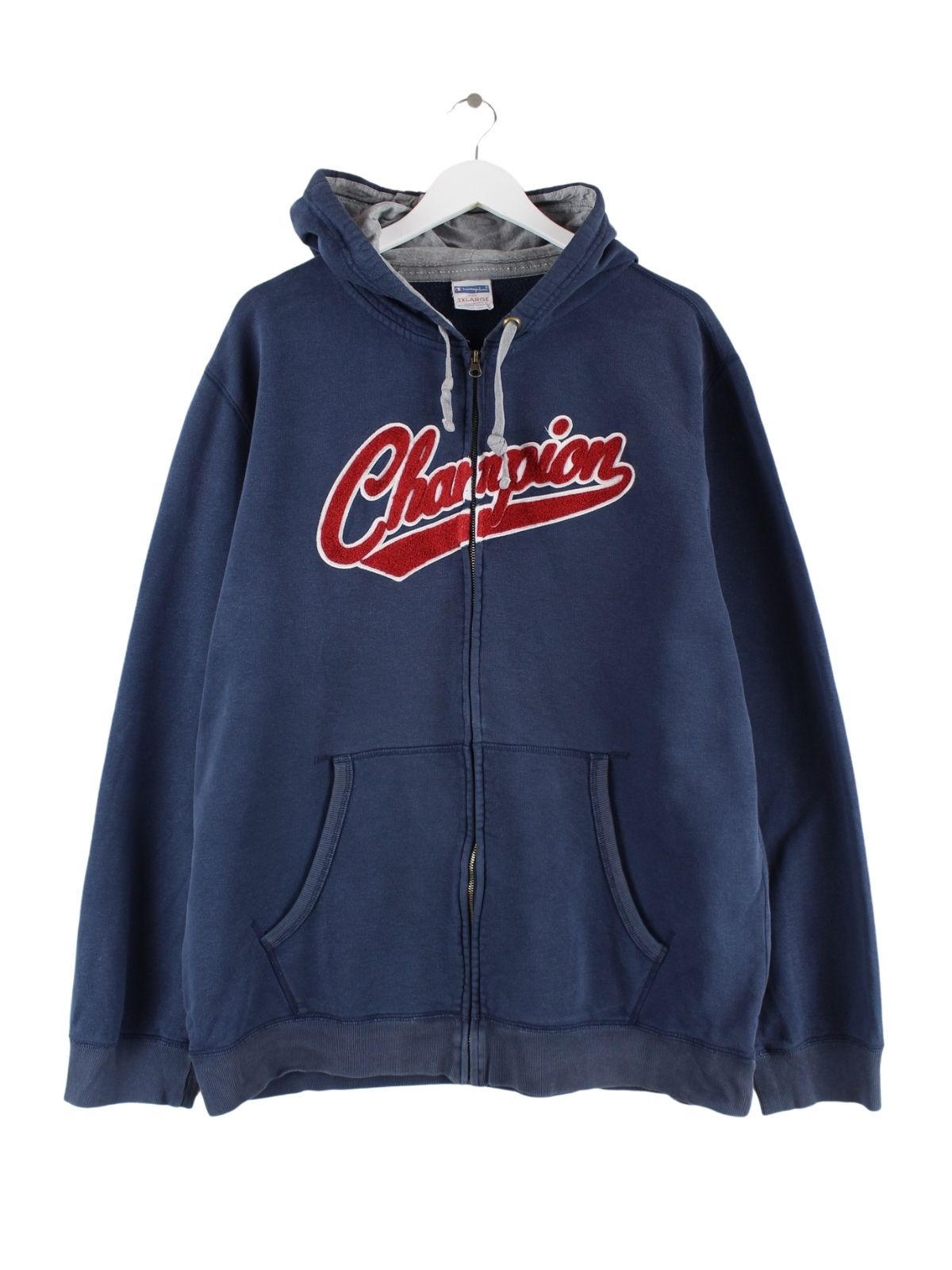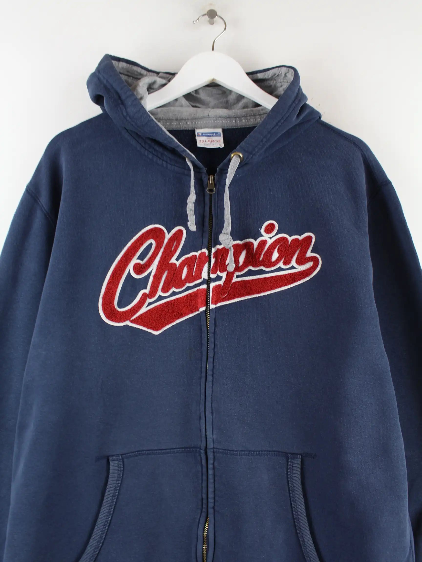 Blauer Hoodie mit gestickten Motiven und Reißverschluß von Champion in Größe 3XL. Er ist aus einer Baumwollmischung gemacht und in sehr gutem Zustand vorrätig.