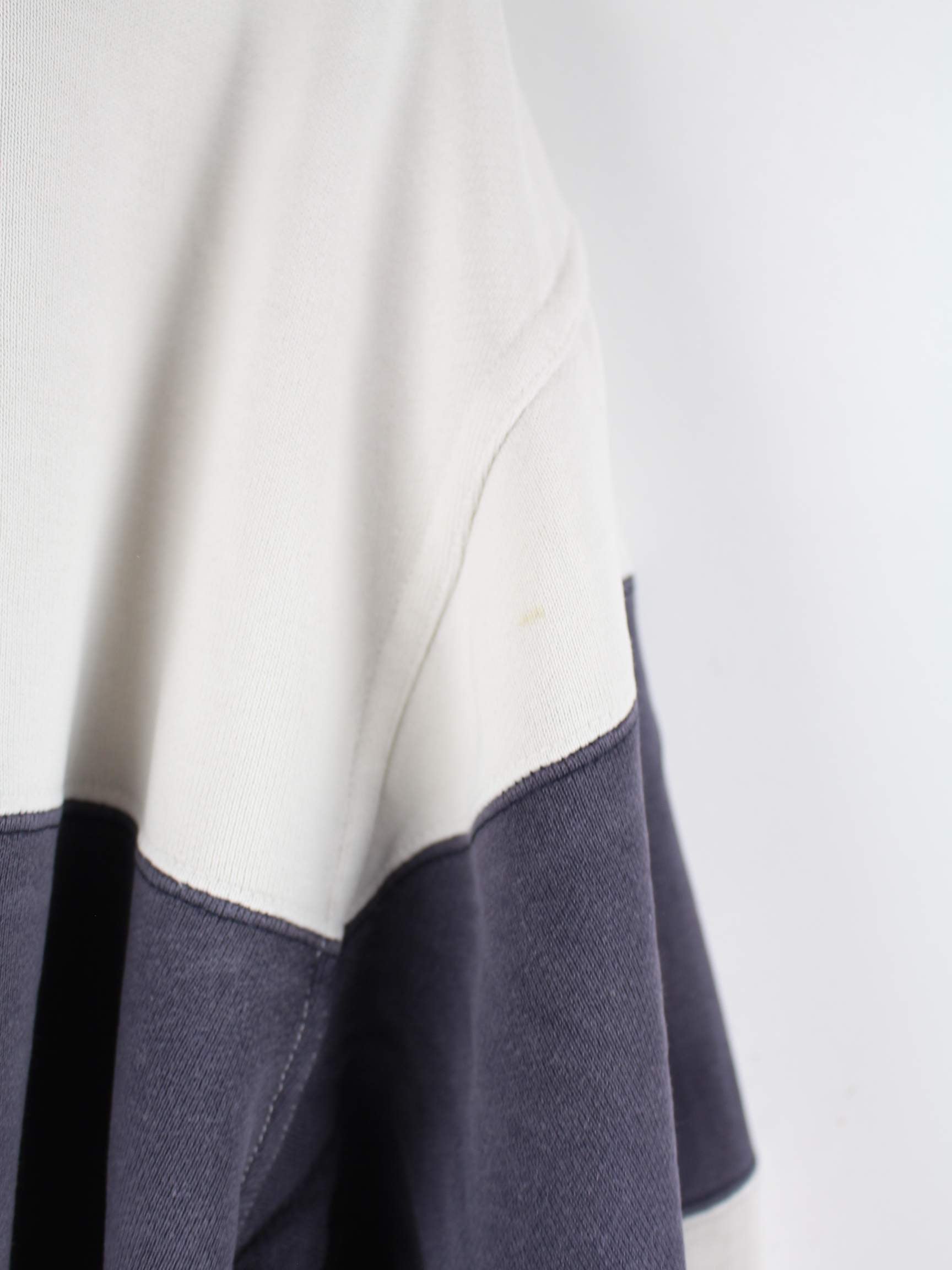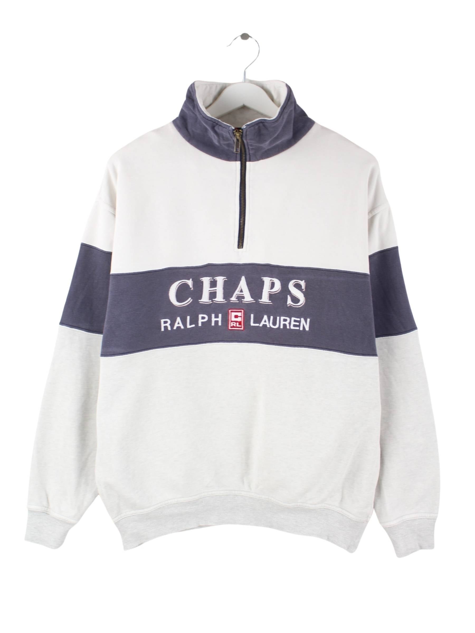 Grauer Sweater mit Stickereien und kurzem Reißverschluß des Labels Chaps by Ralph Lauren aus den 90'ern in Größe M. Er ist aus einer Baumwollmischung angefertigt und in gutem Zustand vorrätig.