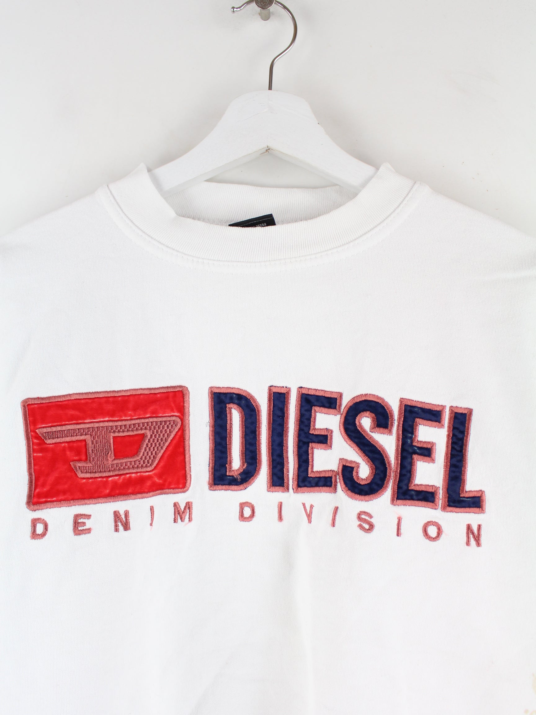 White sweater with embroidery by Diesel from the 90's in size S. It is made of a cotton blend and in good condition.