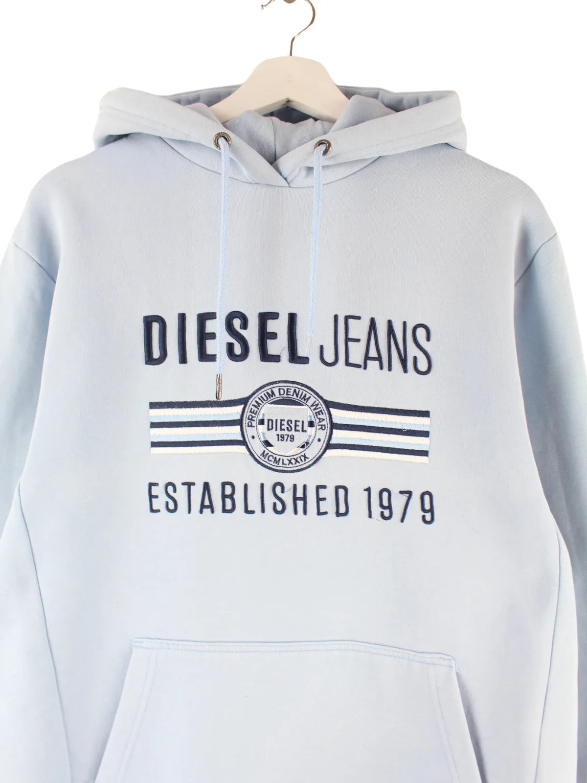 Blauer Hoodie mit Stick der Brand Diesel in Größe L. Er ist aus einer Baumwollmischung gefertigt und in gutem Zustand zu haben.