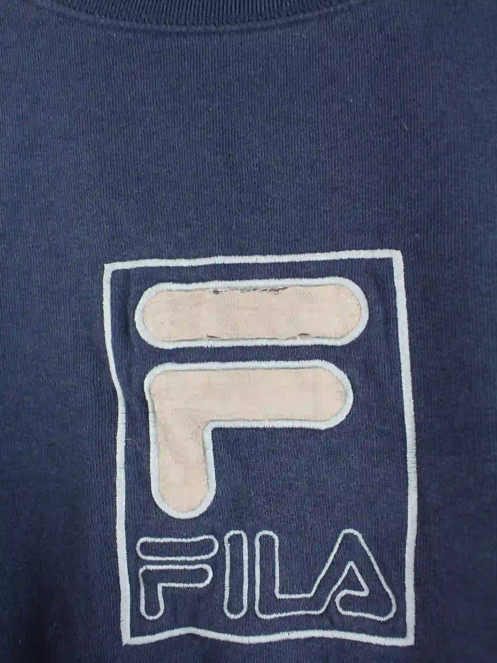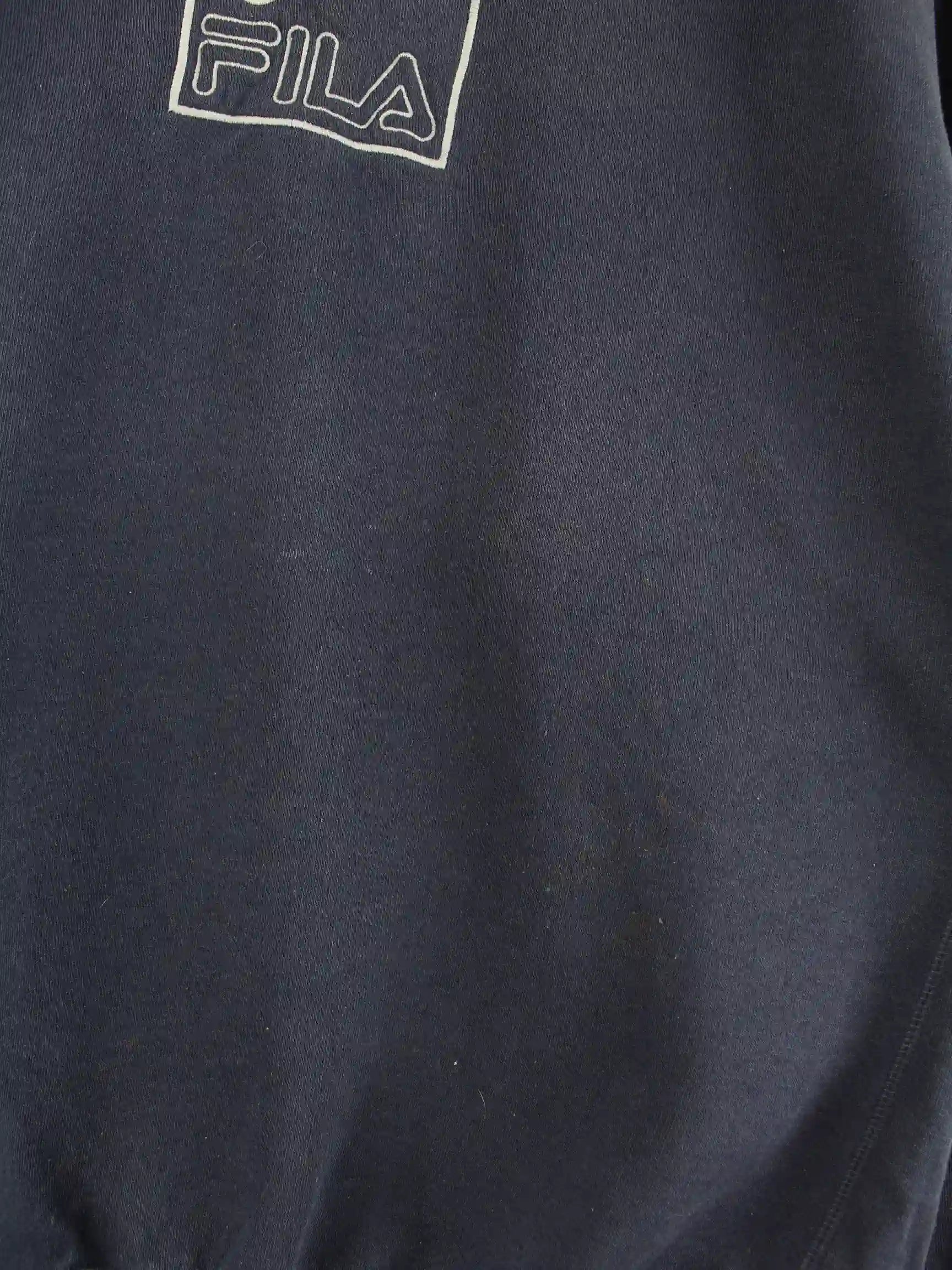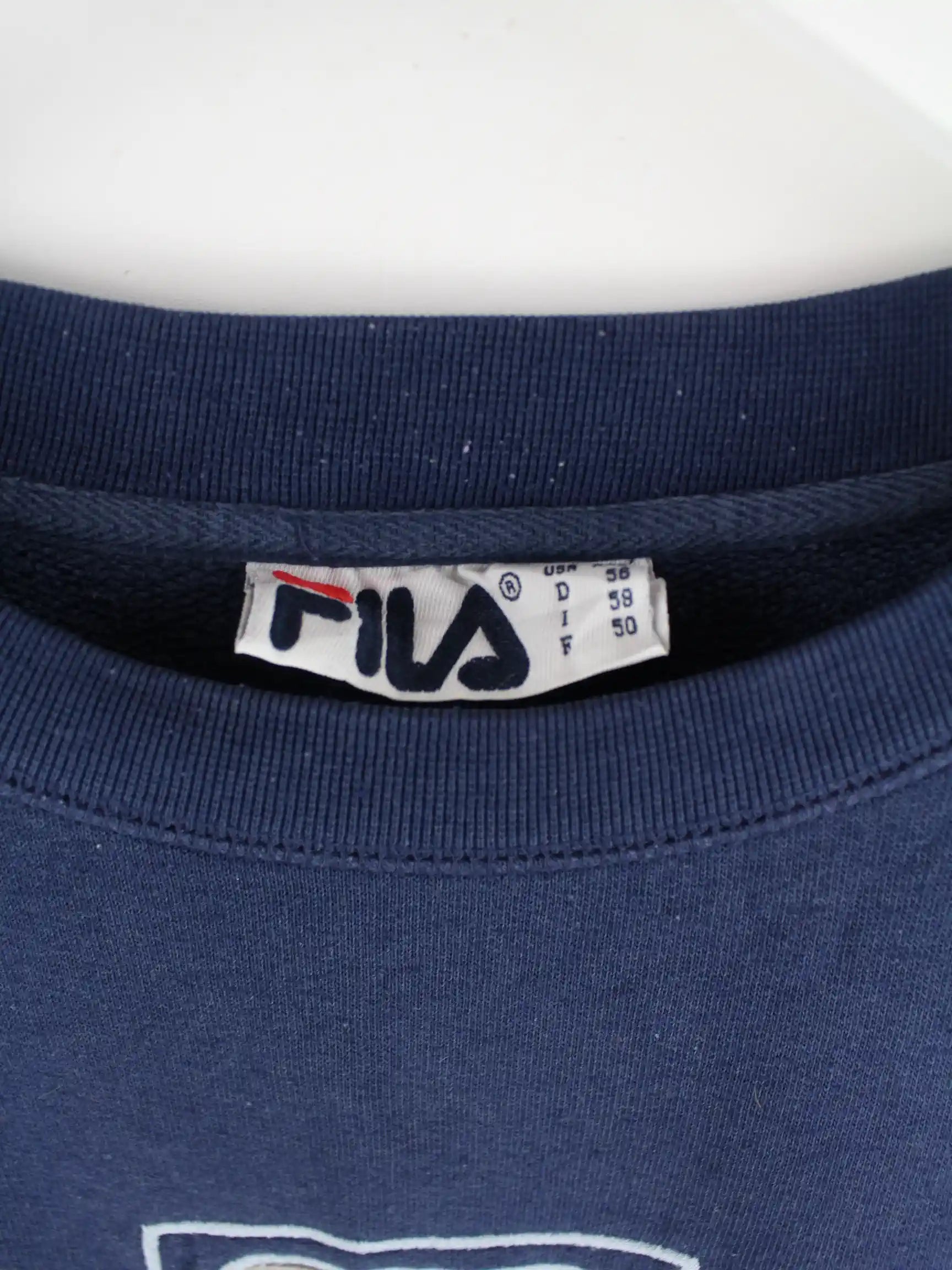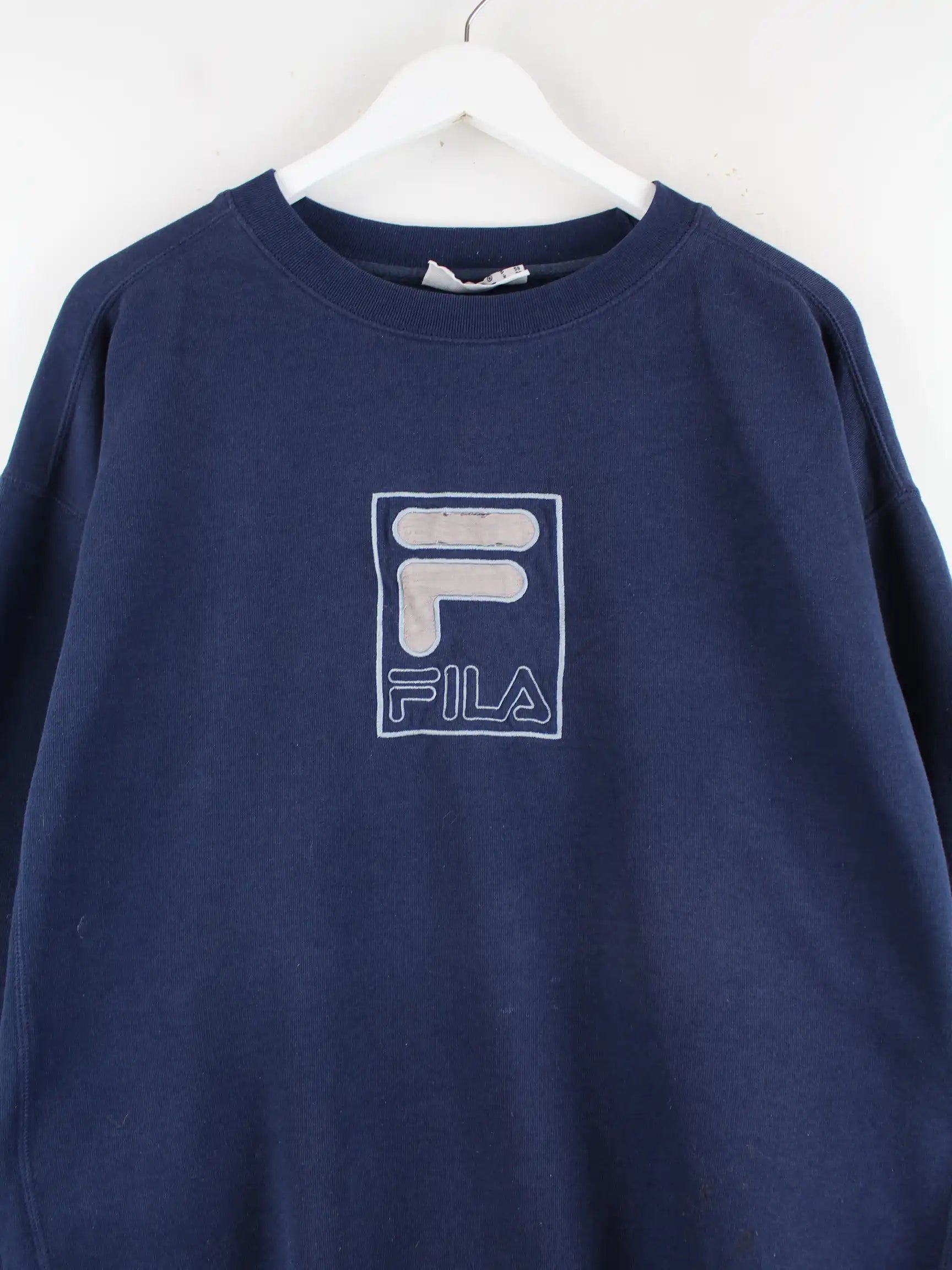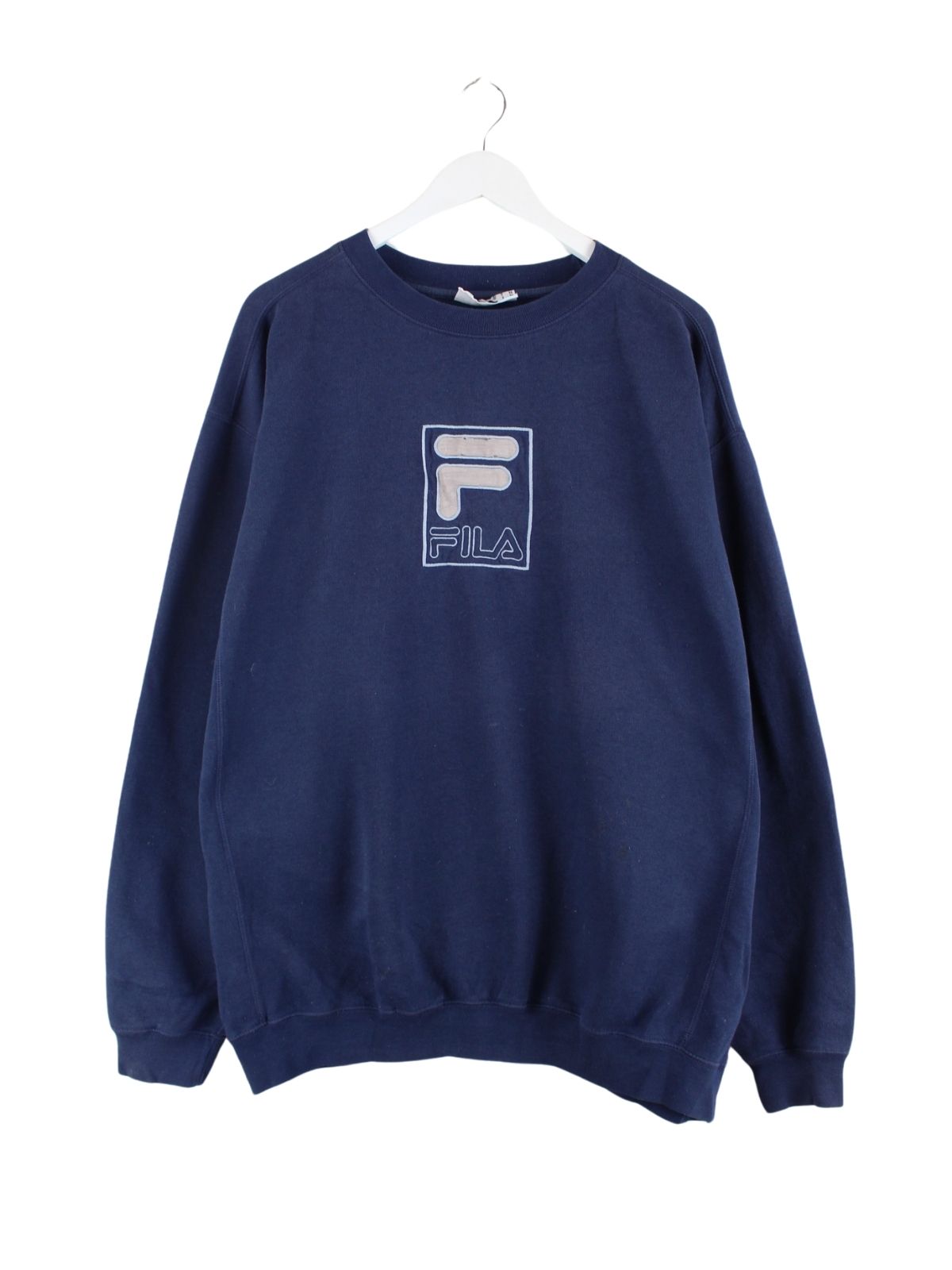 Sweater der Marke Fila mit Stickereien in Größe XXL. Er ist aus einer Baumwollmischung gefertigt und in Blau zu bekommen.