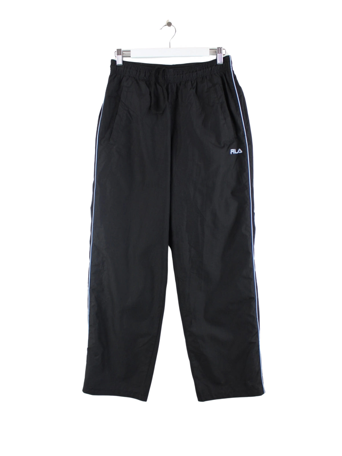 Schwarze Track Pants aus dem Hause Fila in Größe S. Sie sind aus Synthetik produziert und in sehr gutem Zustand bei uns vorrätig.