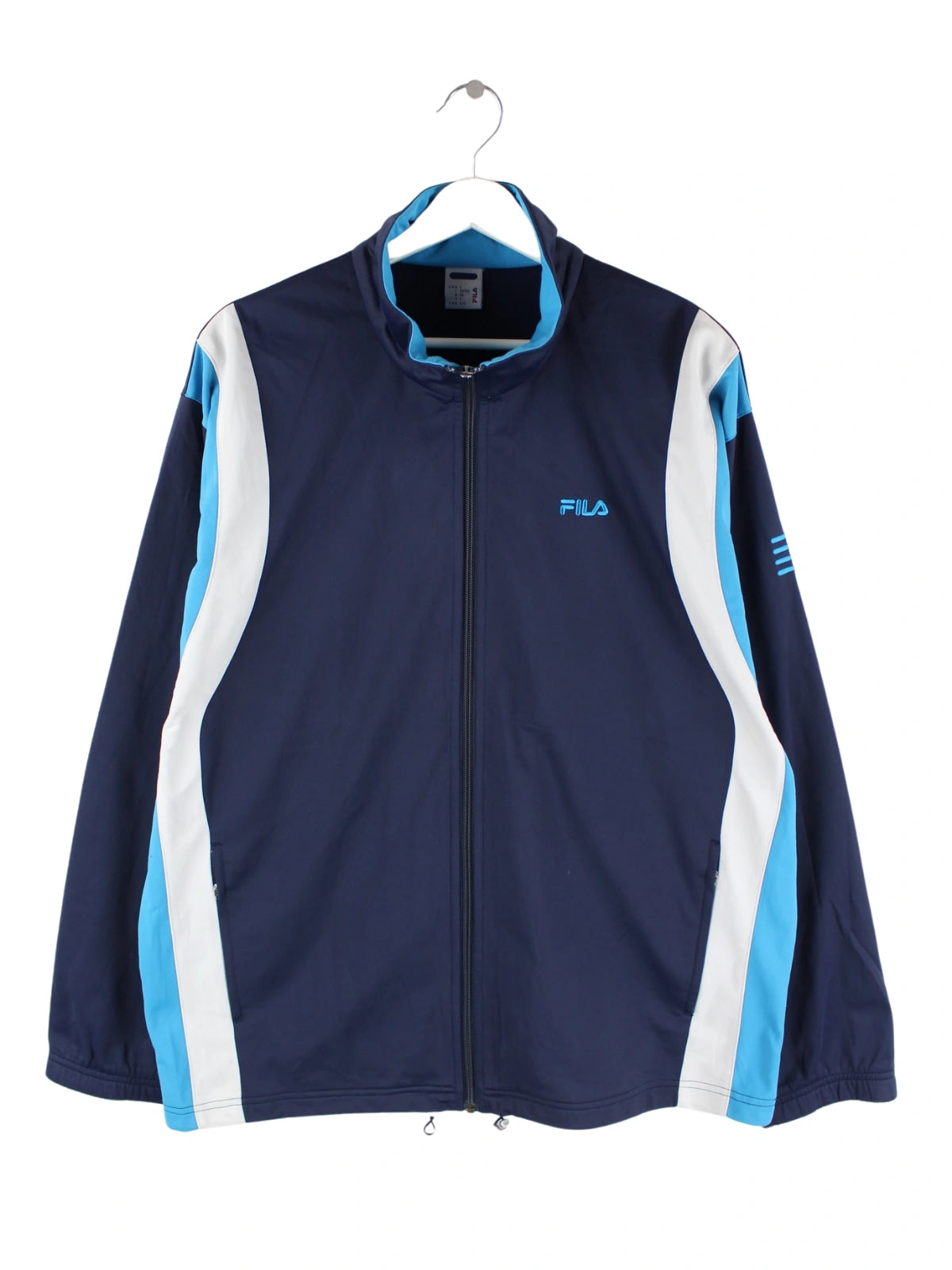 Blaue Trainingsjacke vom Brand Fila in Größe L. Sie ist aus Synthetik produziert und in sehr gutem Zustand im Bestand.
