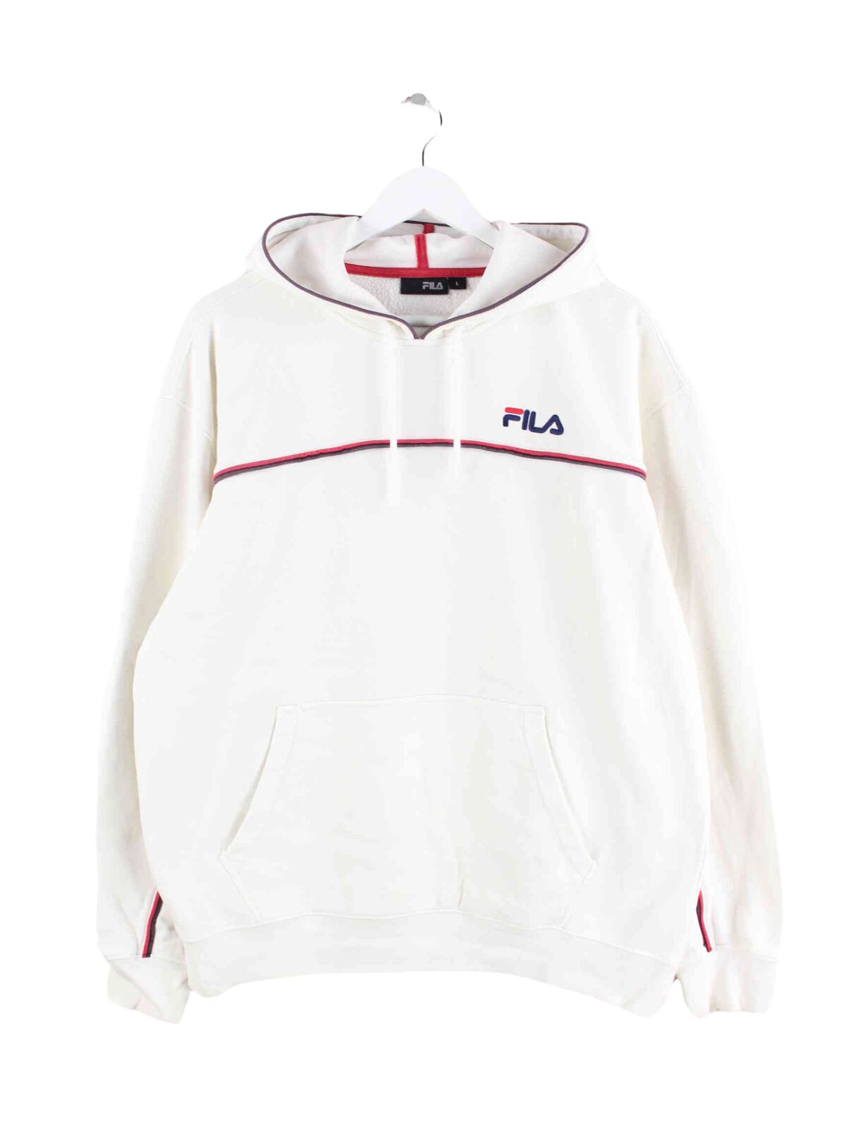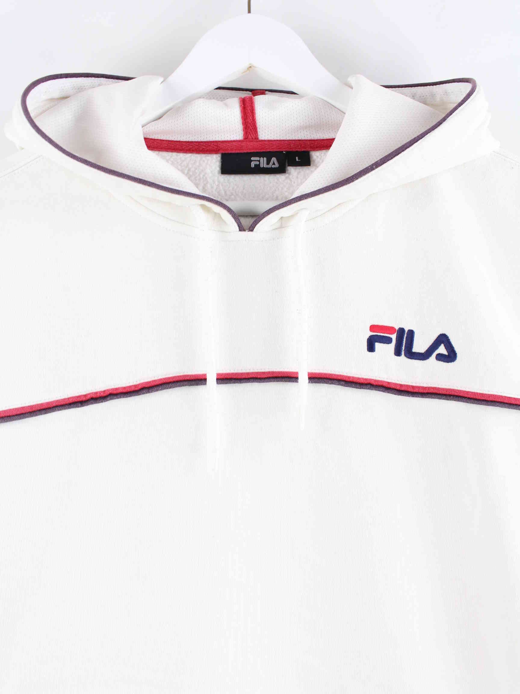 White hoodie with embroidery from the Fila label in size L. It is made from a cotton blend and is available from us in good condition.