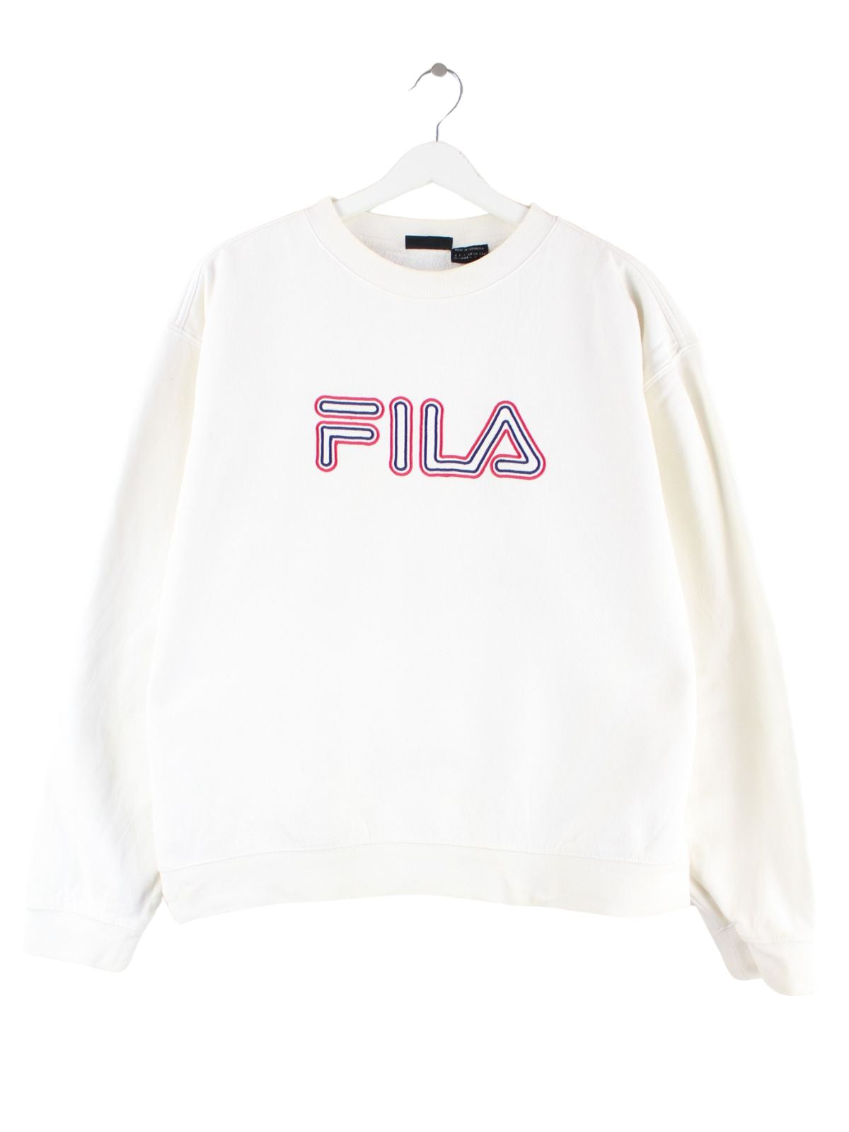 Weißer Sweater mit gestickten Motiven vom Label Fila in Größe L. Er ist aus einer Baumwollmischung gemacht. Den Zustand würden wir als 'In Ordnung' bezeichnen (vergl. Bilder).