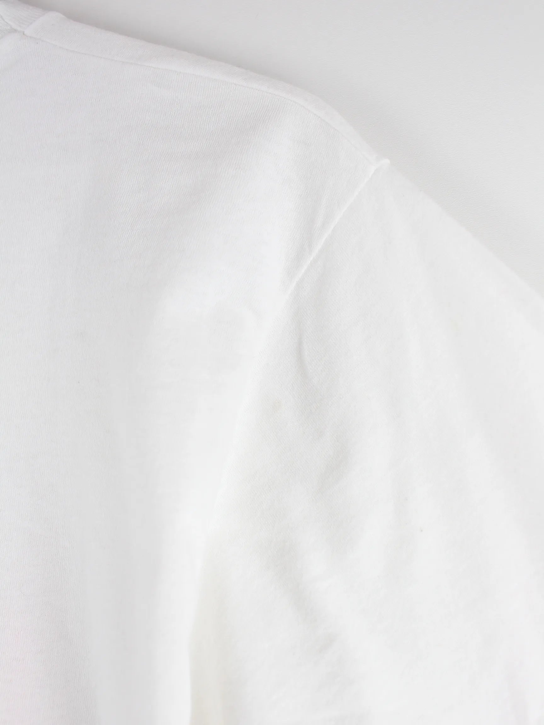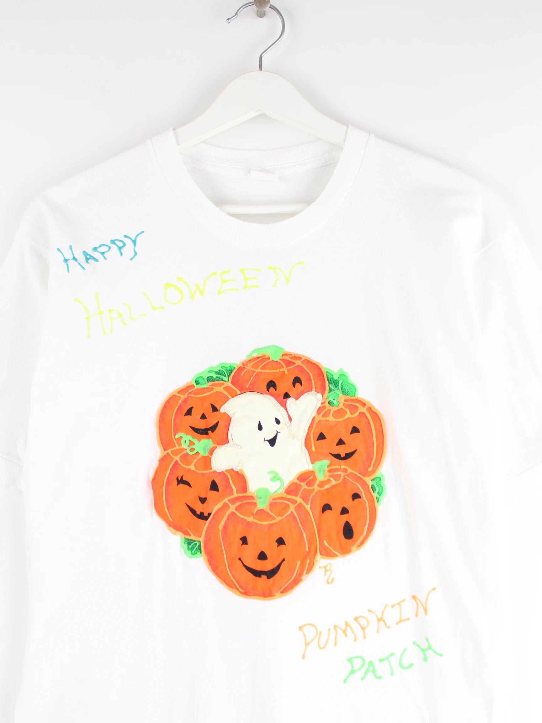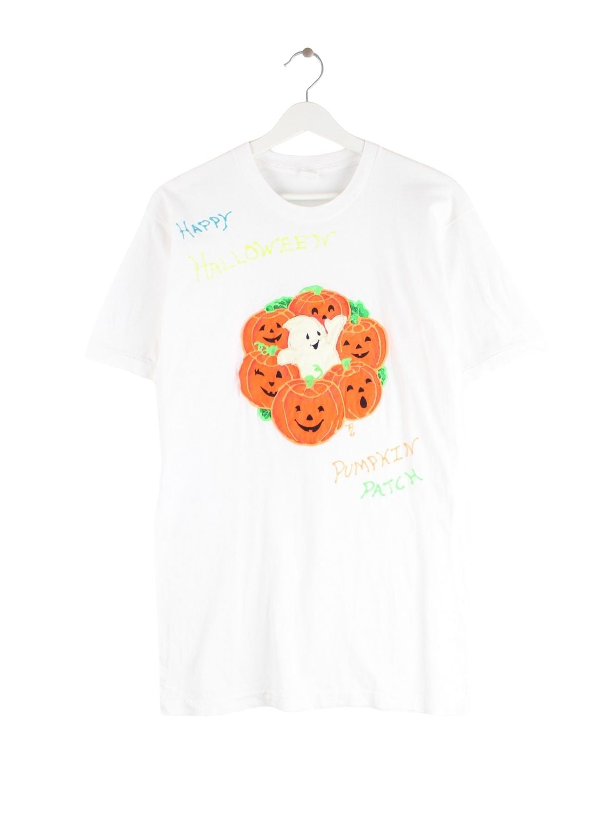 T-Shirt vom Label Fruit of the Loom in Größe L aus den 80'ern. Es ist aus Baumwolle und in Weiß im Bestand. Mit tollem Halloween Print.