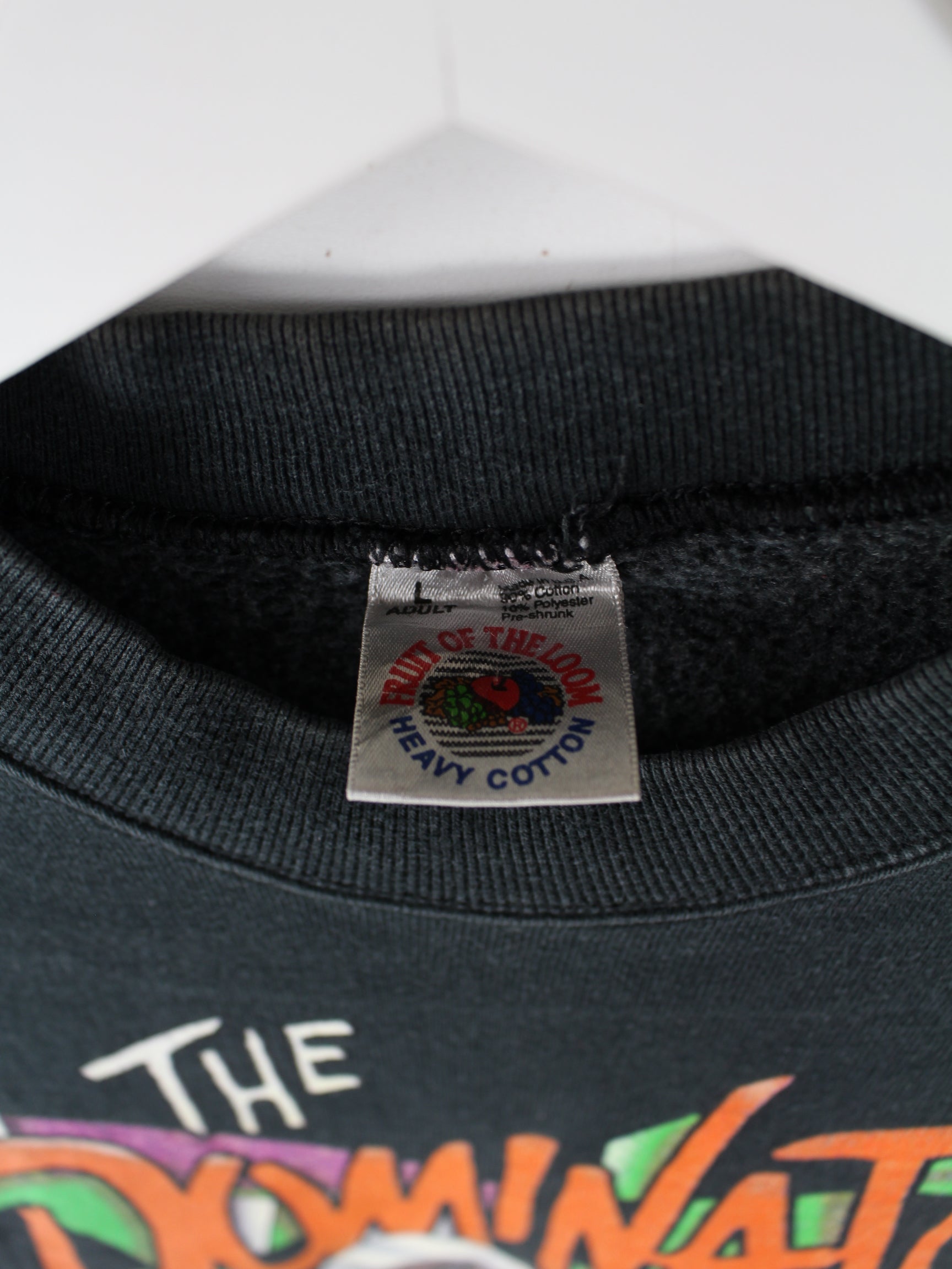 Sweater vom Brand Fruit of the Loom in Größe L aus den 90'ern. Er ist aus einer Baumwollmischung hergestellt und in Schwarz zu bekommen. Mit chiquem Dominator Print.