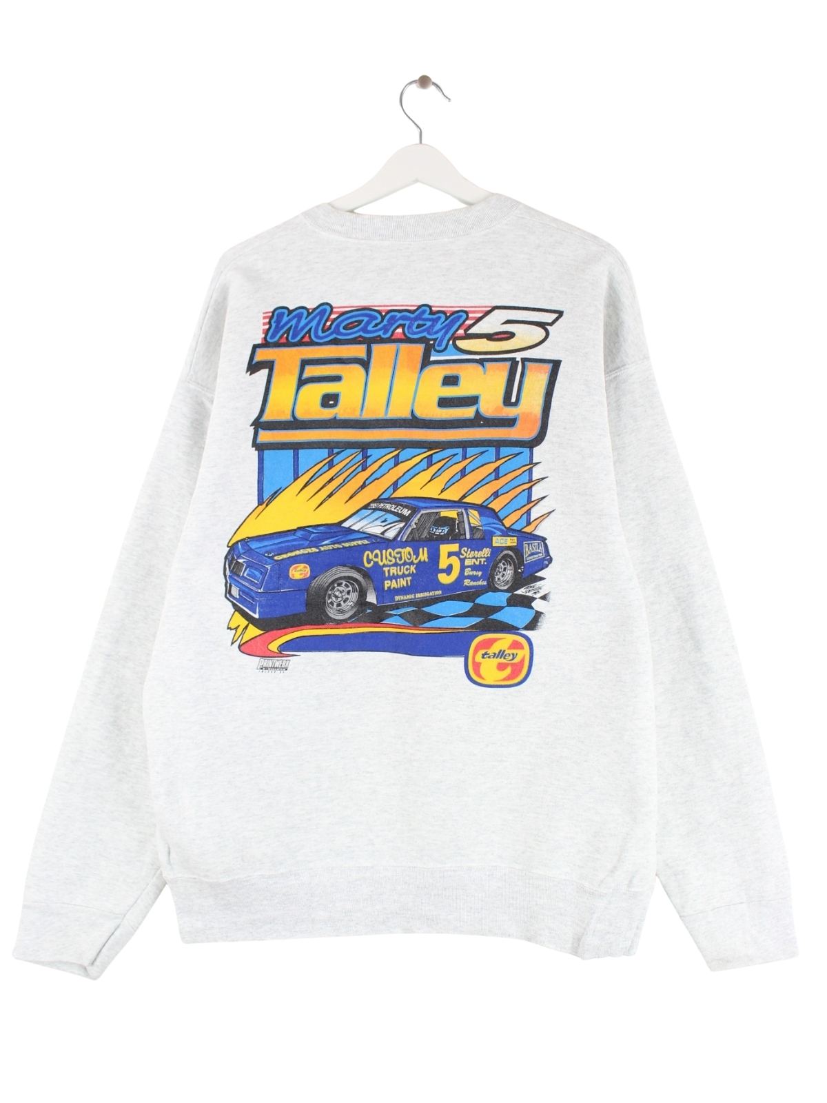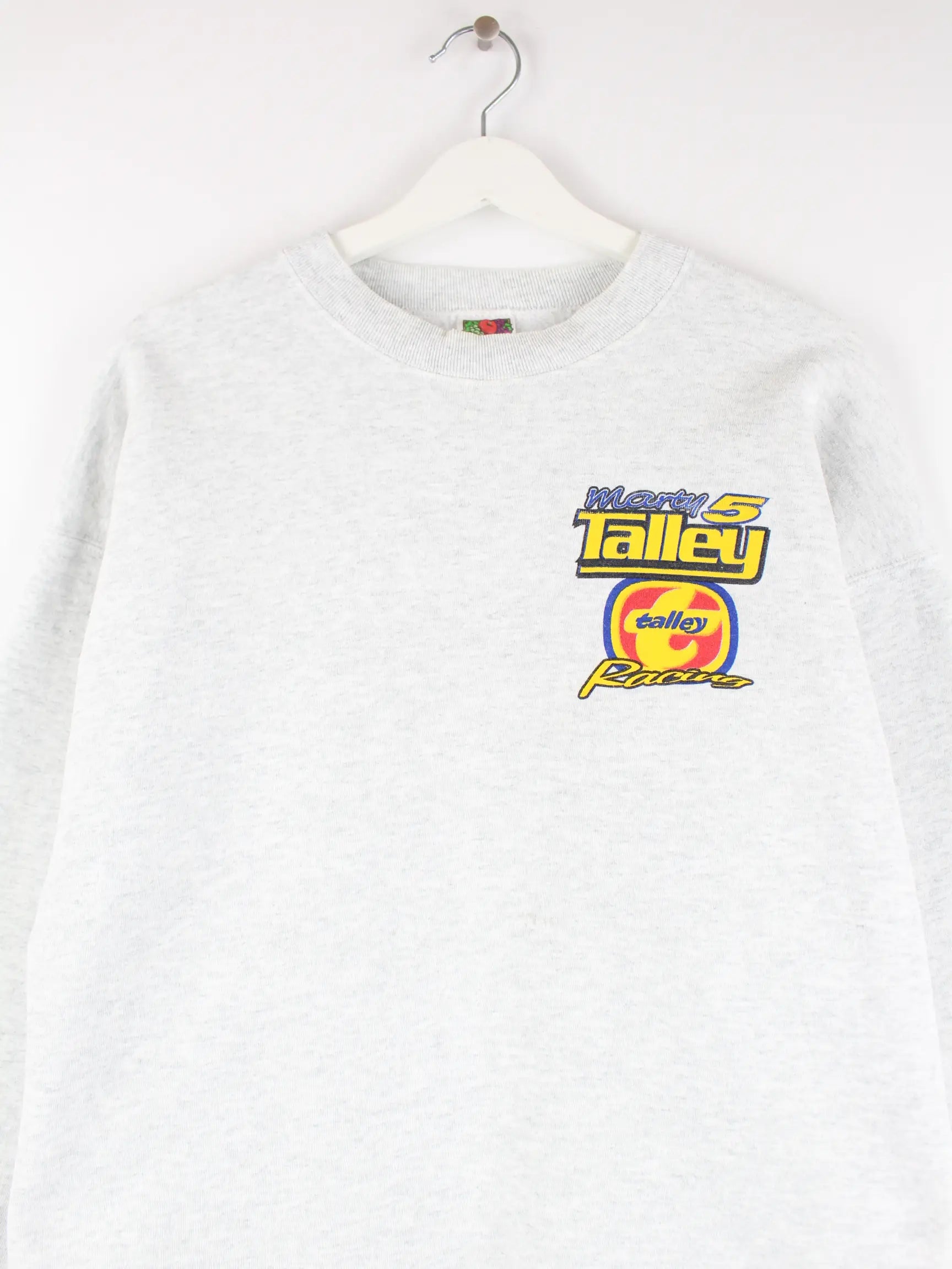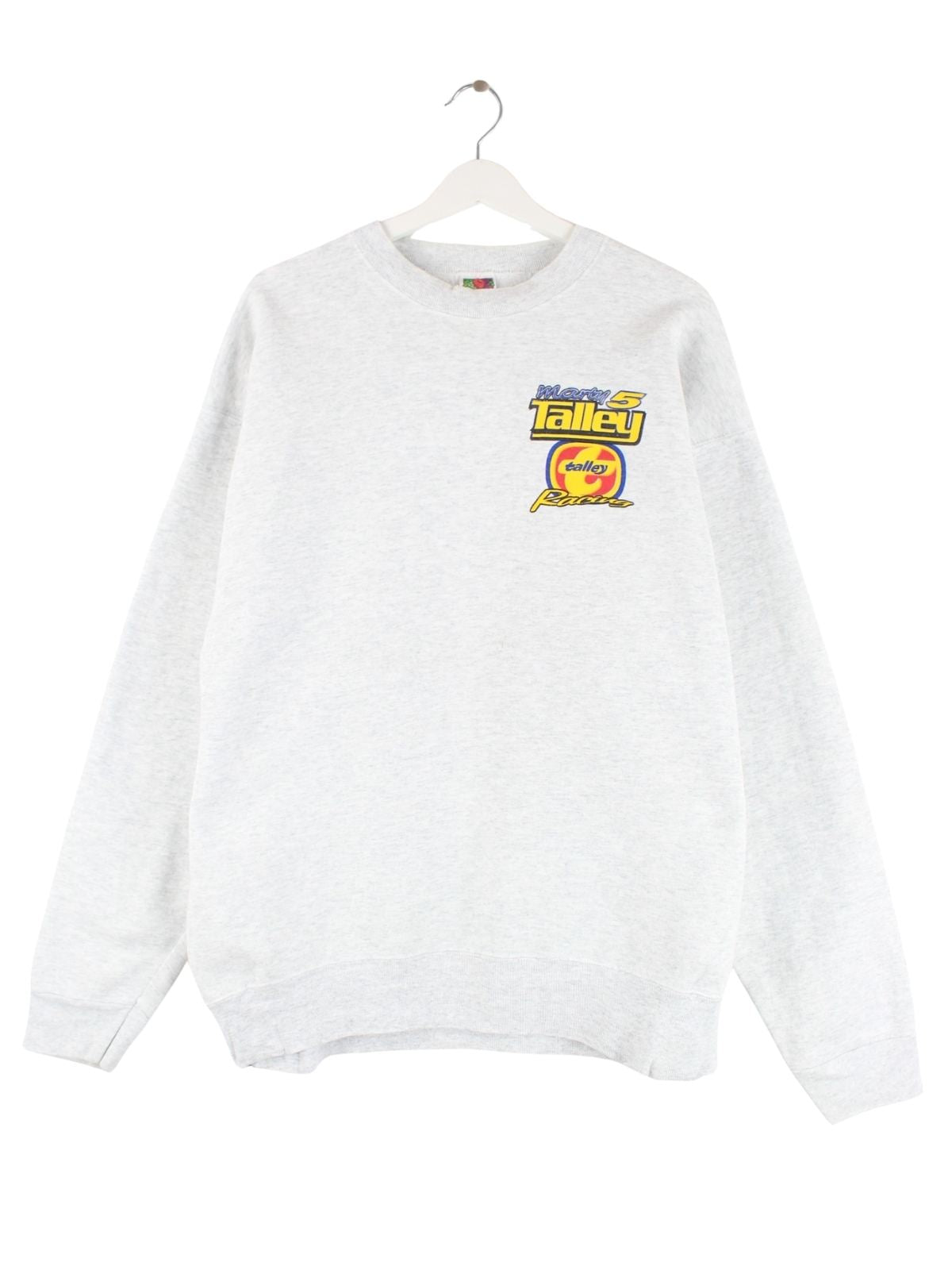 Grauer Sweater des Labels Fruit of the Loom aus den 90'ern in Größe XL. Er ist aus einer Baumwollmischung gemacht und in gutem Zustand zu haben. Mit schickem Racing Print.