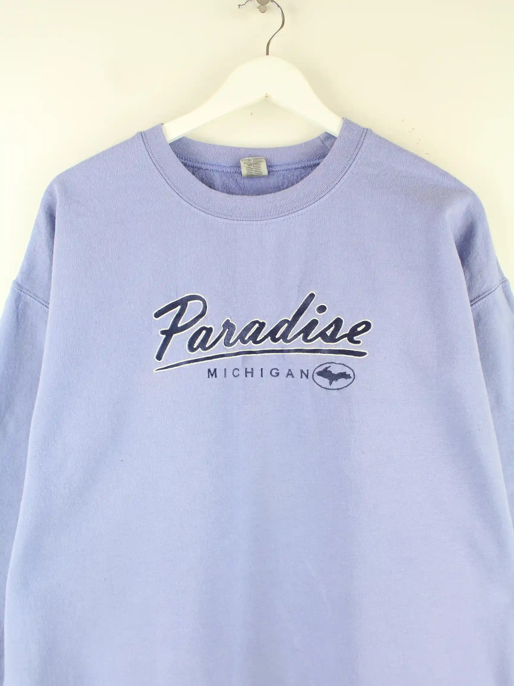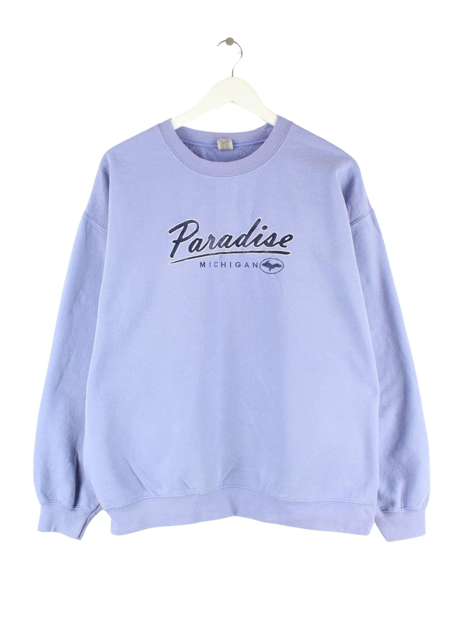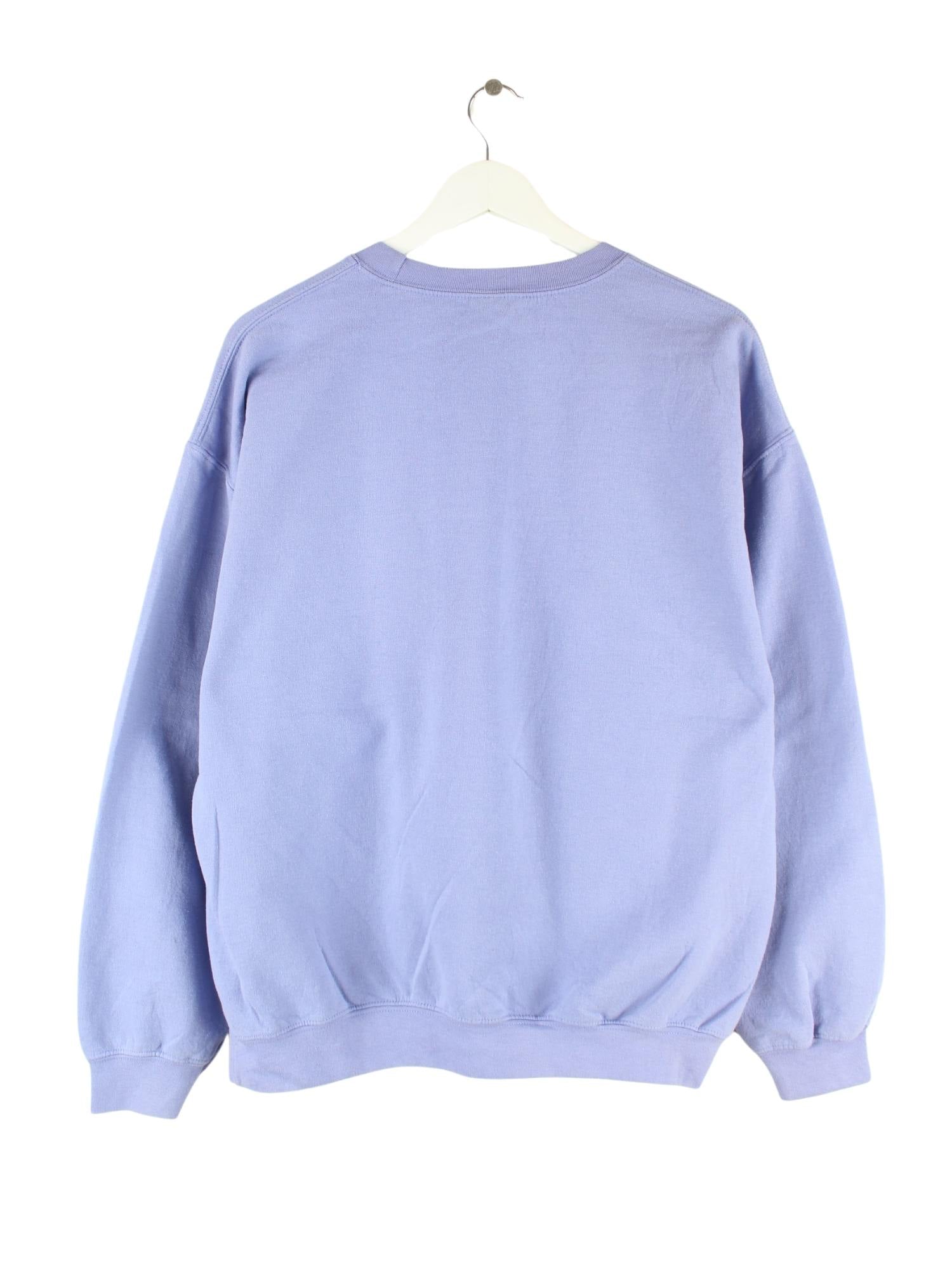 Lilafarbener Sweater mit Stick der Brand Gildan in Größe L. Er ist aus einer Baumwollmischung gefertigt und in sehr gutem Zustand im Bestand.