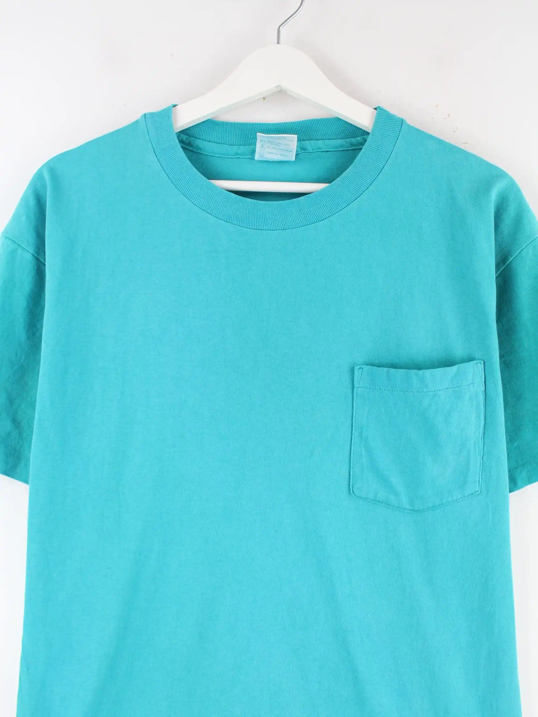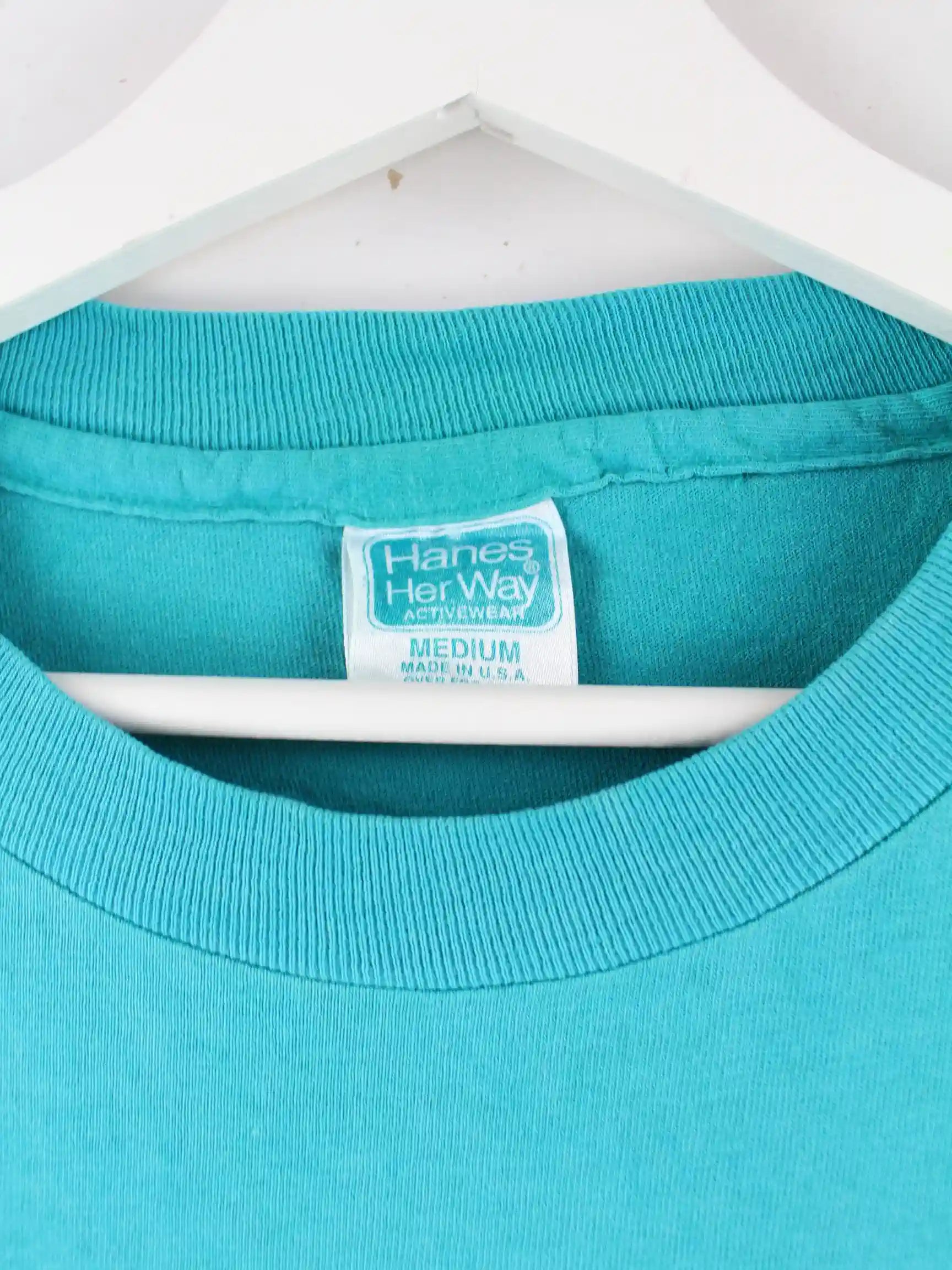 Türkisfarbenes T-Shirt von Hanes aus den 90'ern in Größe M. Es ist aus Baumwolle und in gutem Zustand im Bestand.