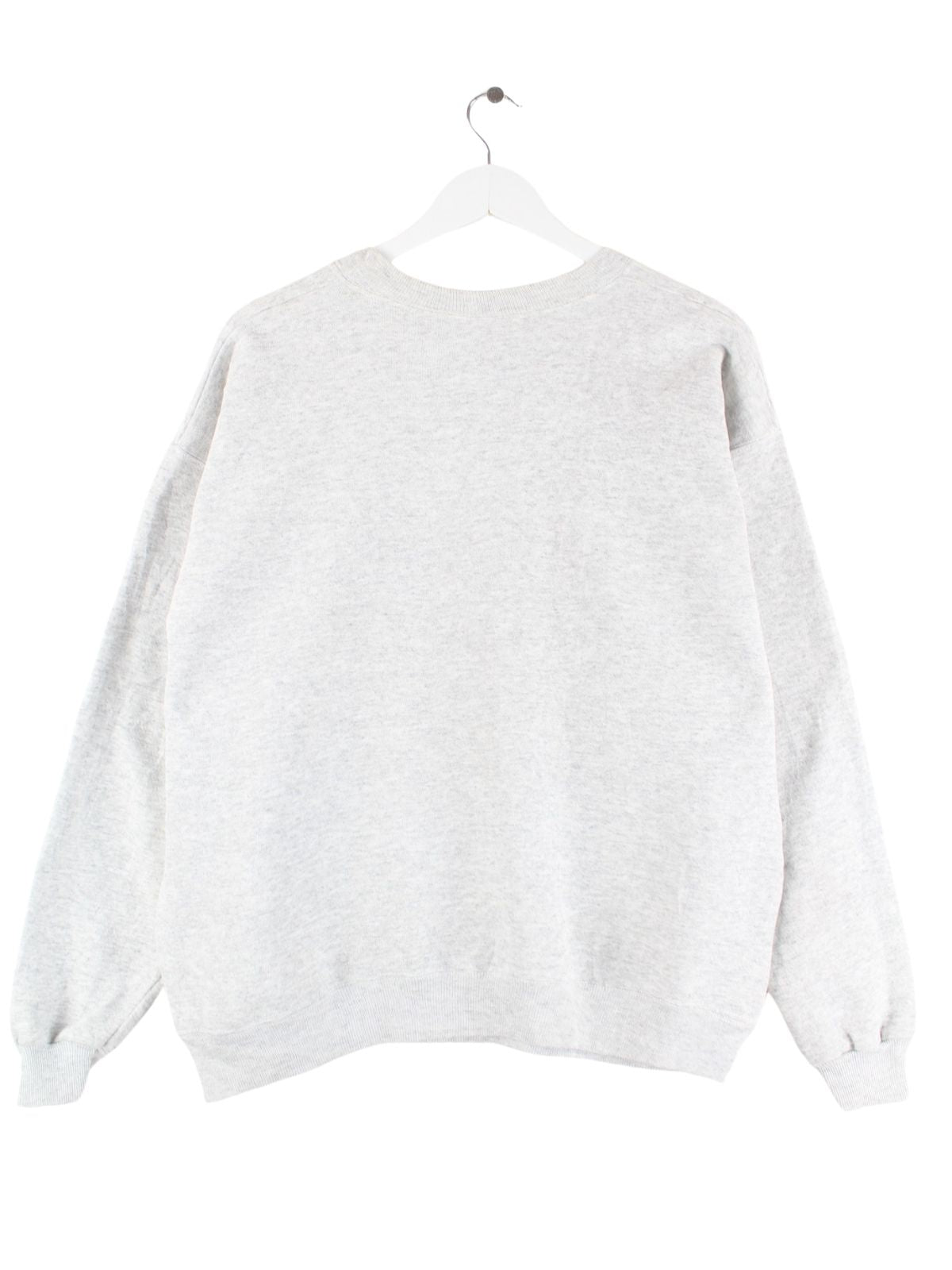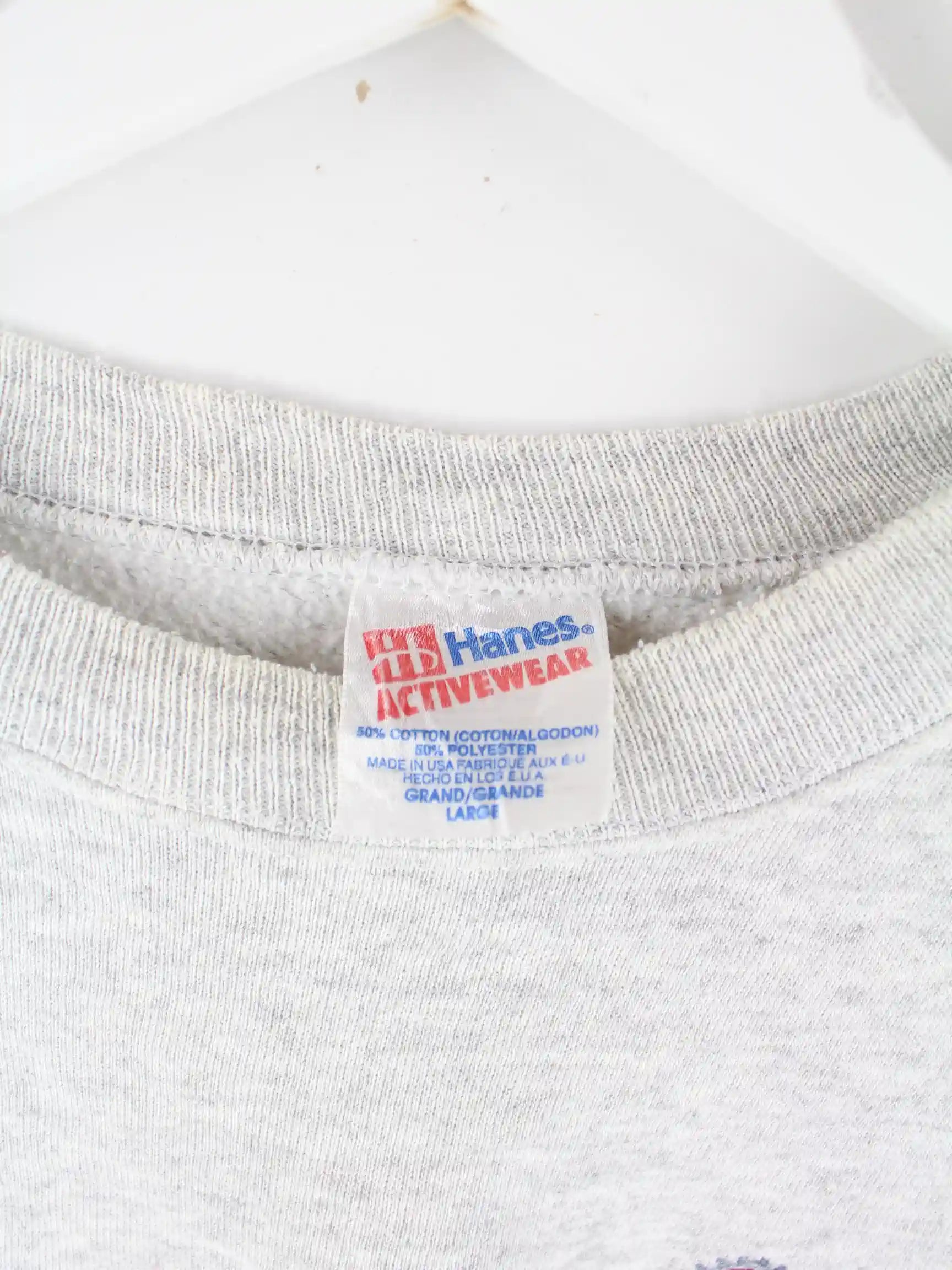 Grauer Sweater mit Stickereien von Hanes aus den 90'ern in Größe L. Er ist aus einer Baumwollmischung und in sehr gutem Zustand bei uns vorrätig.