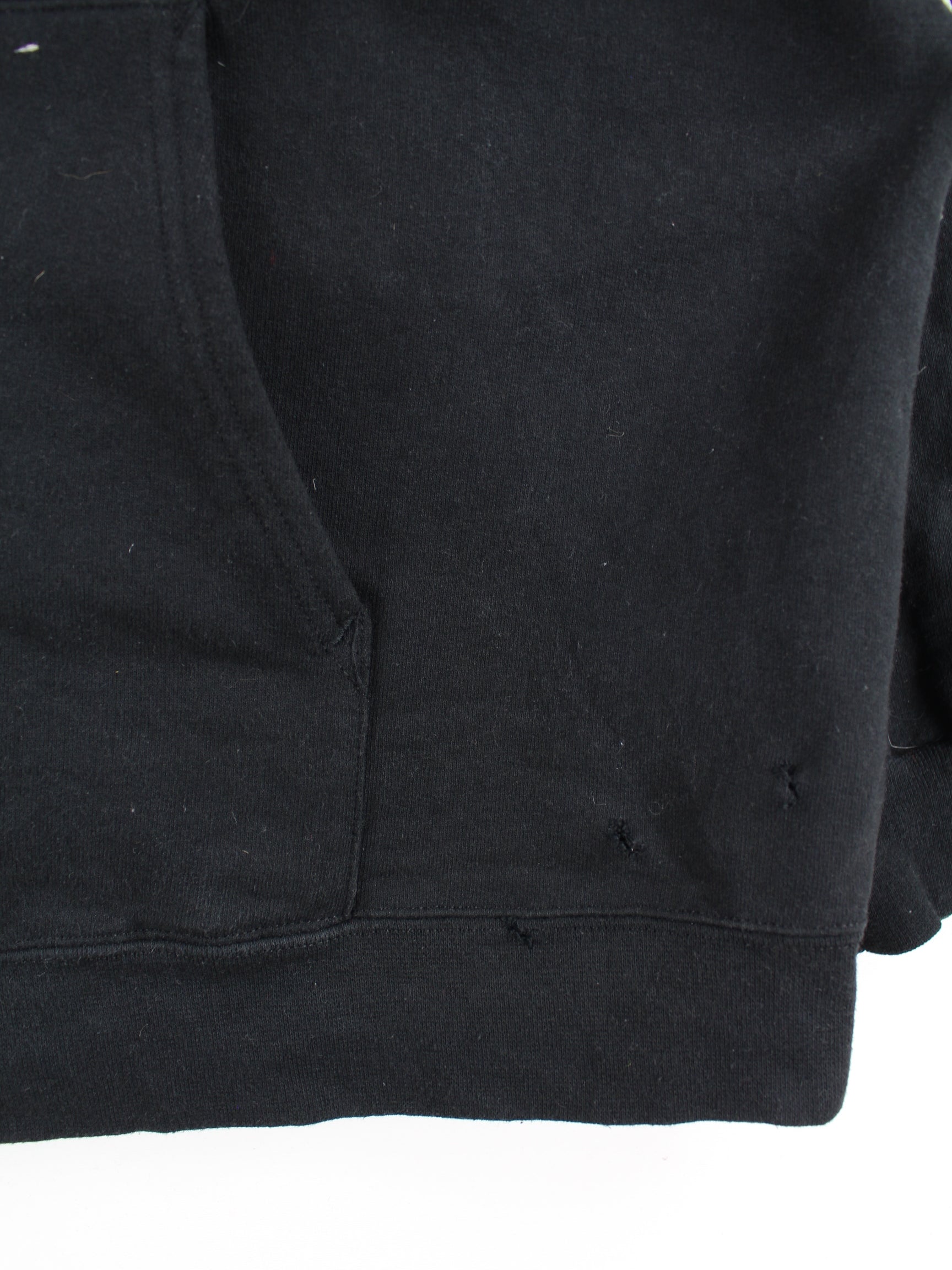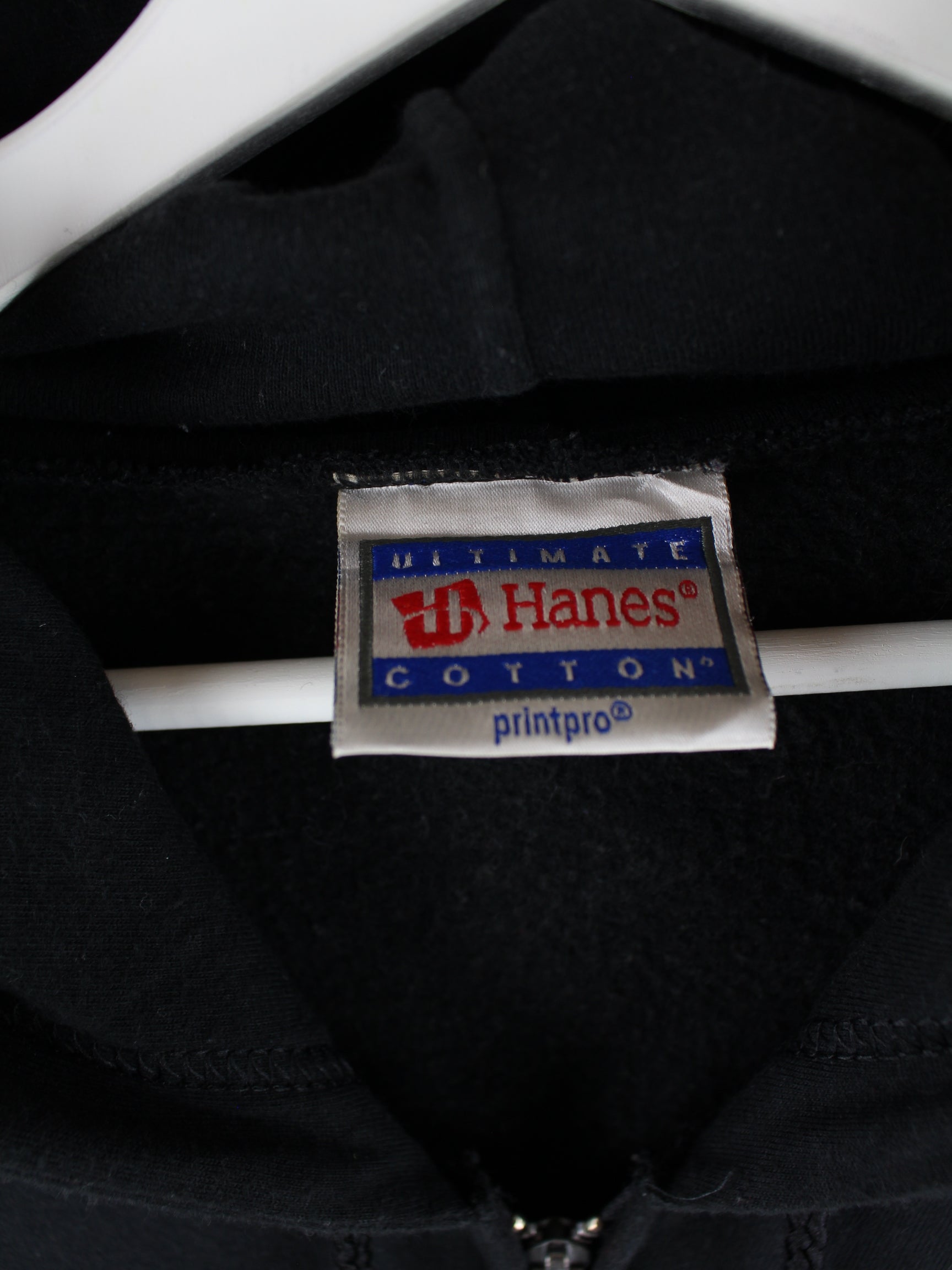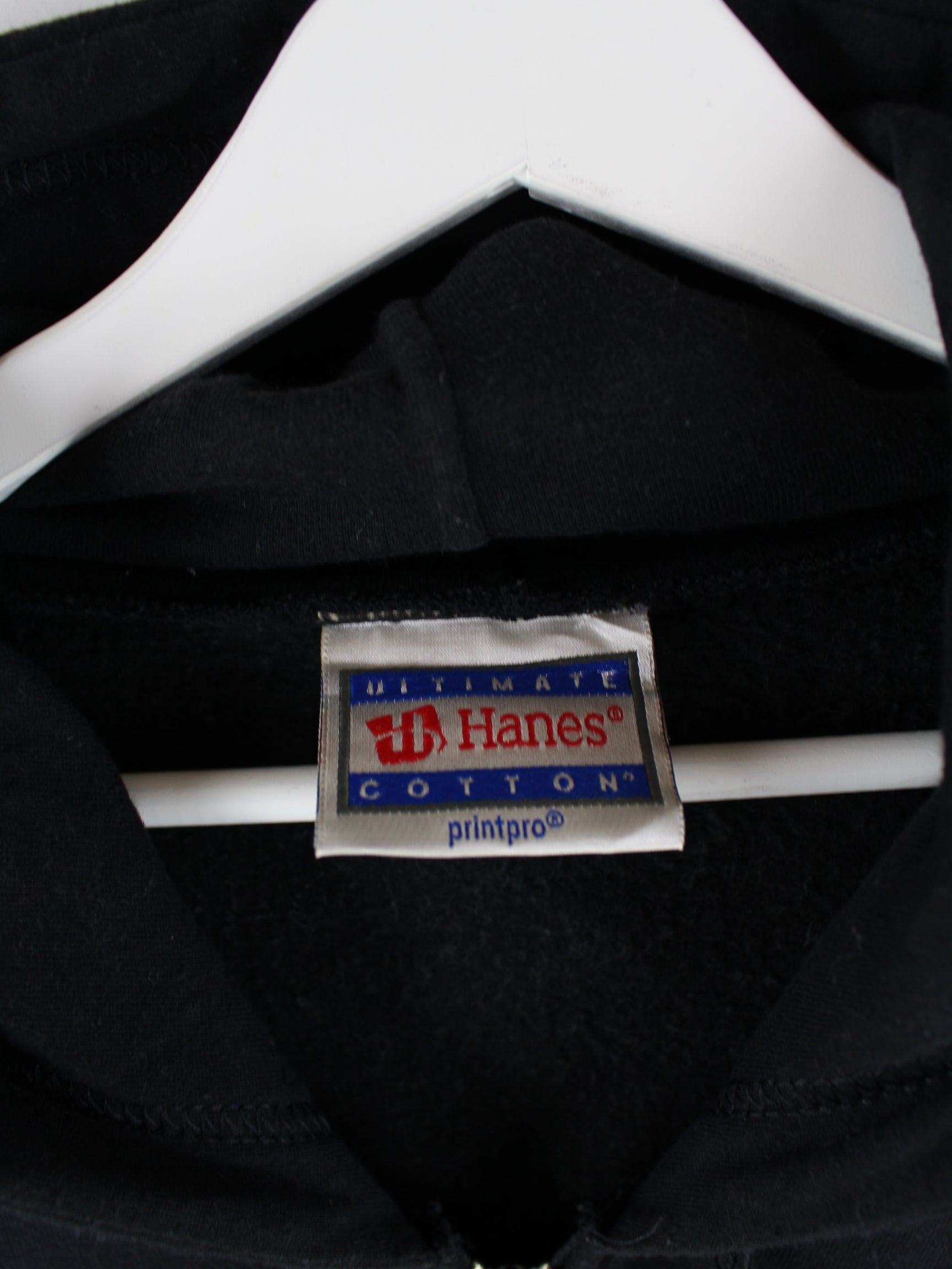 Schwarzer Hoodie mit langem Reißverschluß aus dem Hause Hanes aus den 90'ern in Größe XXL. Er ist aus einer Baumwollmischung hergestellt. Den Zustand würden wir als 'In Ordnung' bezeichnen (vergl. Bilder).Mit chiquem Skull Print.
