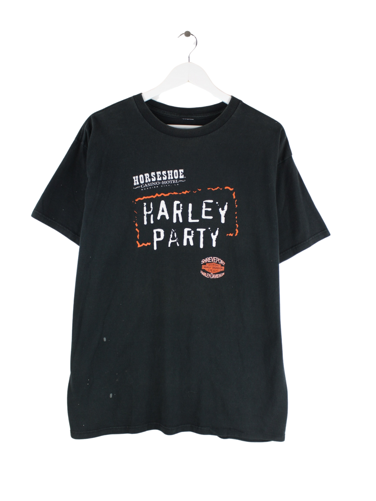 T-Shirt aus dem Hause Harley Davidson in Größe XL. Es ist aus Baumwolle angefertigt und in Schwarz auf Lager. Mit schickem Party Print.