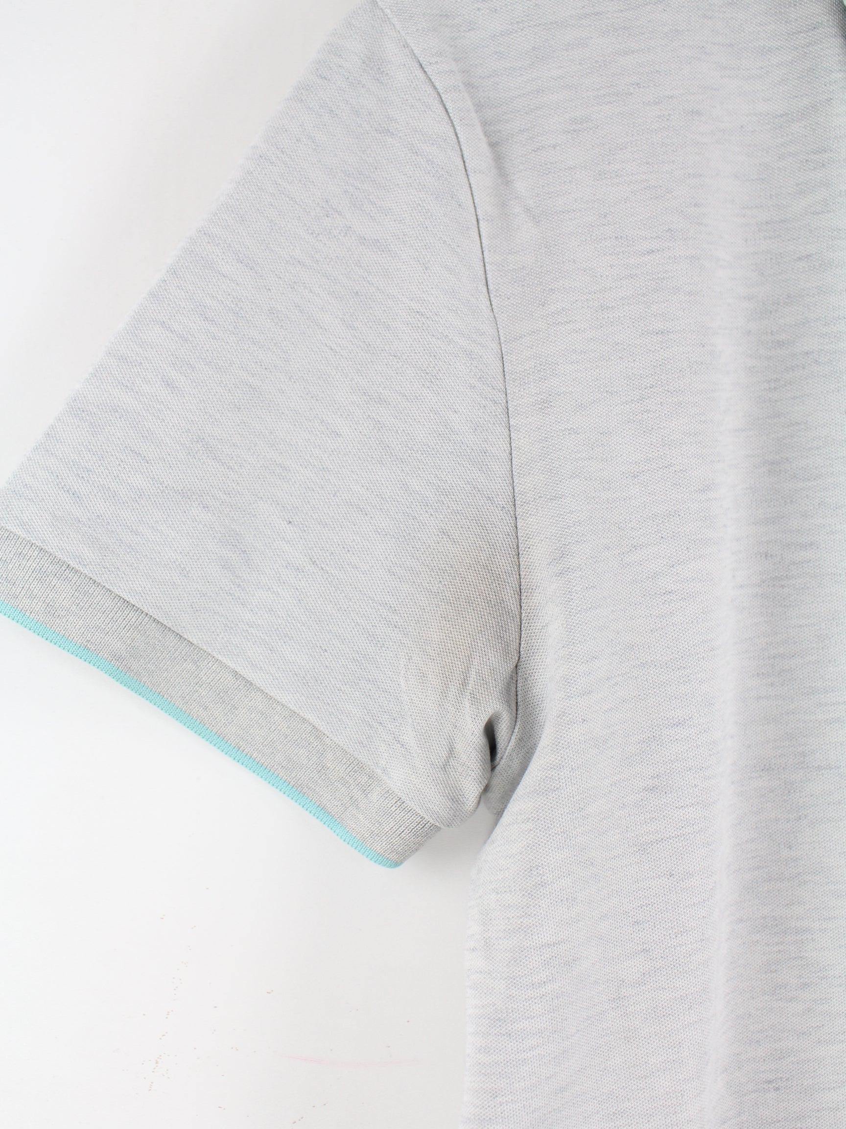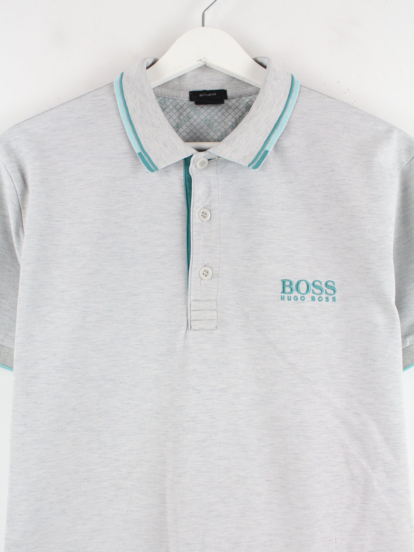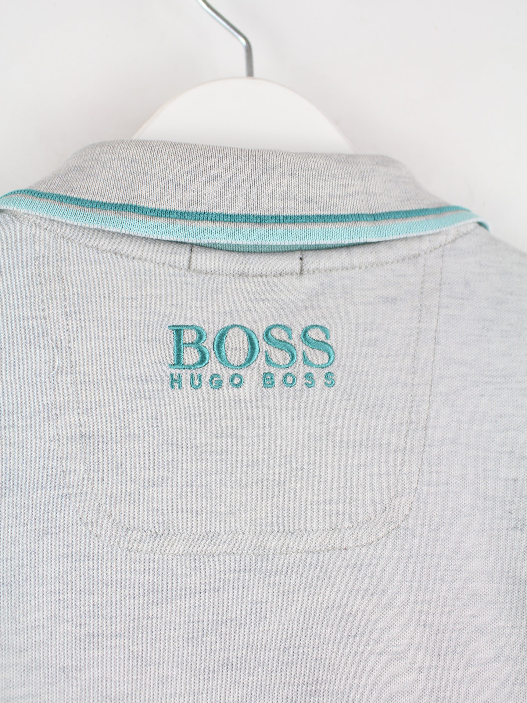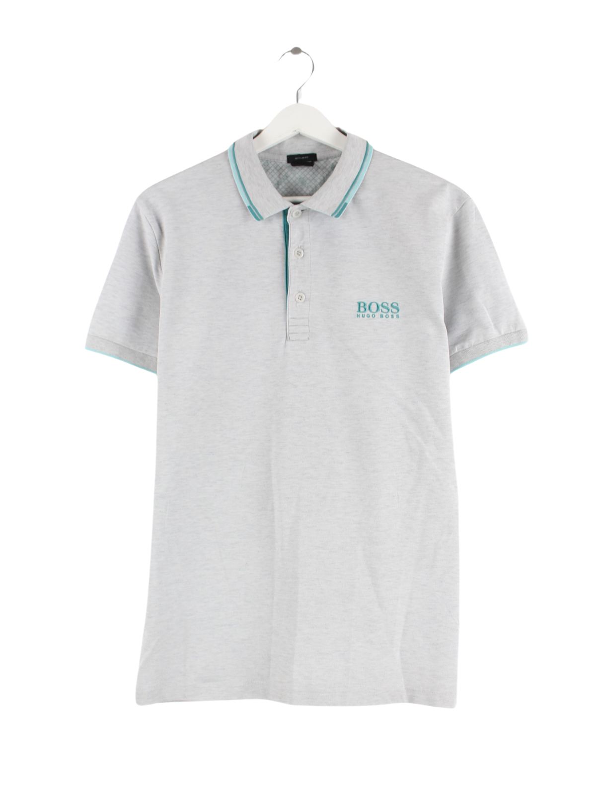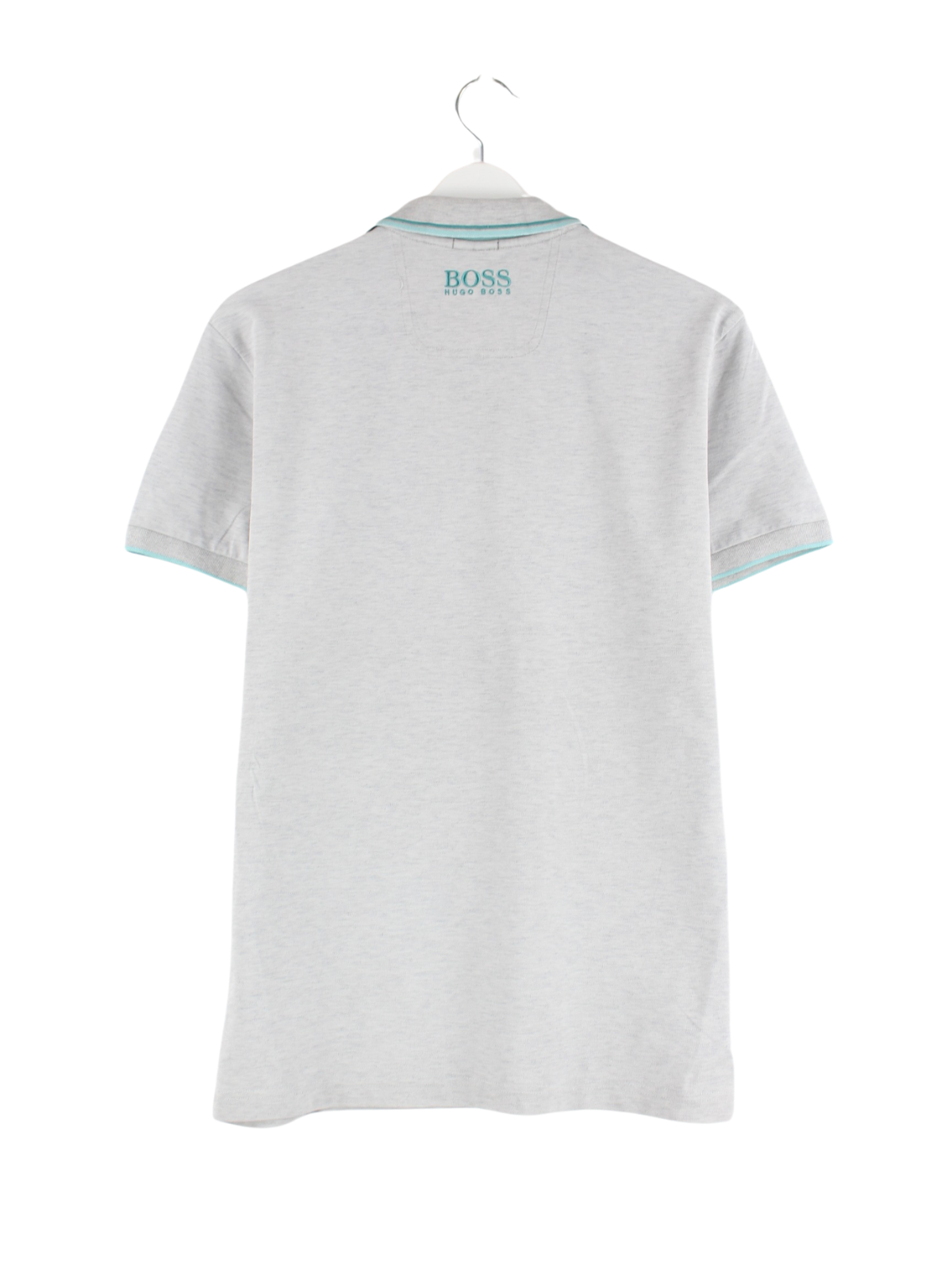 Poloshirt der Marke Hugo Boss mit Stick in Größe S. Es ist aus einer Baumwollmischung gefertigt und in Grau zu bekommen.