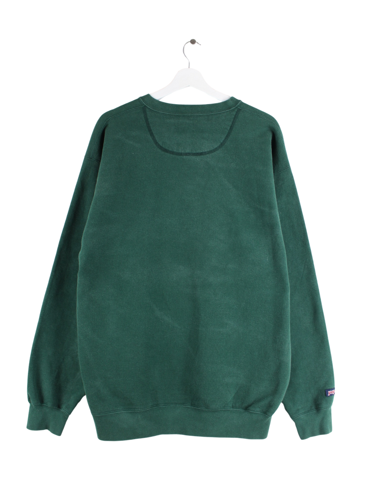 Grüner Sweater mit gestickten Motiven vom Brand Jansport aus den 90'ern in Größe L. Er ist aus einer Baumwollmischung produziert. Den Zustand würden wir als 'In Ordnung' bezeichnen (vergl. Bilder).