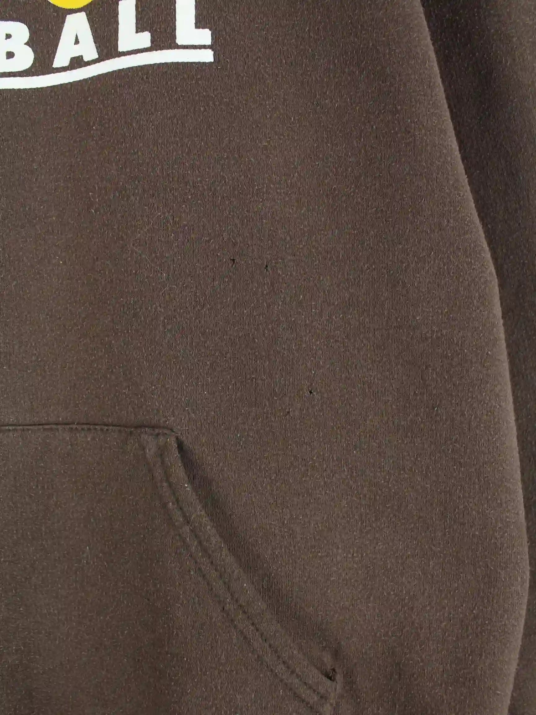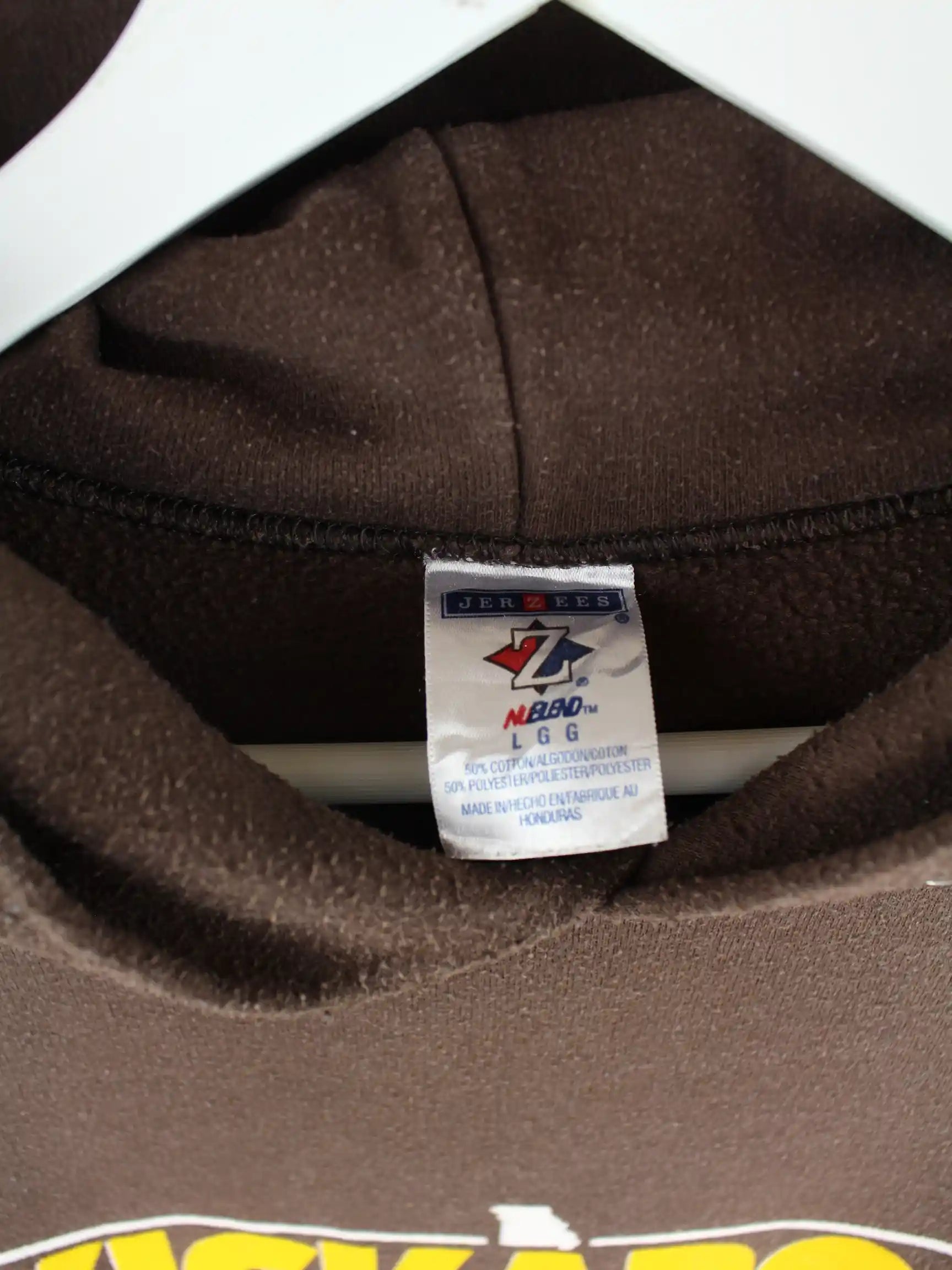 Brauner Hoodie der Marke Jerzees in Größe L. Er ist aus einer Baumwollmischung gefertigt. Den Zustand würden wir als 'In Ordnung' bezeichnen (vergl. Bilder).Mit tollem Basketball Print.