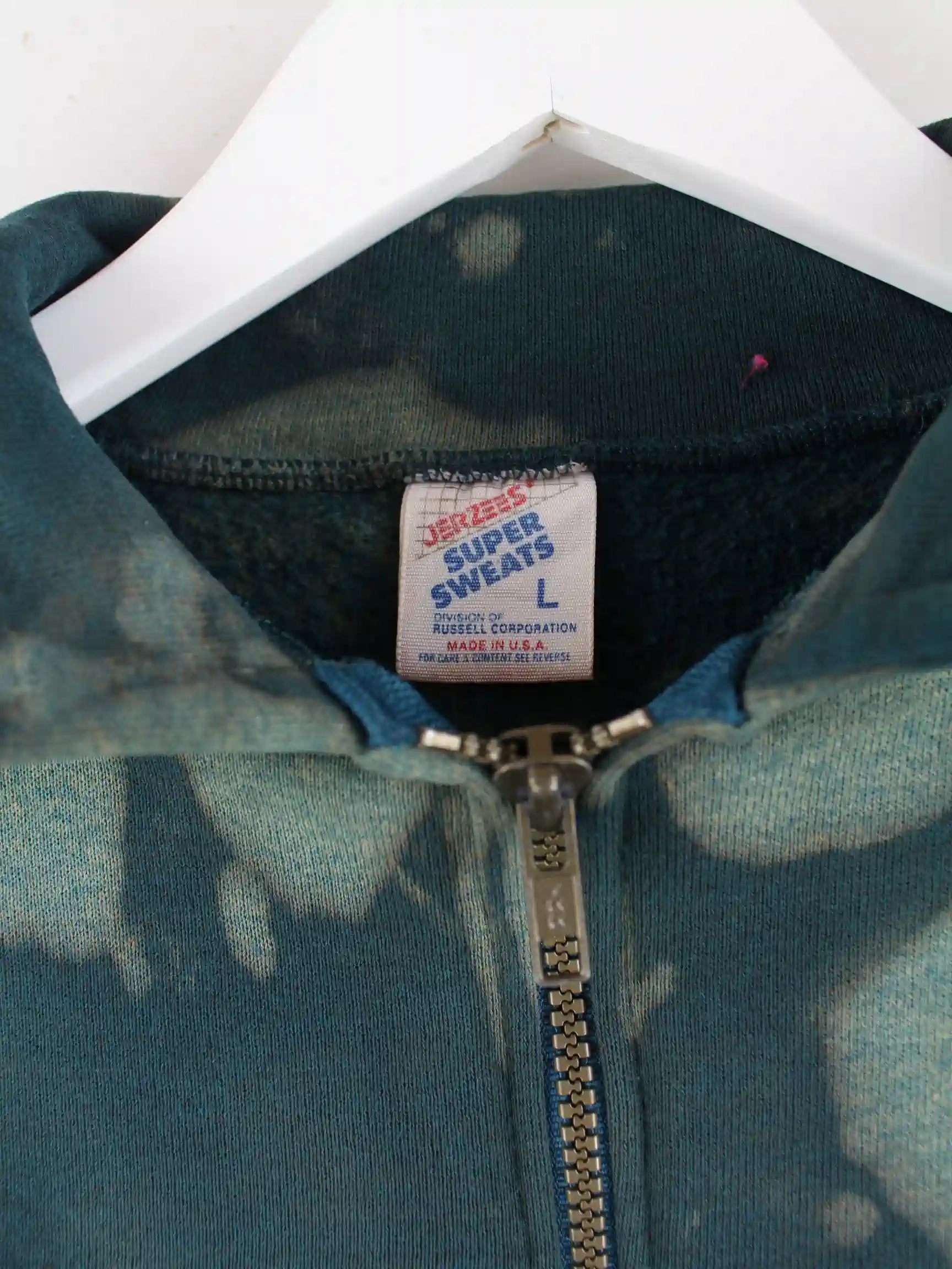 Sweater aus dem Hause Jerzees mit kurzem Reißverschluß in Größe L aus den 90'ern. Er ist aus einer Baumwollmischung und in Grün zu bekommen.