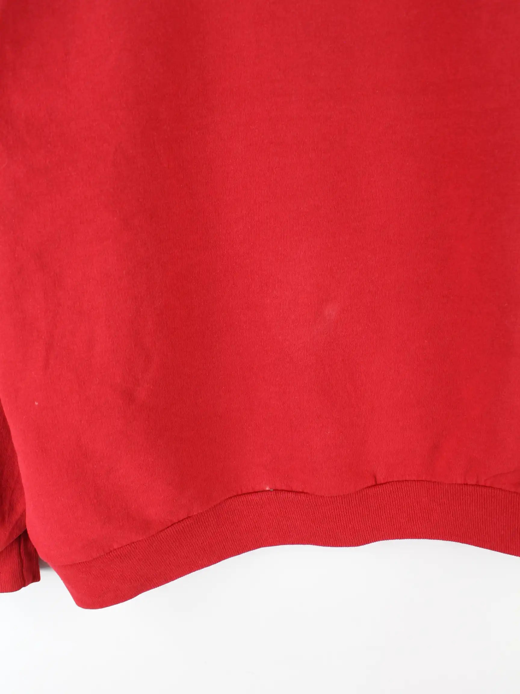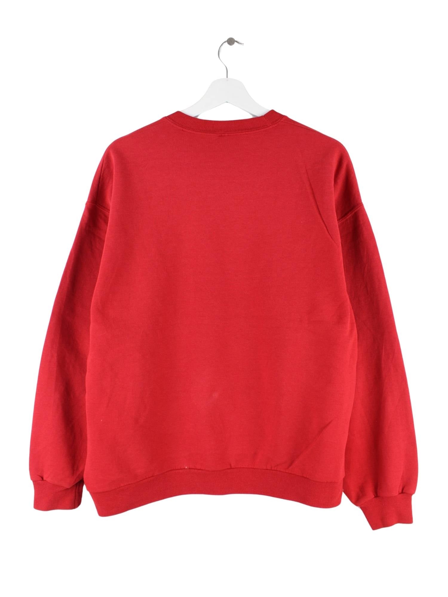 Roter Sweater mit Stickereien der Marke Jerzees aus den 90'ern in Größe L. Er ist aus einer Baumwollmischung produziert und in gutem Zustand bei uns vorrätig.