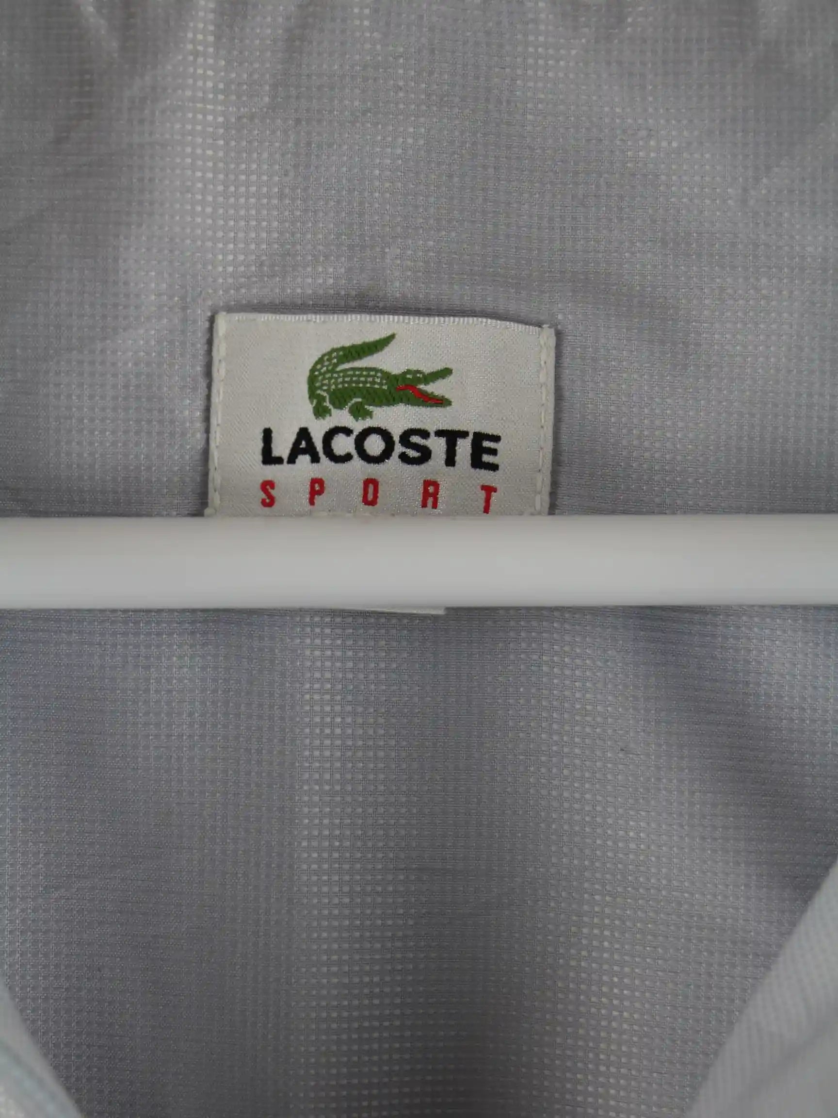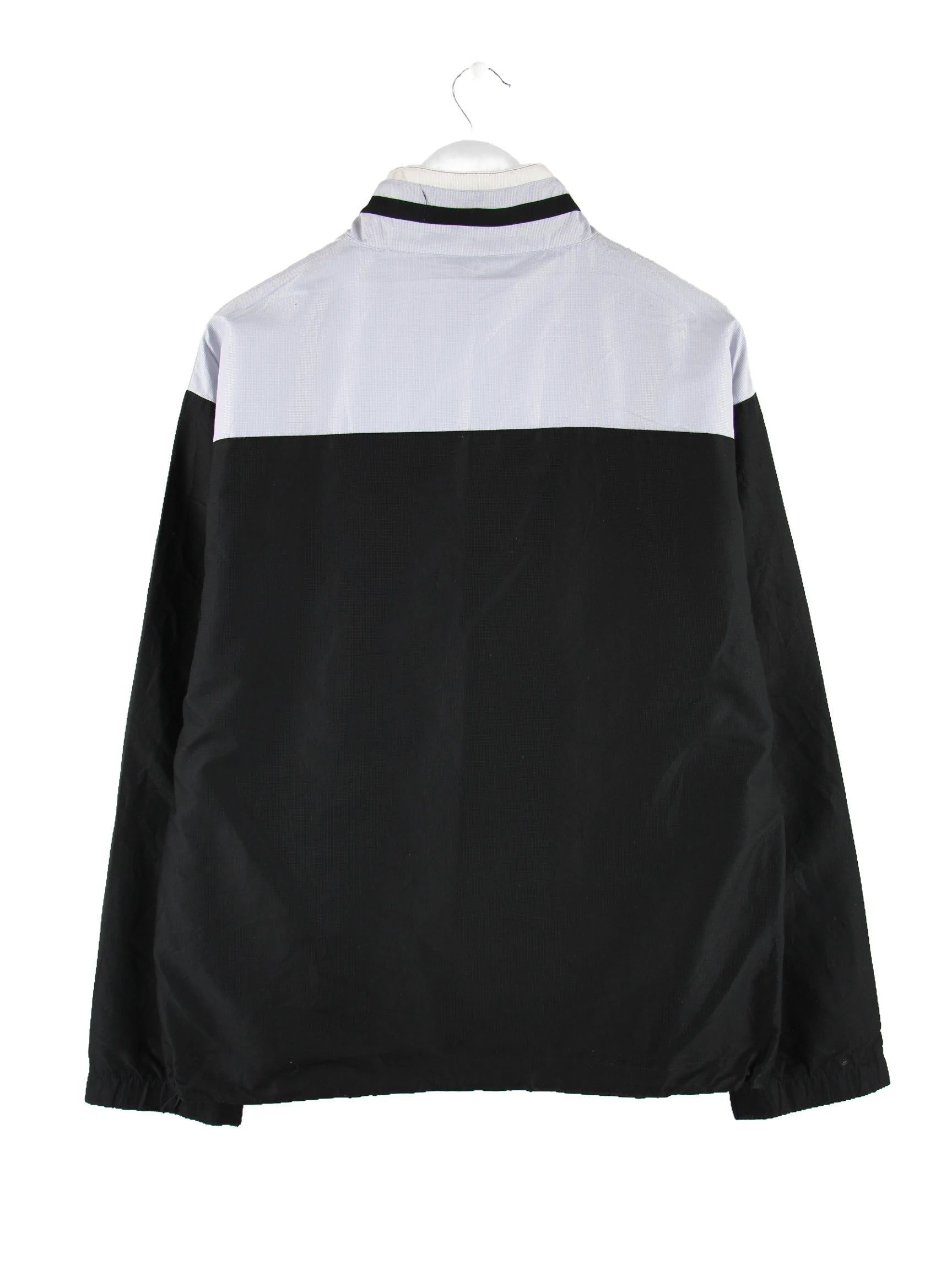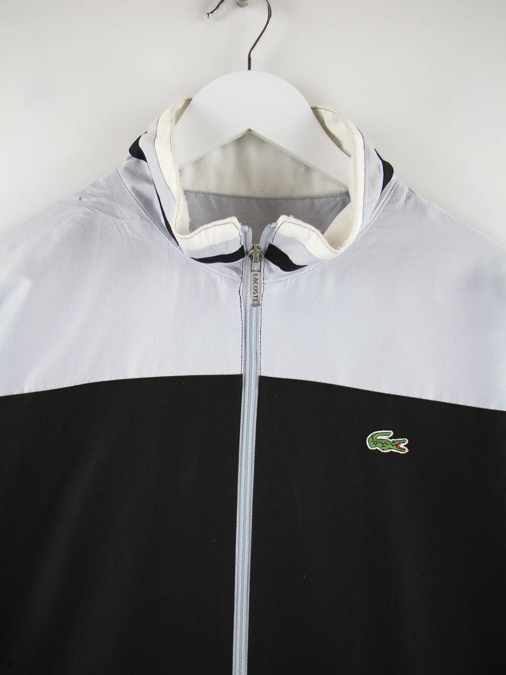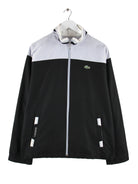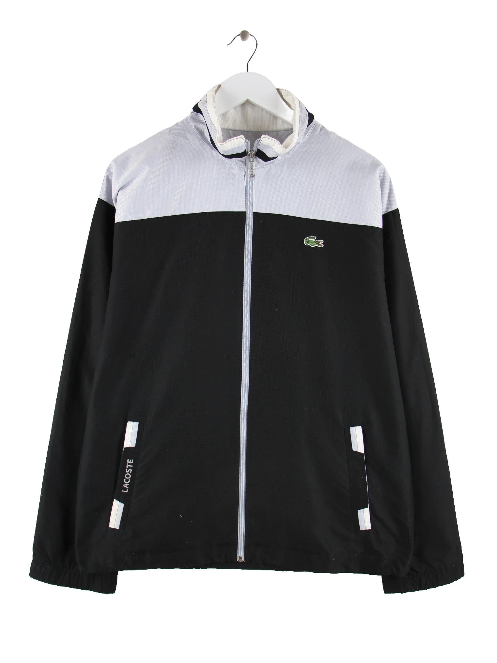 Schwarze Trainingsjacke der Brand Lacoste in Größe M. Sie ist aus Synthetik hergestellt und in gutem Zustand bei uns zu bekommen.