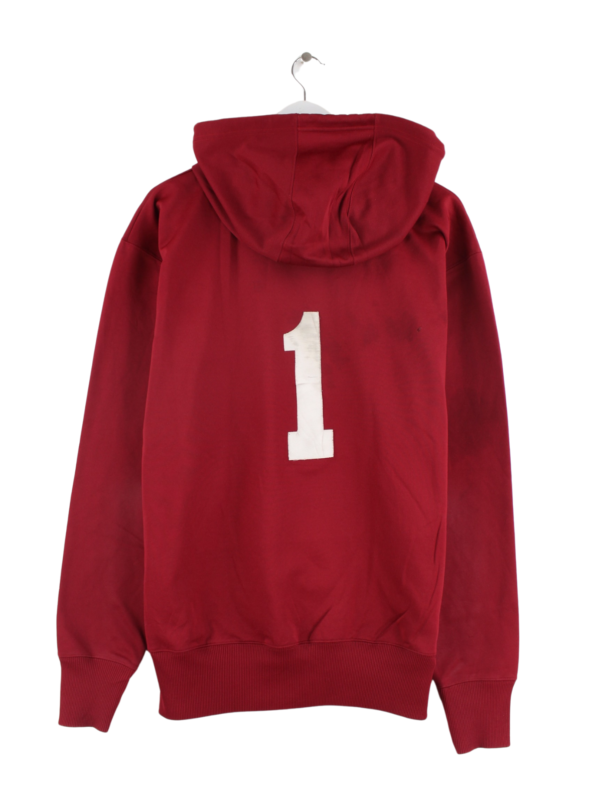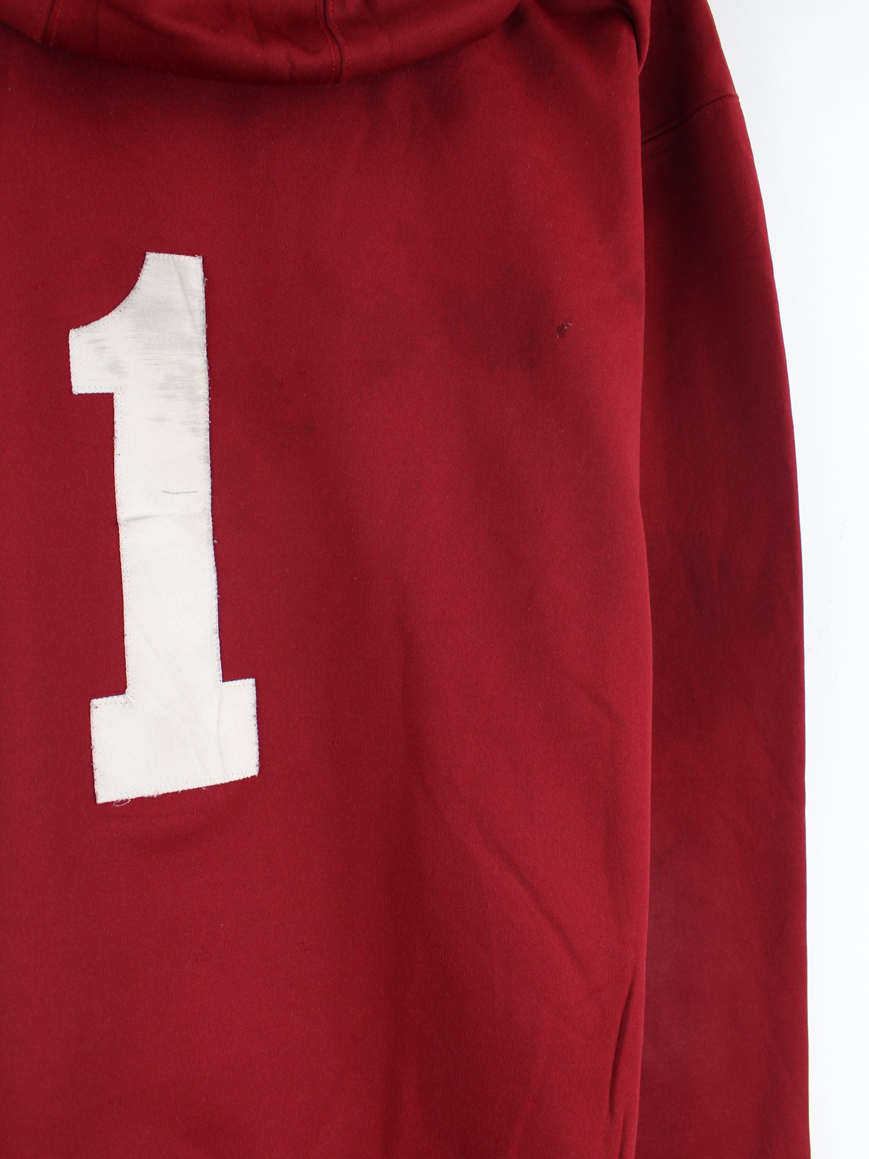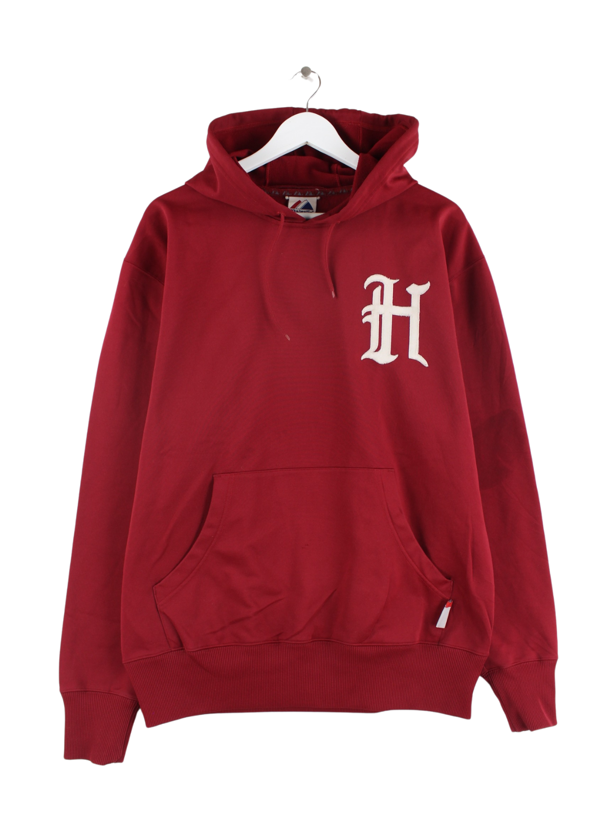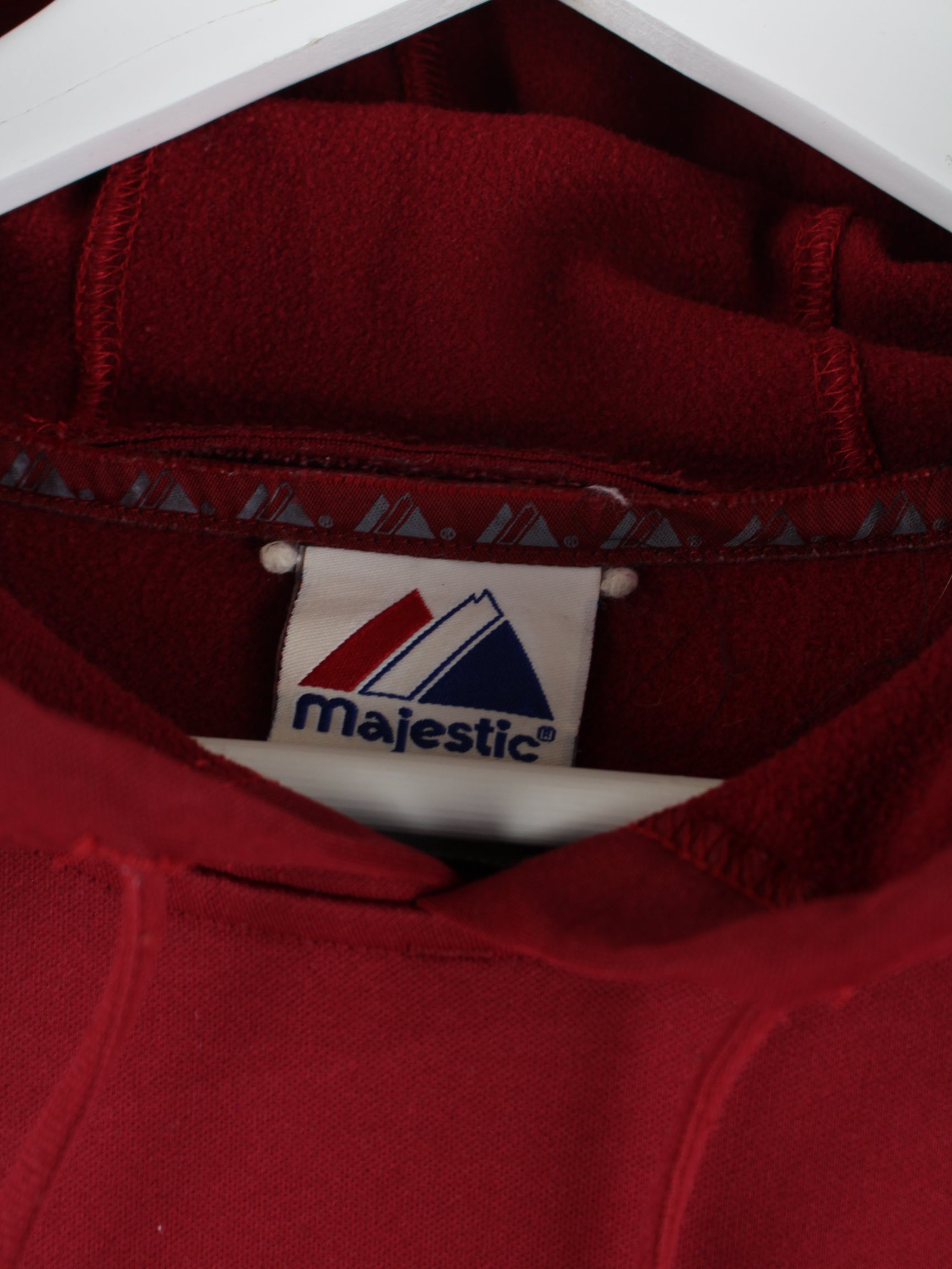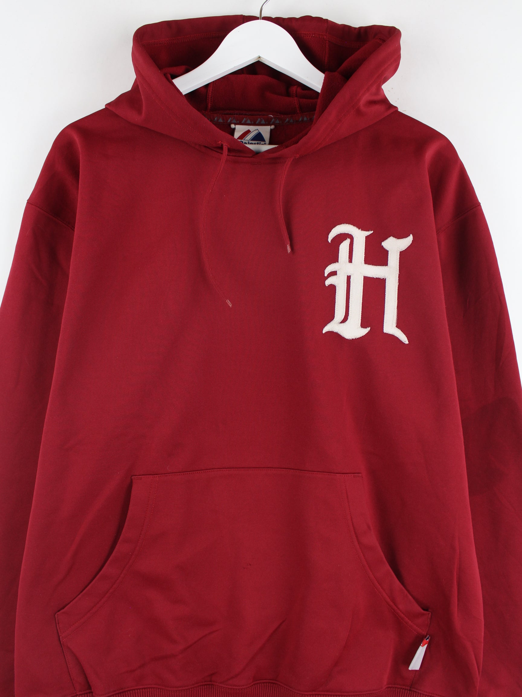 Roter Hoodie mit gestickten Motiven aus dem Hause Majestic in Größe XL. Er ist aus einer Baumwollmischung gemacht. Den Zustand würden wir als 'In Ordnung' bezeichnen (vergl. Bilder).