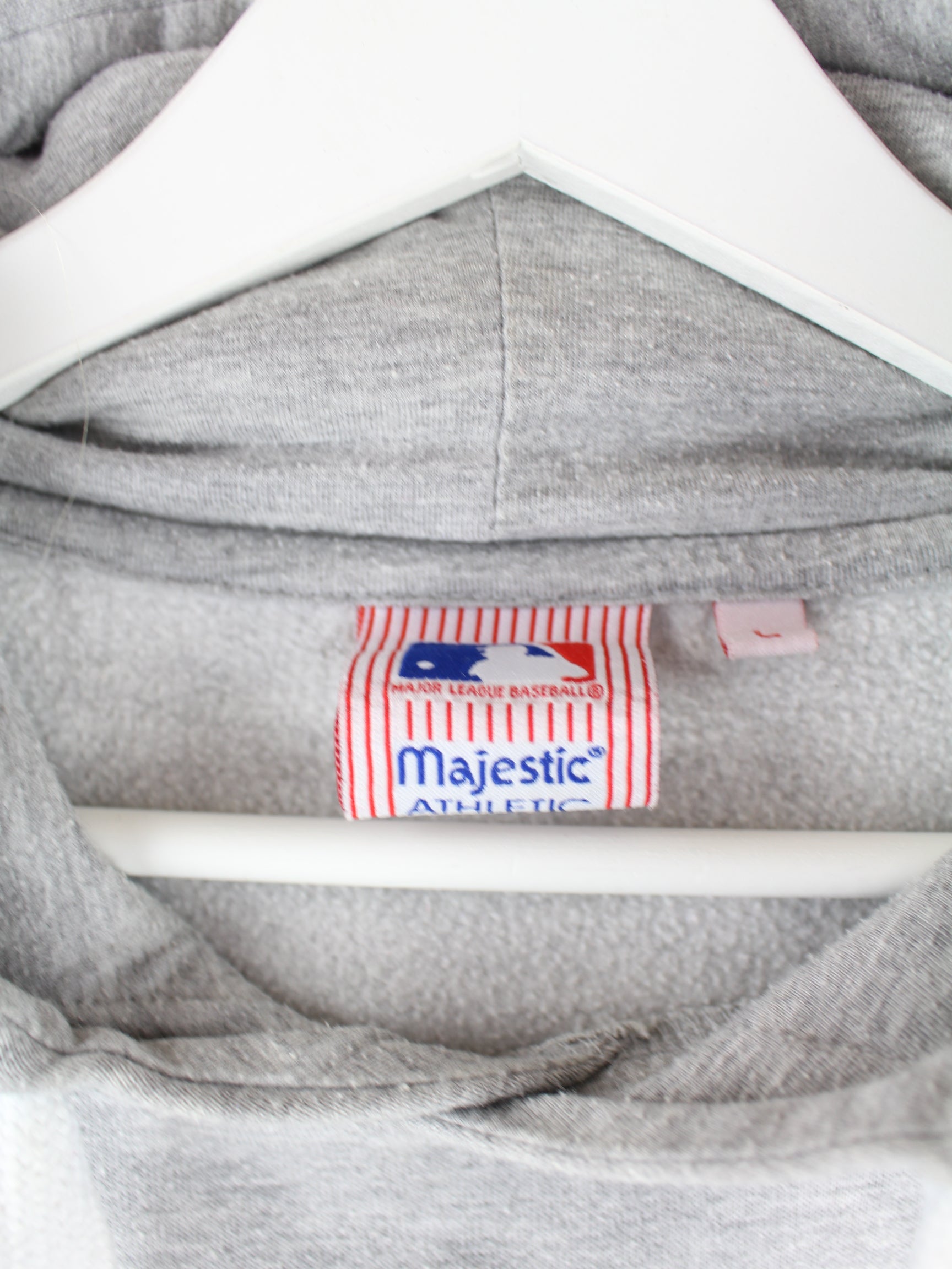 Hoodie from Majestic with embroidery in size L. It is made from a cotton blend and comes in grey.