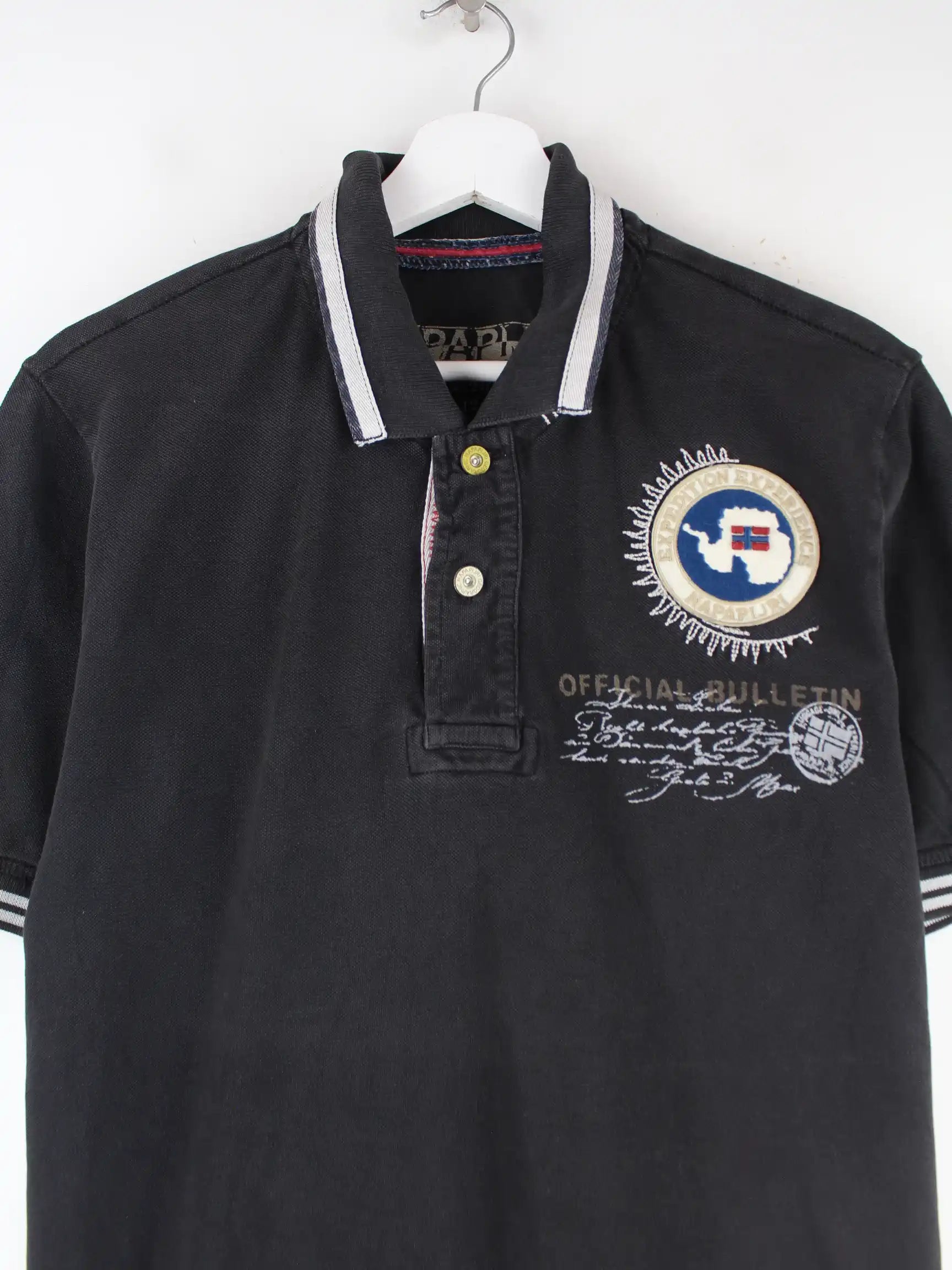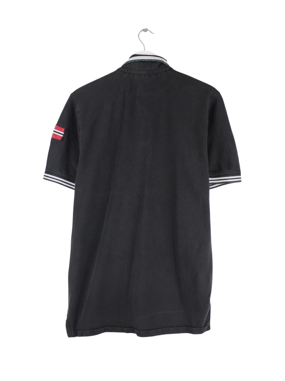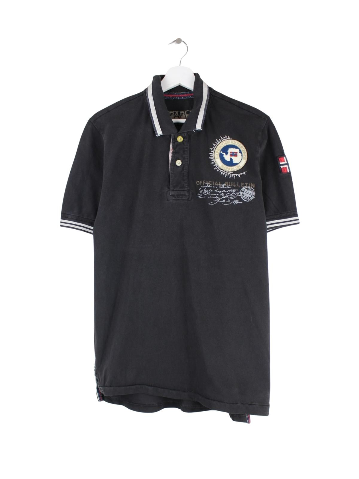 Schwarzes Poloshirt mit Stickereien aus dem Hause Napapjiri in Größe M. Es ist aus Baumwolle und in gutem Zustand bei uns zu bekommen.