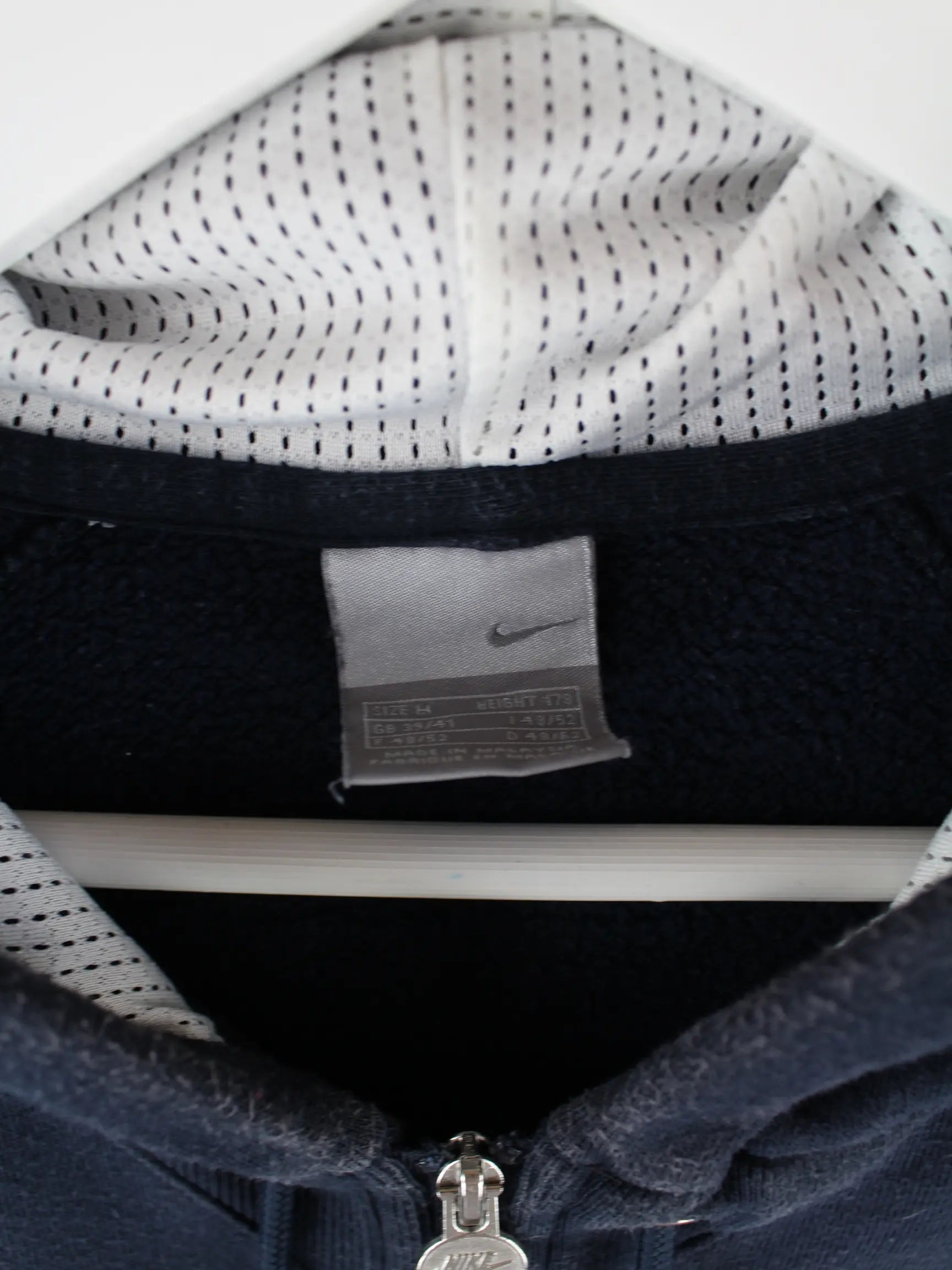Schwarzer Hoodie mit gestickten Motiven und Reißverschluß aus dem Hause Nike in Größe M. Er ist aus einer Baumwollmischung angefertigt und in gutem Zustand auf Lager.