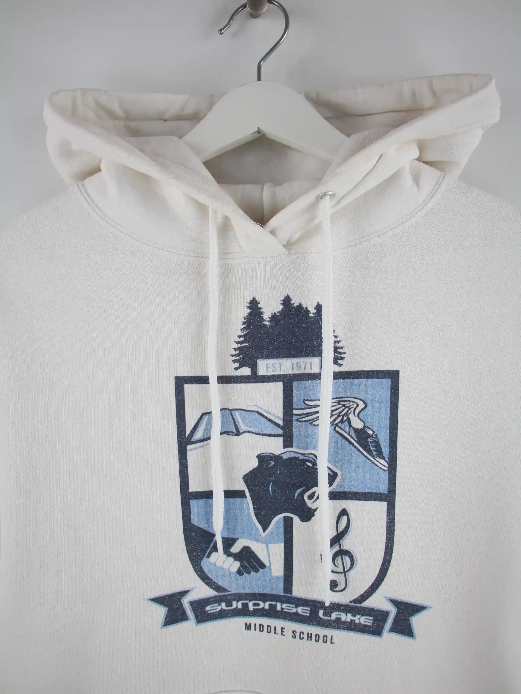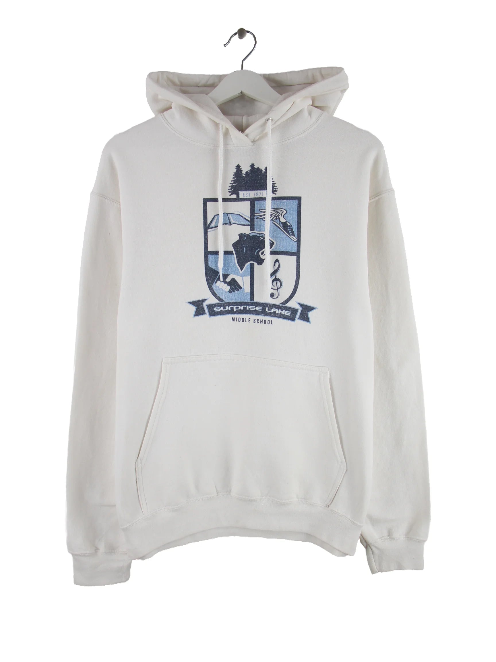 Weißer Hoodie des Labels Port & Company in Größe M. Er ist aus einer Baumwollmischung hergestellt und in gutem Zustand bei uns zu bekommen. Mit schönem Lake Print.
