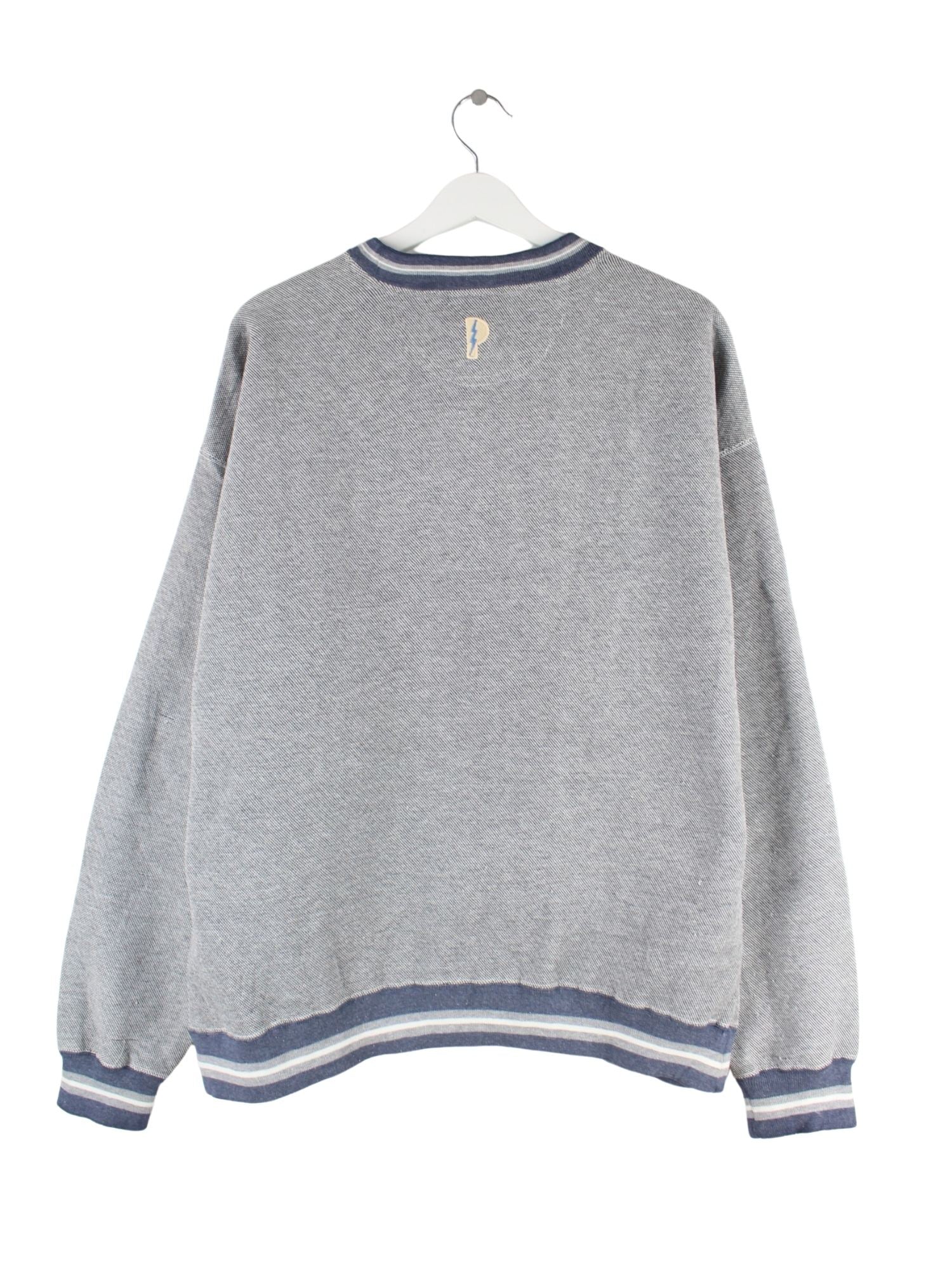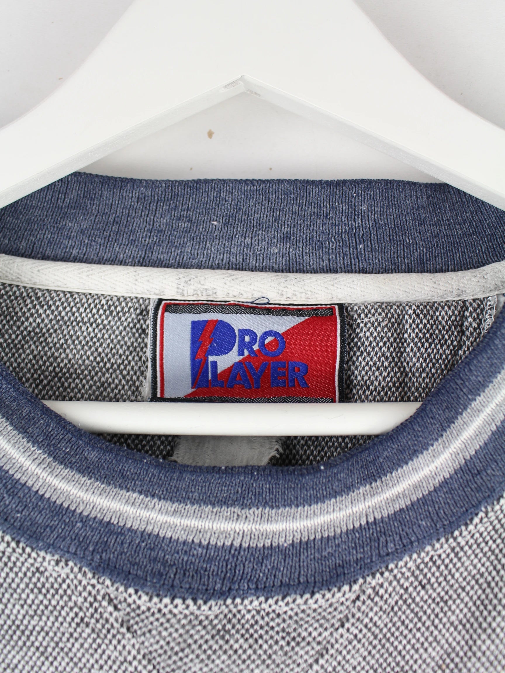 Sweater des Labels Pro Player mit gesticktem Logo in Größe XL aus den 90'ern. Er ist aus einer Baumwollmischung gemacht und in Grau bei uns vorrätig.