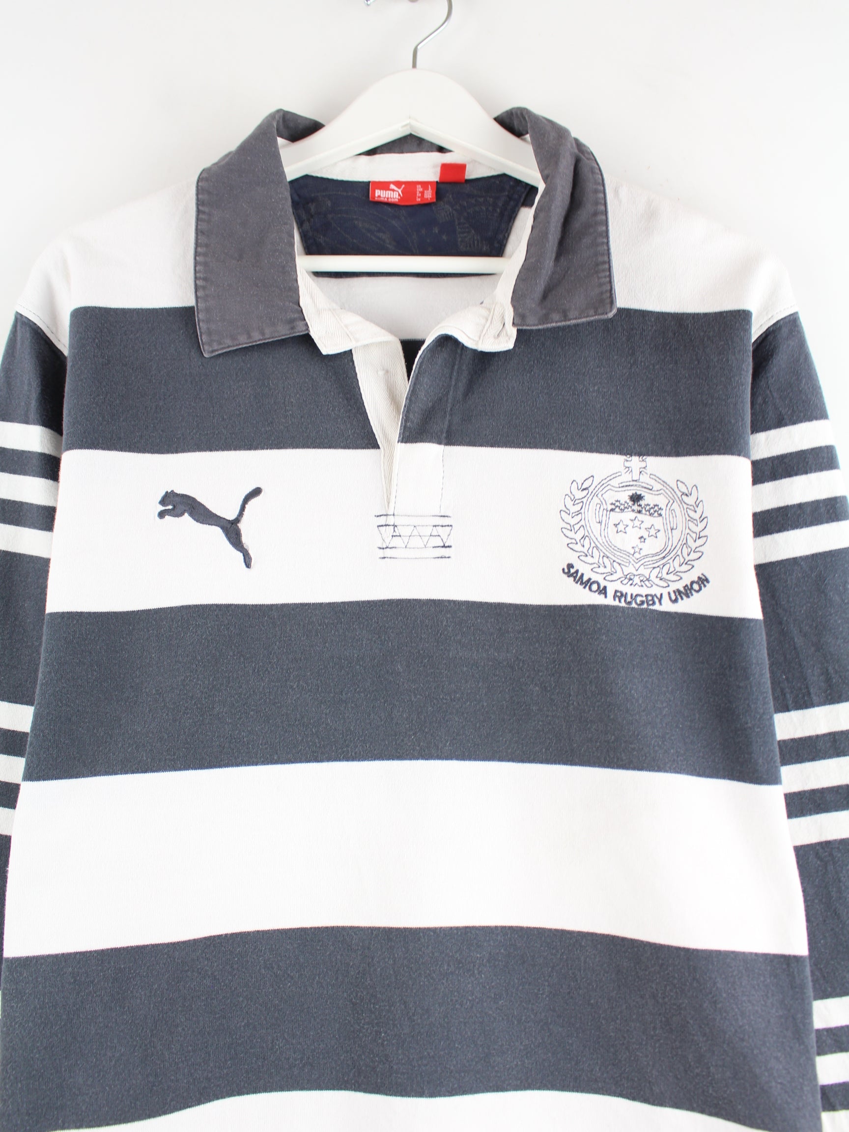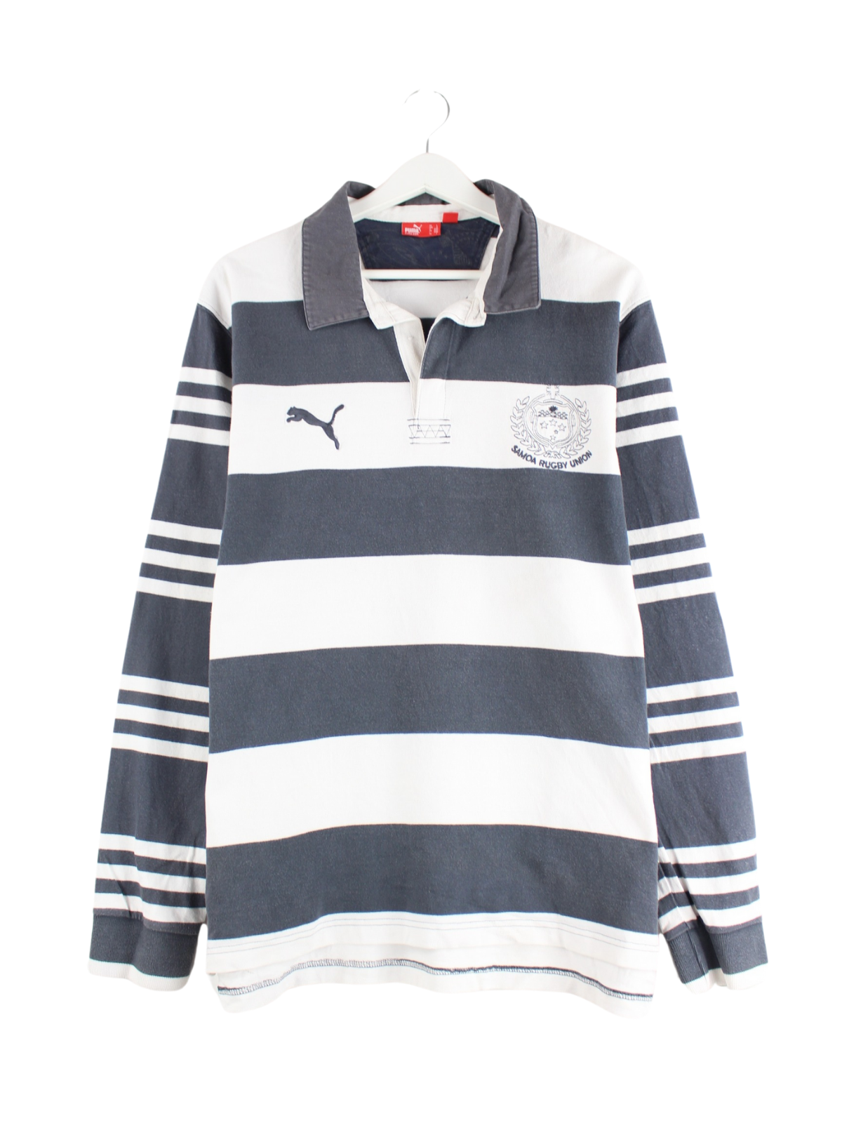 Polo shirt from the label Puma in size L. It is made of cotton and has grey and white stripes.