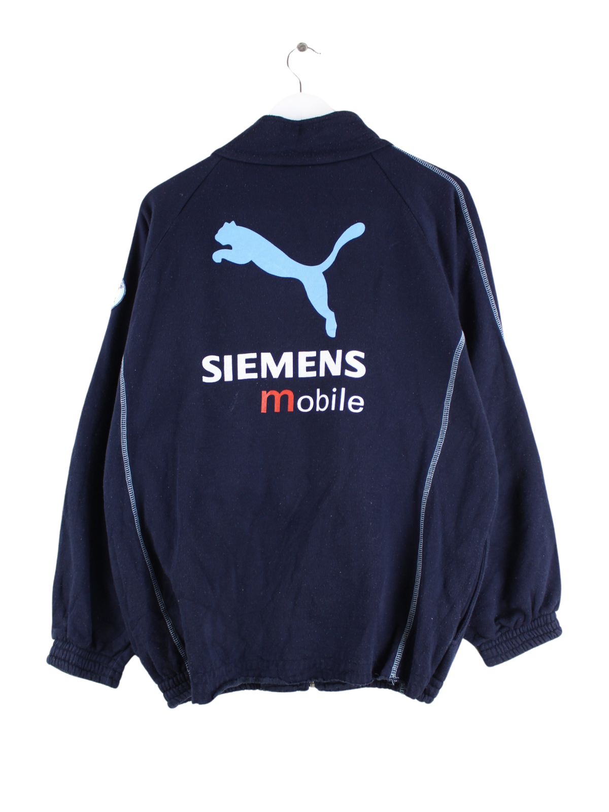 Training jacket from the Puma label in size M from the early 2000s. It is made of synthetic material and is available from us in blue.